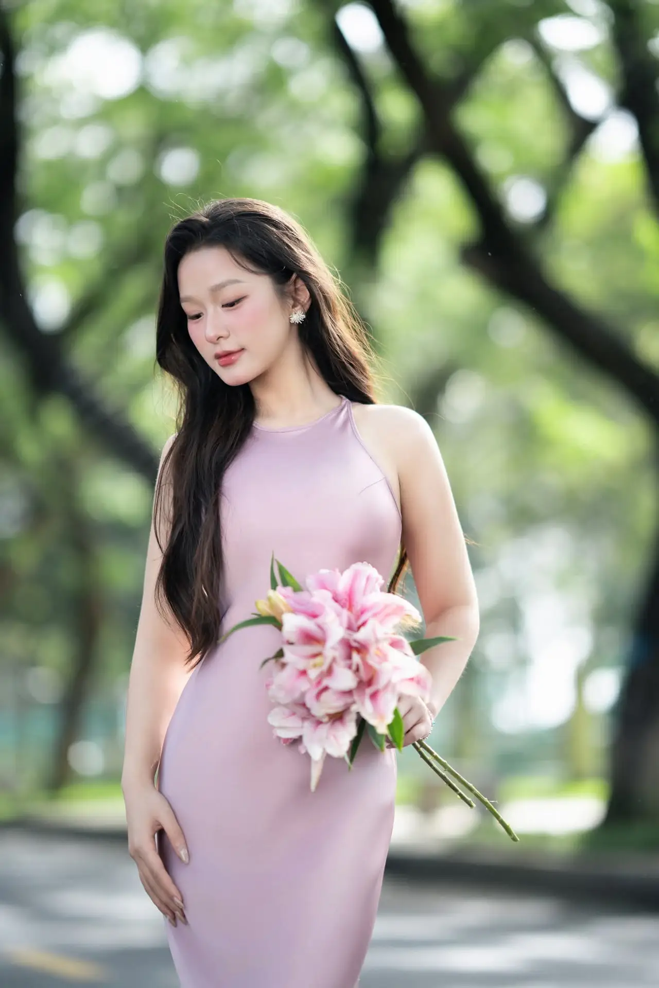 This image beautifully captures the elegant charm of an Asian woman in a modern Ao Dai with exquisite patterns She stands by a tranquil lake creating a peaceful and poetic scene Her gaze is directed into the distance as if contemplating something profound Her neatly tied hair and pearl earrings enhance her graceful and refined look The pink outfit combined with soft floral patterns accentuates her slender figure and gentle demeanor She holds a small bouquet of flowers as if embracing the beauty of nature and a pure soul This is a moment where the woman blends seamlessly with the natural scenery bringing a sense of relaxation and peace#AsianBeauty #Modern #AoDai #ElegantWoman #VietnameseCulture #LakesideSerenity