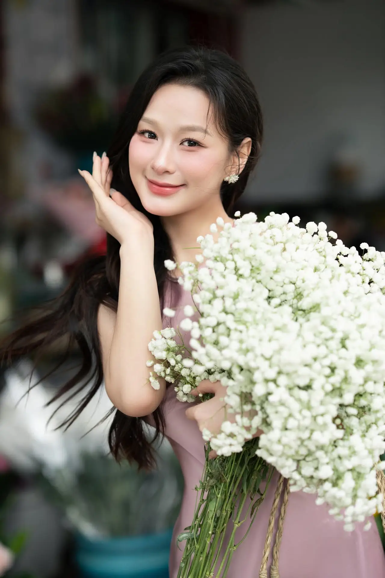 This captivating image portrays a young East Asian woman exuding gentle and refined beauty, with a distinctly classic appeal. She is gracefully adorned in a soft pastel pink traditional outfit, highlighting her elegance and timeless charm. Her hair, styled in an elegant bun, is subtly embellished with small flowers, perfectly complementing the fresh floral arrangement she delicately holds. The light pink and yellow blossoms add a touch of sophistication and purity to the entire frame, creating a harmonious composition. Her contemplative gaze radiates peace and profound serenity, crafting an artistic moment full of emotion. This is an ideal image for those who appreciate traditional beauty, elegance, and the graceful allure of Asian women.#AsianBeauty #TraditionalAttire #ElegantWoman #FreshFlowers #ArtisticPhotography #AoDai #Vietnamese