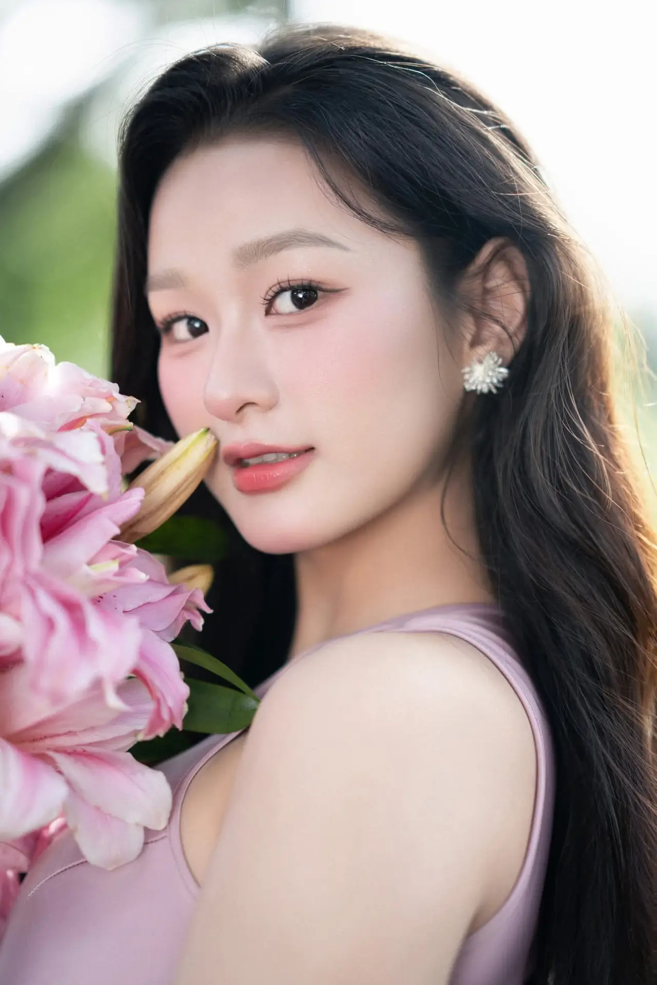 Elegant Asian Charm: Serene Young Woman in Traditional Pink Attire with Delicate Fresh Flowers