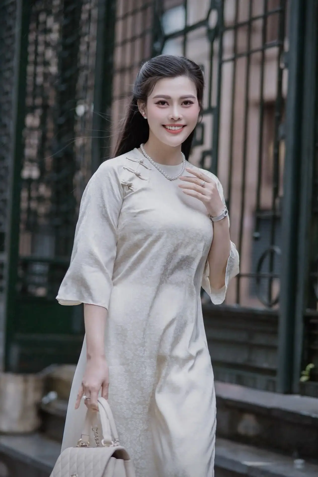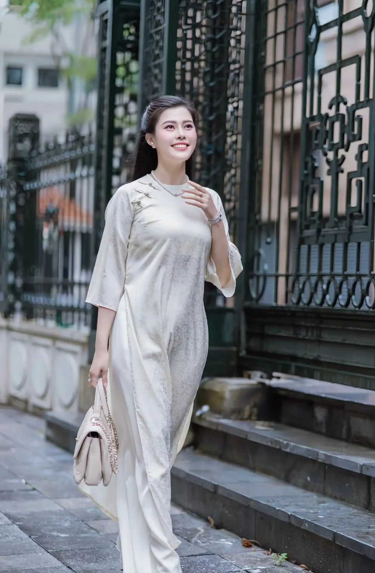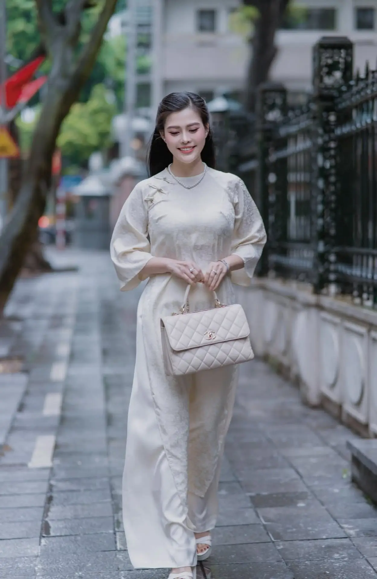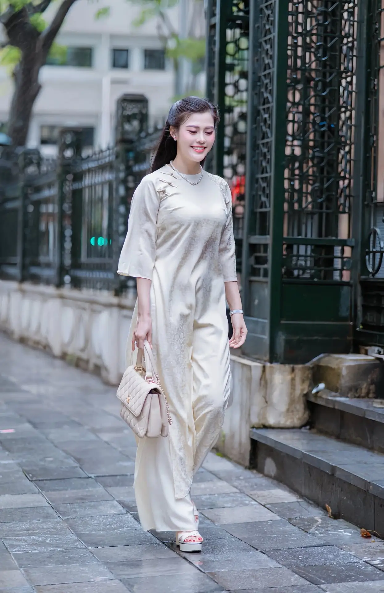 The VGU No162 image beautifully captures a young Vietnamese woman gracefully walking in a modern ao dai. Her gentle steps on the urban street exude an elegant and refined beauty. The sophisticated cream-colored ao dai paired with a matching handbag not only flatters her figure but also highlights her luxurious fashion sense. Her charming smile harmonizes with the city backdrop creating a picturesque scene that beautifully merges traditional aesthetics with contemporary life. This portrayal embodies the confidence and timeless allure of Vietnamese women showcasing their ability to radiate beauty and style in any setting.#AoDai #Vietnamese #Fashion #Elegant