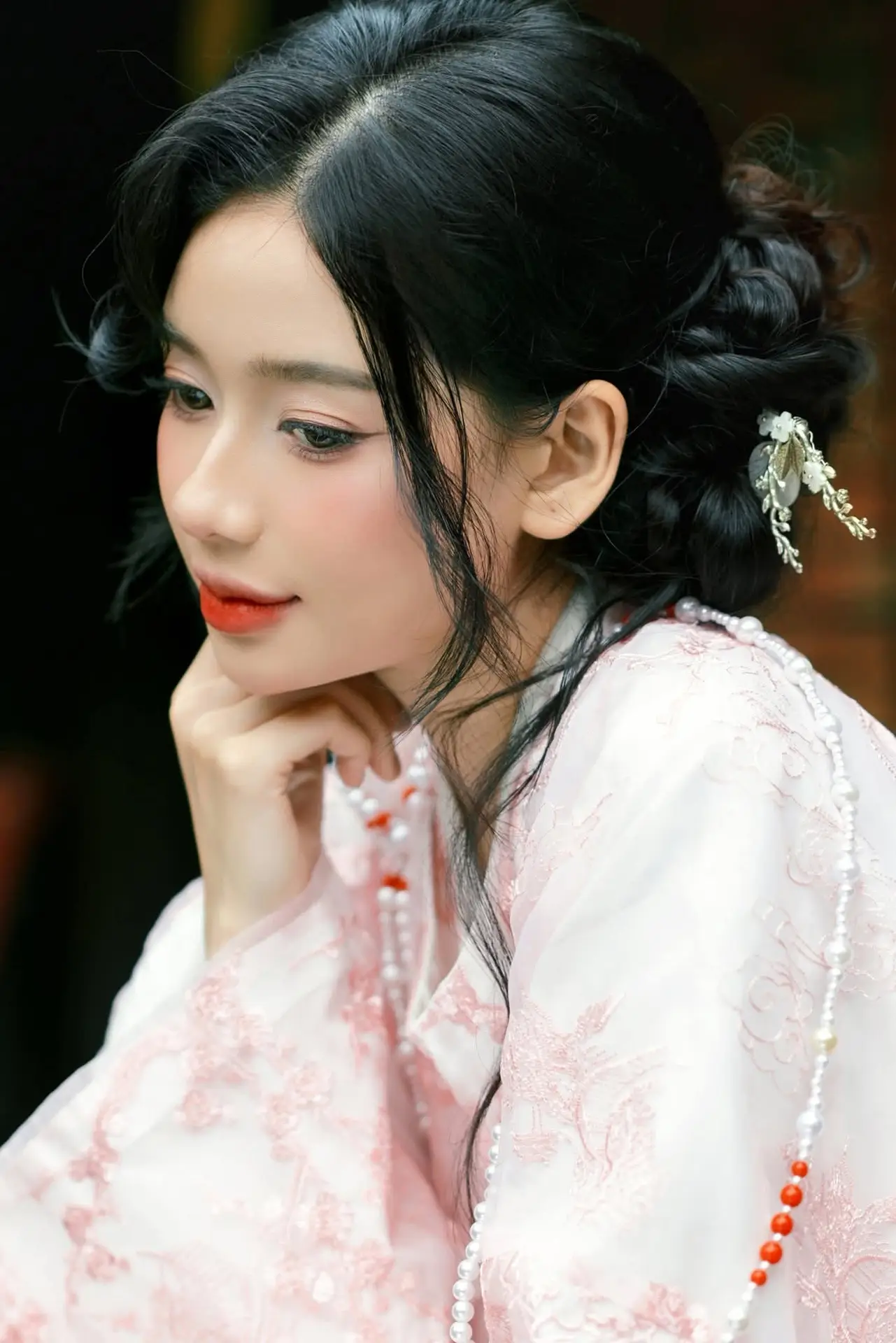 The image VGU No.107 beautifully captures an Asian muse with a delicate, gentle, and utterly captivating charm. The young woman is adorned in an outfit inspired by traditional aesthetics, featuring soft pastel pink layers complemented by a pure white sheer shawl, creating an ensemble that is both graceful and elegant. Her flowing brown hair is subtly embellished with a pristine white flower, while a cherry blossom patterned paper fan held gently in her hand further enhances her classic and romantic allure. Her dreamy gaze, directed softly into the distance, suggests she is lost in poetic thought, evoking a sense of peace and enchantment. Her pure and ethereal beauty seems to blend seamlessly with the lush green backdrop, forging an artistic moment rich in emotion and captivating appeal, leaving viewers utterly mesmerized. #Vietnamese #pretty #charmVGU No.106: Elegant Vietnamese Woman in Red by Hoan Kiem Lake, Hanoi's Traditional Beauty