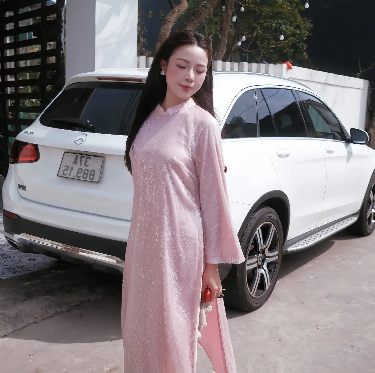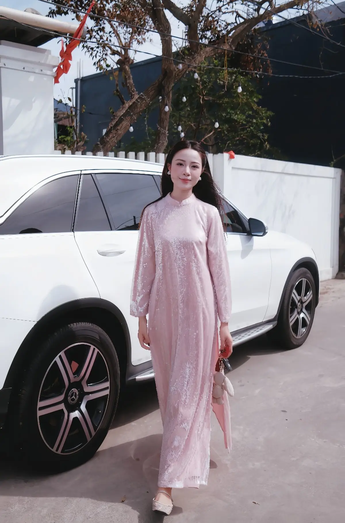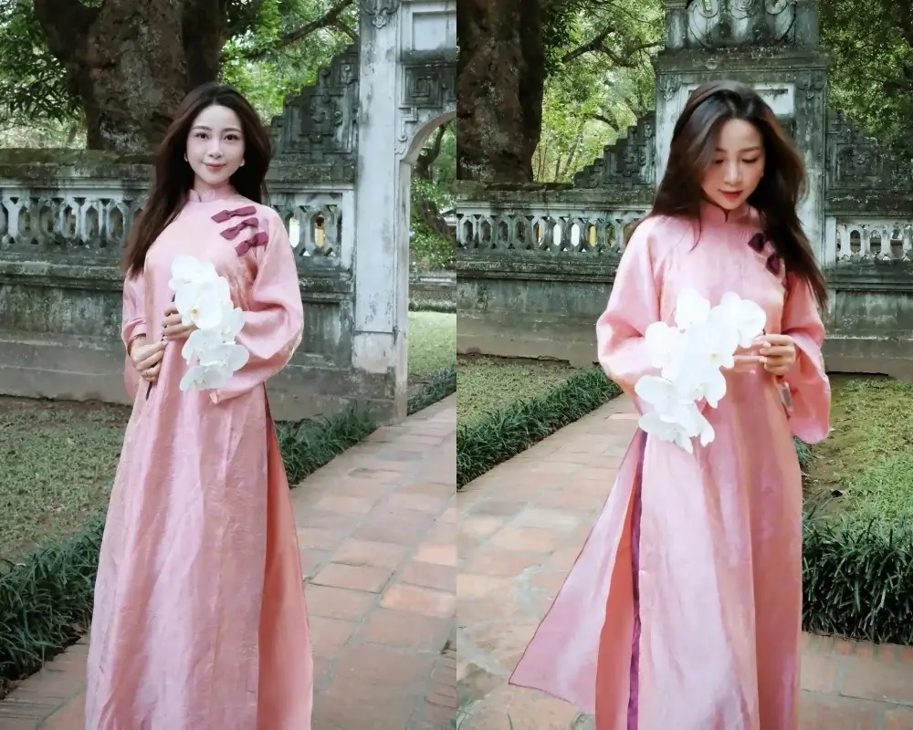 Vo Nhat Linh the wife of footballer Phan Van Duc captivates with her gentle and graceful beauty in a traditional Ao Dai. She appears in a soft pastel pink Ao Dai standing out against an ancient backdrop featuring moss-covered stone architecture. Every detail of the outfit combined with Nhat Linh's fluid posture creates a harmonious picture blending modern elegance with timeless cultural values. The flowing Ao Dai gently swaying in the breeze further accentuates her delicate and graceful presence. This image not only celebrates Nhat Linh's refined and pure beauty but also expresses a deep appreciation for the Ao Dai a symbol of Vietnamese women. It is a memorable moment that draws all eyes affirming her sophisticated style.#VoNhatLinh #AoDai #VietnameseBeauty #PhanVanDuc #TraditionalDress