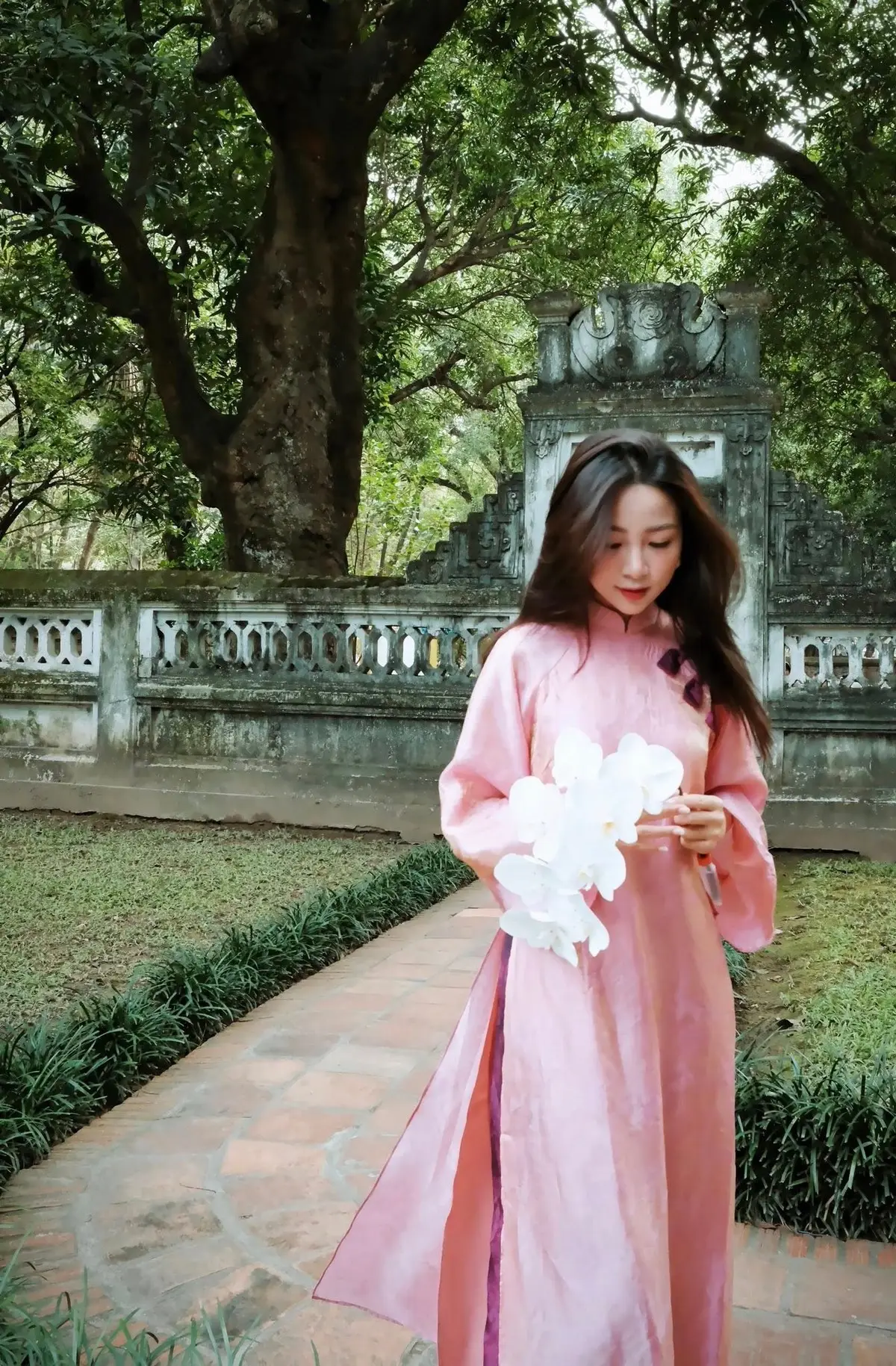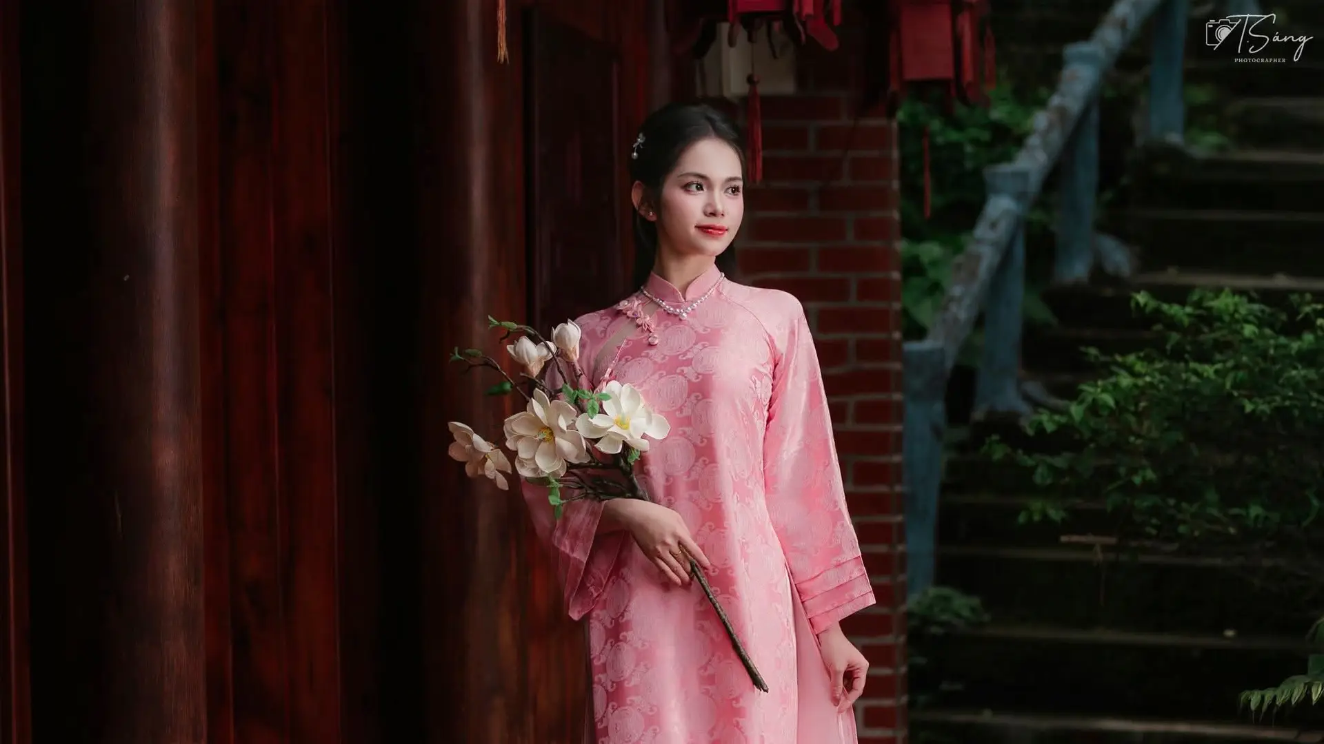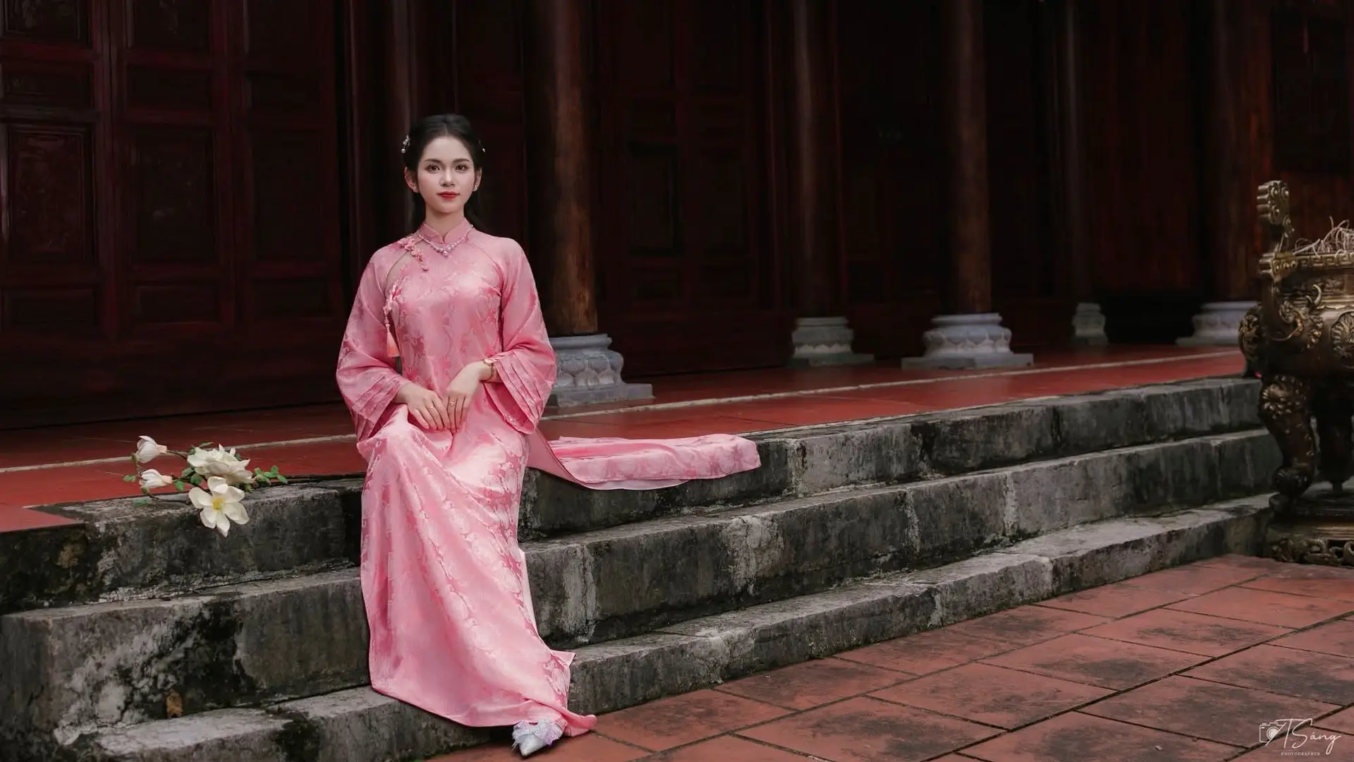 This stunning photograph captures a young Vietnamese woman in a soft pink Ao Dai standing gracefully amidst an ancient architectural setting Her elegant beauty complemented by the bouquet of flowers she holds blends perfectly with the solemn charm of moss-covered tiled roofs and traditional wooden pillars More than just a moment this image is a tender declaration of Vietnamese cultural beauty where the Ao Dai is not merely an attire but a symbol of grace elegance and national identity It evokes a sense of peace and nostalgia for precious traditional values#AoDaiVietnam #VietnameseCulture #TraditionalBeauty #VietnameseWoman #AncientArchitecture #AoDai