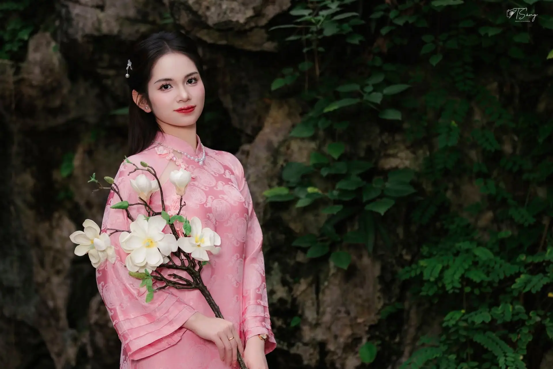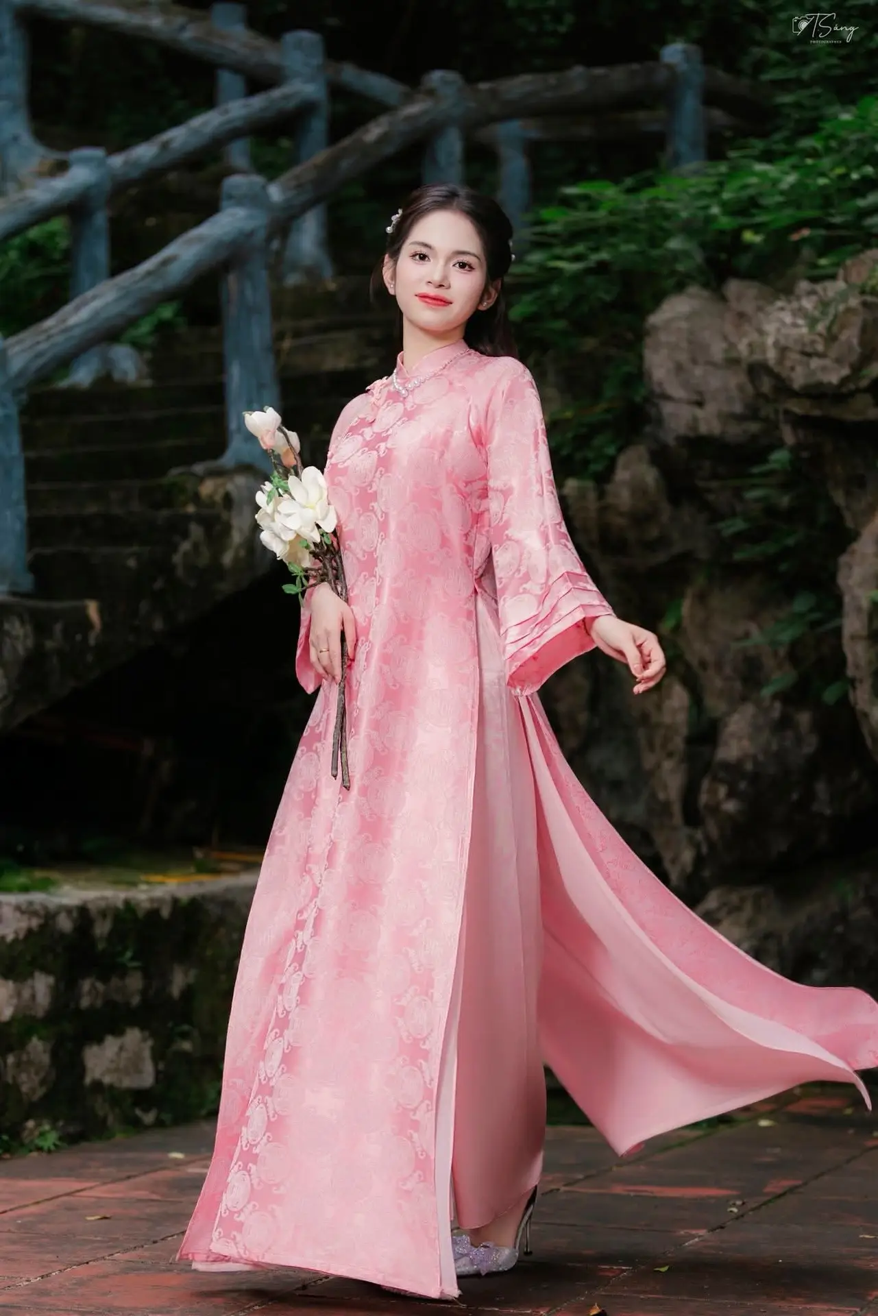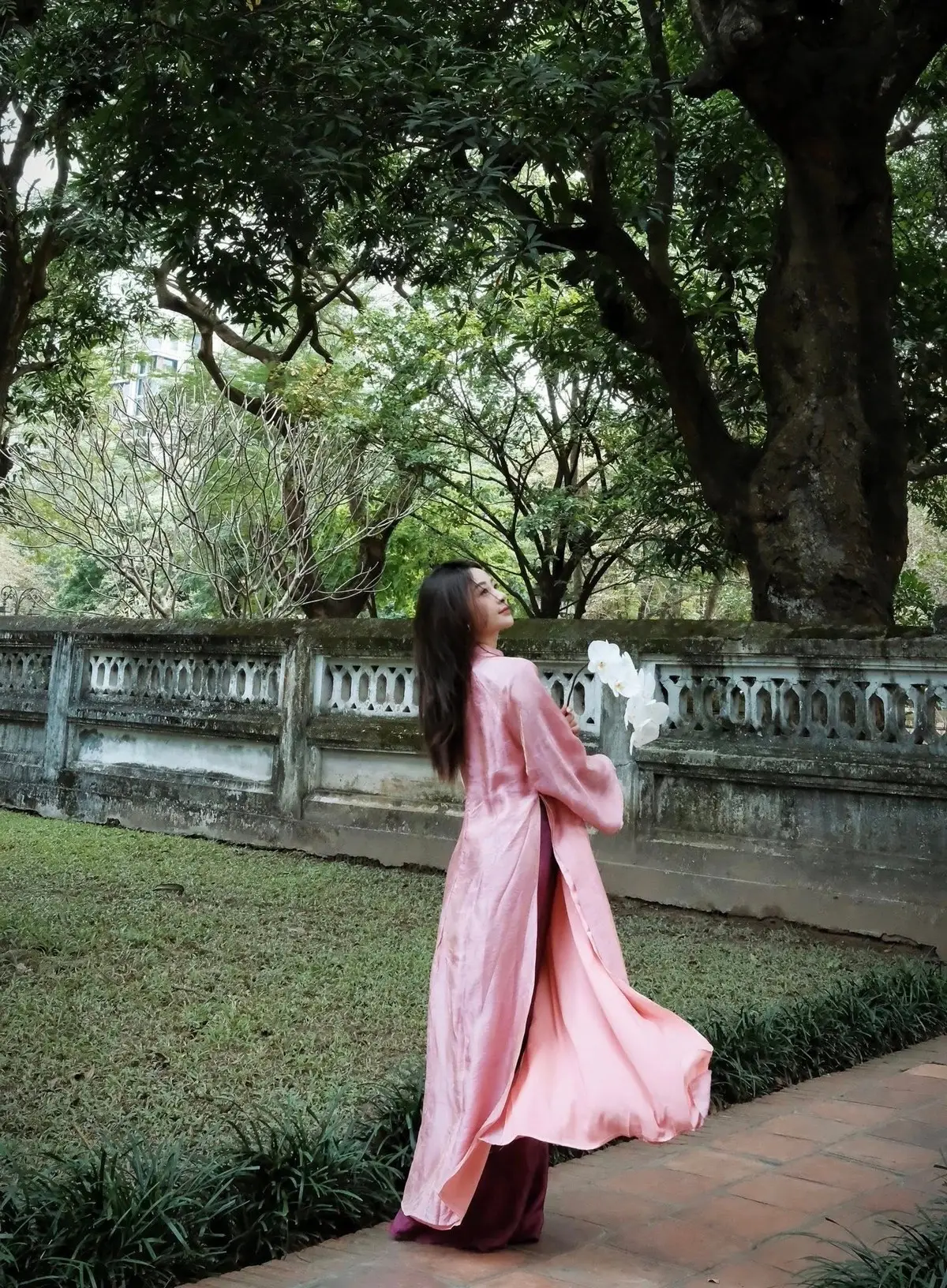 This stunning photograph captures a young Vietnamese woman in a soft pink Ao Dai standing gracefully amidst an ancient architectural setting Her elegant beauty complemented by the bouquet of flowers she holds blends perfectly with the solemn charm of moss-covered tiled roofs and traditional wooden pillars More than just a moment this image is a tender declaration of Vietnamese cultural beauty where the Ao Dai is not merely an attire but a symbol of grace elegance and national identity It evokes a sense of peace and nostalgia for precious traditional values#AoDaiVietnam #VietnameseCulture #TraditionalBeauty #VietnameseWoman #AncientArchitecture #AoDai
