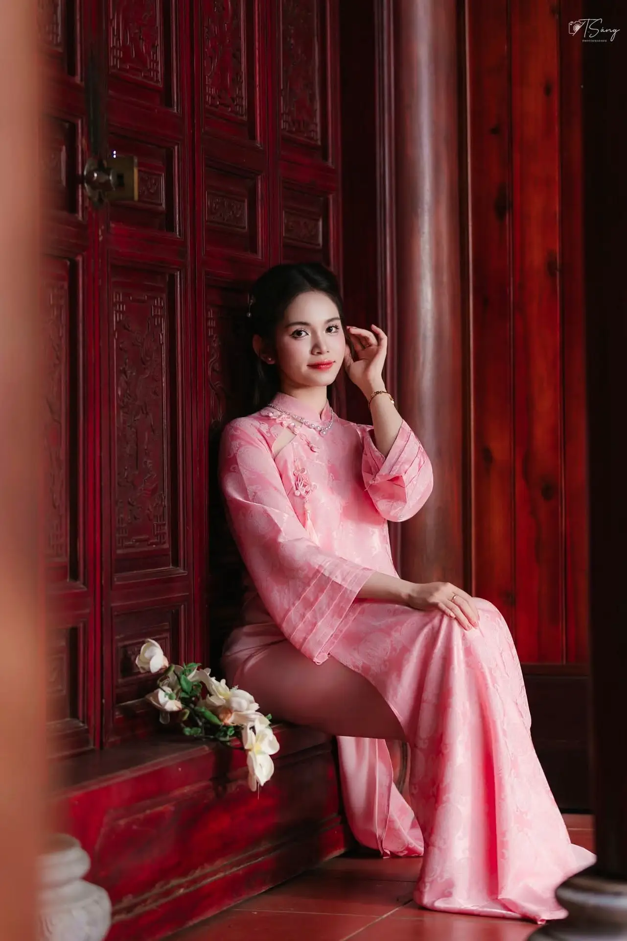 This captivating image features a Vietnamese woman gracefully adorned in a delicate pink Ao Dai exuding an ethereal and elegant beauty. She stands amidst a backdrop of ancient Vietnamese architecture characterized by sturdy wooden pillars and a serene red-tiled floor evoking a sense of tranquility and nostalgia. The traditional Ao Dai combined with this culturally rich setting creates a harmonious tableau that celebrates the gentle and refined charm of Vietnamese women. It is not merely a snapshot but a profound connection between the present and the past between humanity and cultural heritage.#AoDai #Fashion #VietnameseBeauty #AncientArchitecture #TraditionalCulture #VietnamHeritage