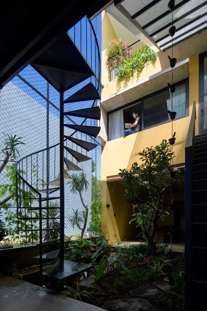 From an aerial perspective, the photograph reveals a vibrant, lush green space where people and nature harmoniously intertwine. This is a glimpse into a unique 'healing house' in Da Nang, an architectural marvel that captivates with its distinctive ecological design. Rather than merely being a backdrop, nature is actively integrated, creating small, shaded gardens within the architectural framework, offering freshness and tranquility. Spiral staircases invite exploration of this cool green sanctuary, where individuals can find relaxation and connection. More than just a residence, this house is an ideal destination for rejuvenation, demonstrating how architecture can perfectly blend with the environment, providing an inspiring and sustainable living experience.#HealingHouse #EcologicalArchitecture #DaNang #GreenSpace #NatureInArchitecture