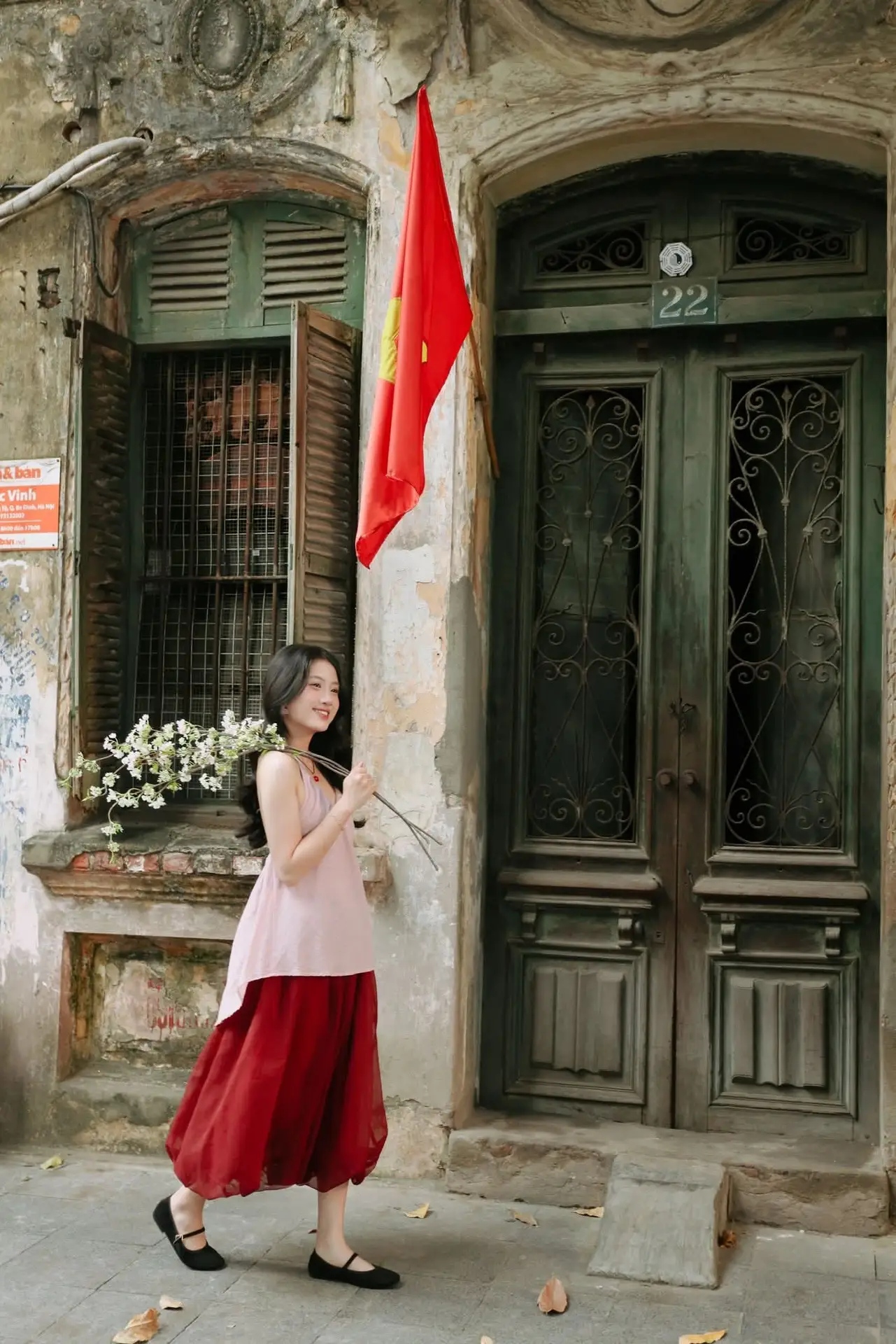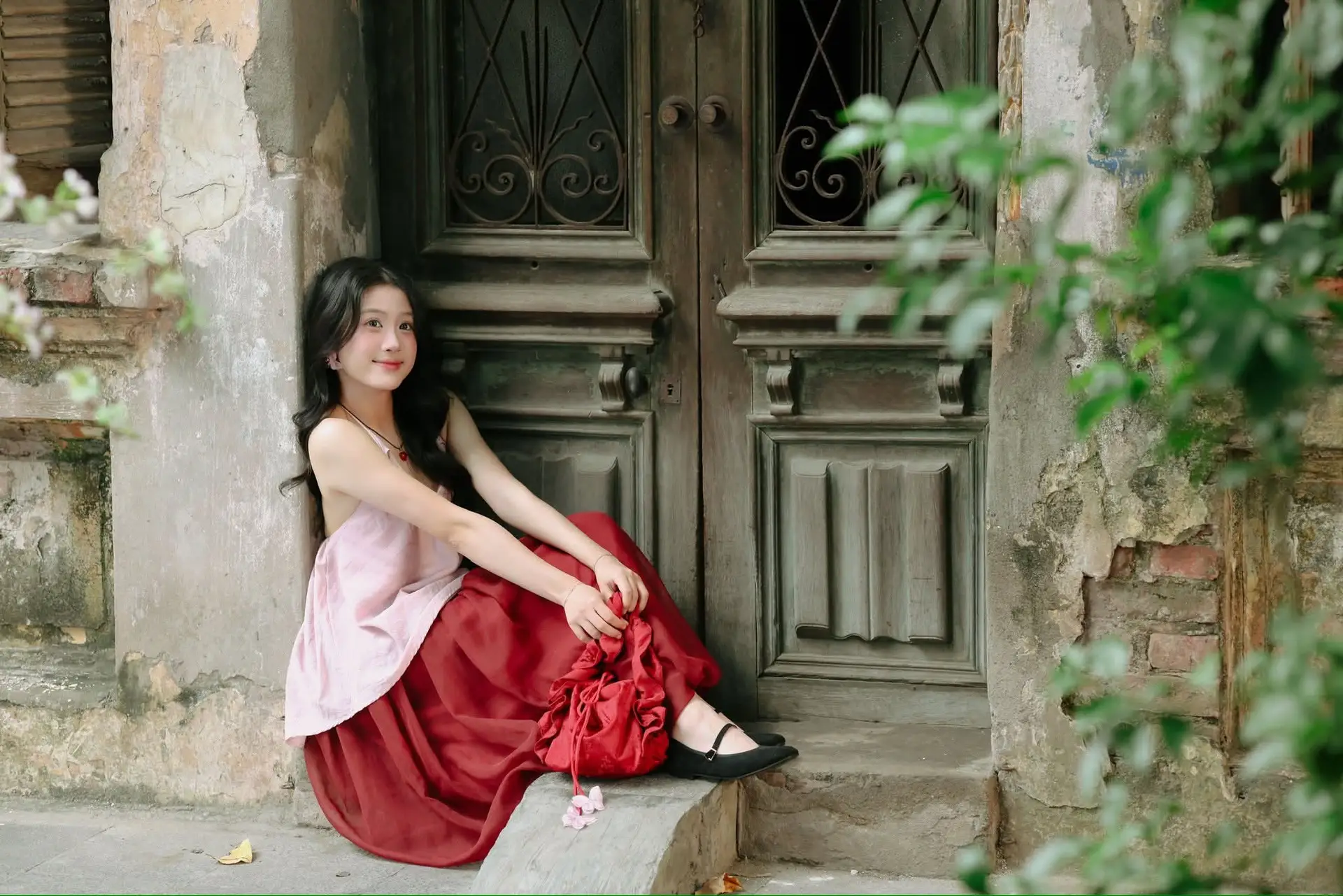 This stunning portrait captures a Vietnamese girl exuding ethereal beauty and grace She wears the traditional conical hat Nón Lá a symbol of Vietnamese culture with natural elegance highlighting her pure Asian charm Her long wavy dark hair paired with a soft pink dress and a flowing red skirt creates a harmonious blend of classic and modern styles Her clear eyes and gentle expression convey a profound sense of peace This image not only showcases her physical beauty but also evokes the characteristic elegance and demureness of Vietnamese women The blurred ancient street background further accentuates the timeless allure of this Asian muse offering a deeply emotional visual experience
