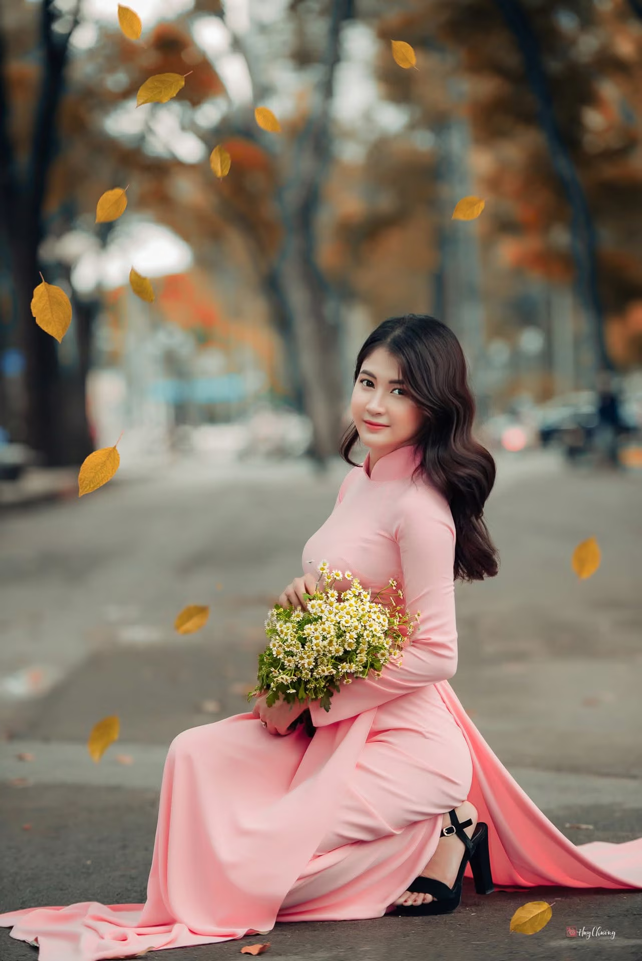 The VGU No20 image captivates viewers with the gentle beauty of a Vietnamese girl in a flowing pink Ao Dai She sits naturally amidst a romantic autumn setting filled with golden falling leaves The traditional Ao Dai gracefully embraces her elegant figure highlighting her charming East Asian features The girl offers a soft smile with kind eyes while holding a vibrant bouquet of fresh flowers This is not merely a beautiful photograph but a harmonious blend of traditional Vietnamese culture and the transitional beauty of nature The image exudes tranquility and sophistication evoking nostalgic feelings of peaceful autumn afternoons This enchanting beauty is sure to leave a lasting impression on all who behold it #Vietnamese #pretty #charmVGU No.1: Stylish Girl Flaunts Alluring Beauty at Autumn Cafe 1000020794