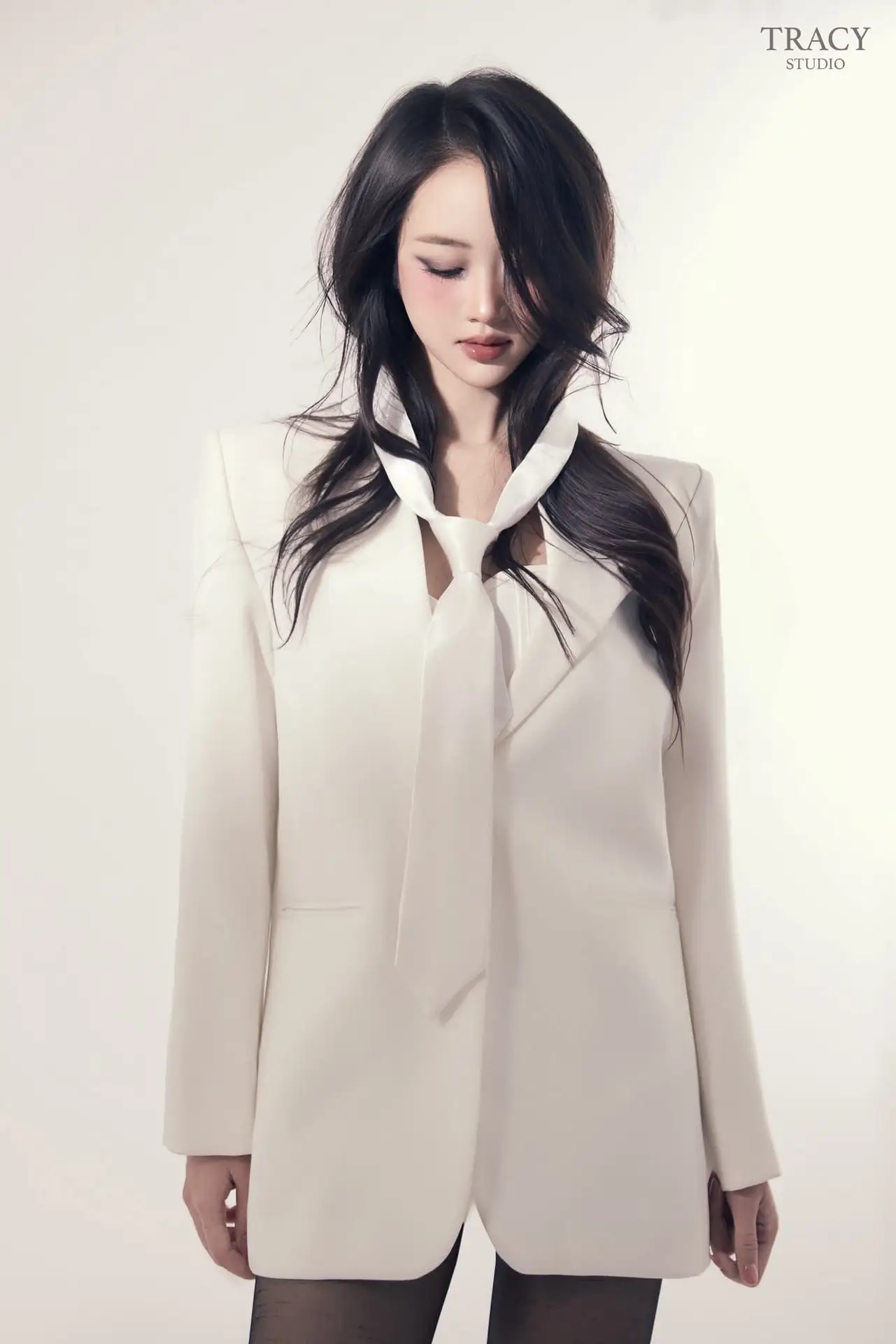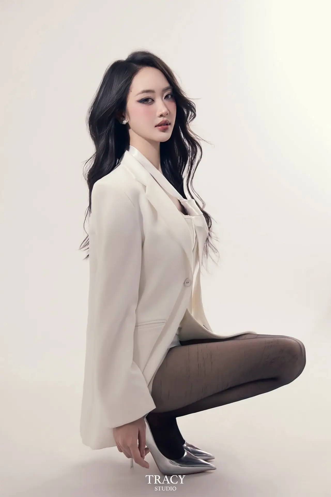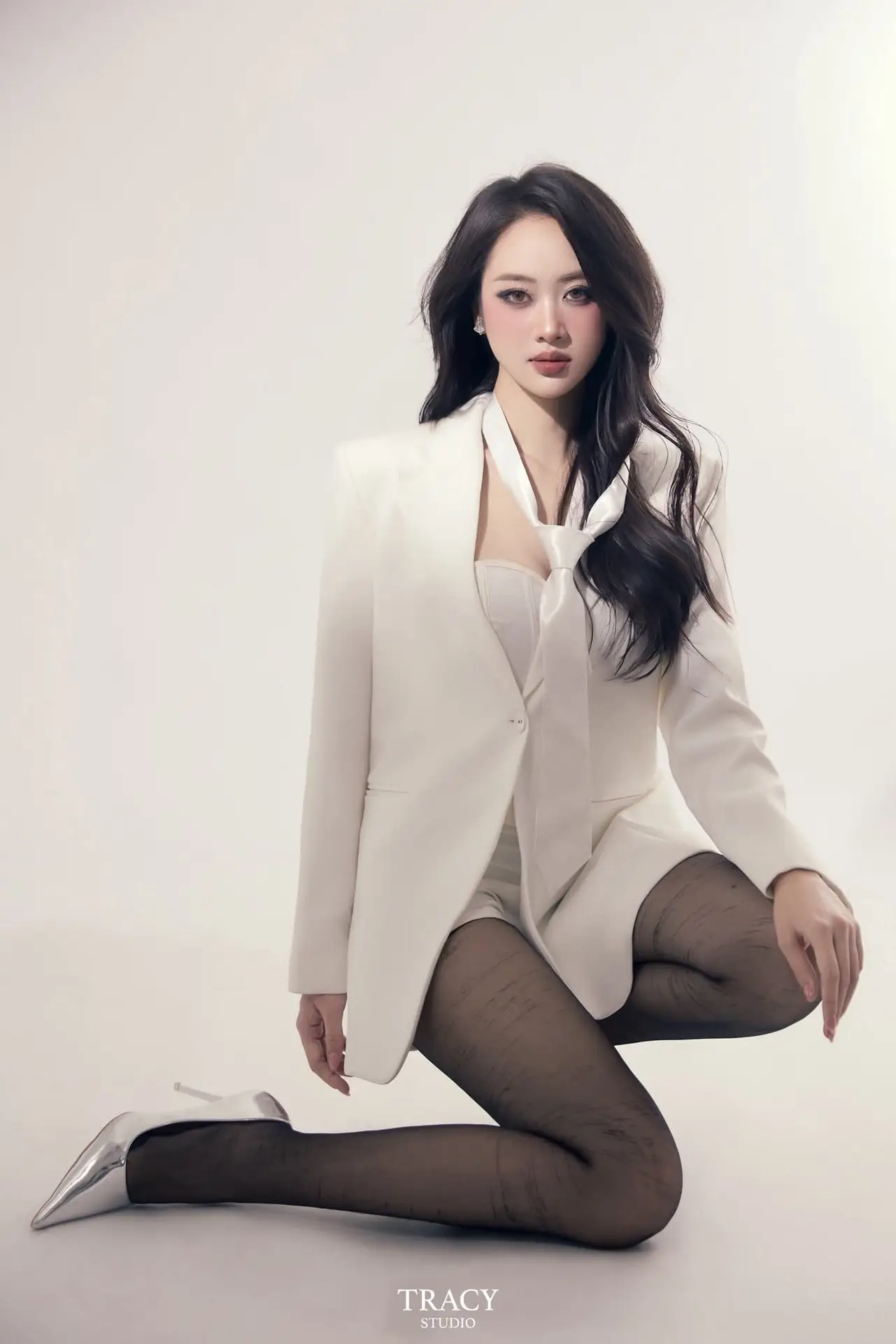 This captivating fashion portrait beautifully captures a modern woman exuding style and confidence. She is elegantly dressed in a chic white blazer, perfectly complemented by delicate black sheer stockings, creating a sophisticated yet alluring contrast. Shimmering silver high heels complete her luxurious ensemble, accentuating her slender figure and enchanting legs. From her sharp gaze to her professional demeanor, the subject radiates a trendy allure and unique personality. This image is more than just a fashion shot; it's a powerful statement of self-assurance and high-class style, ideal for those who appreciate timeless beauty and contemporary charm.#WomensFashion #FashionPortrait #BlackSheerStockings #ElegantStyle #WhiteBlazerLook