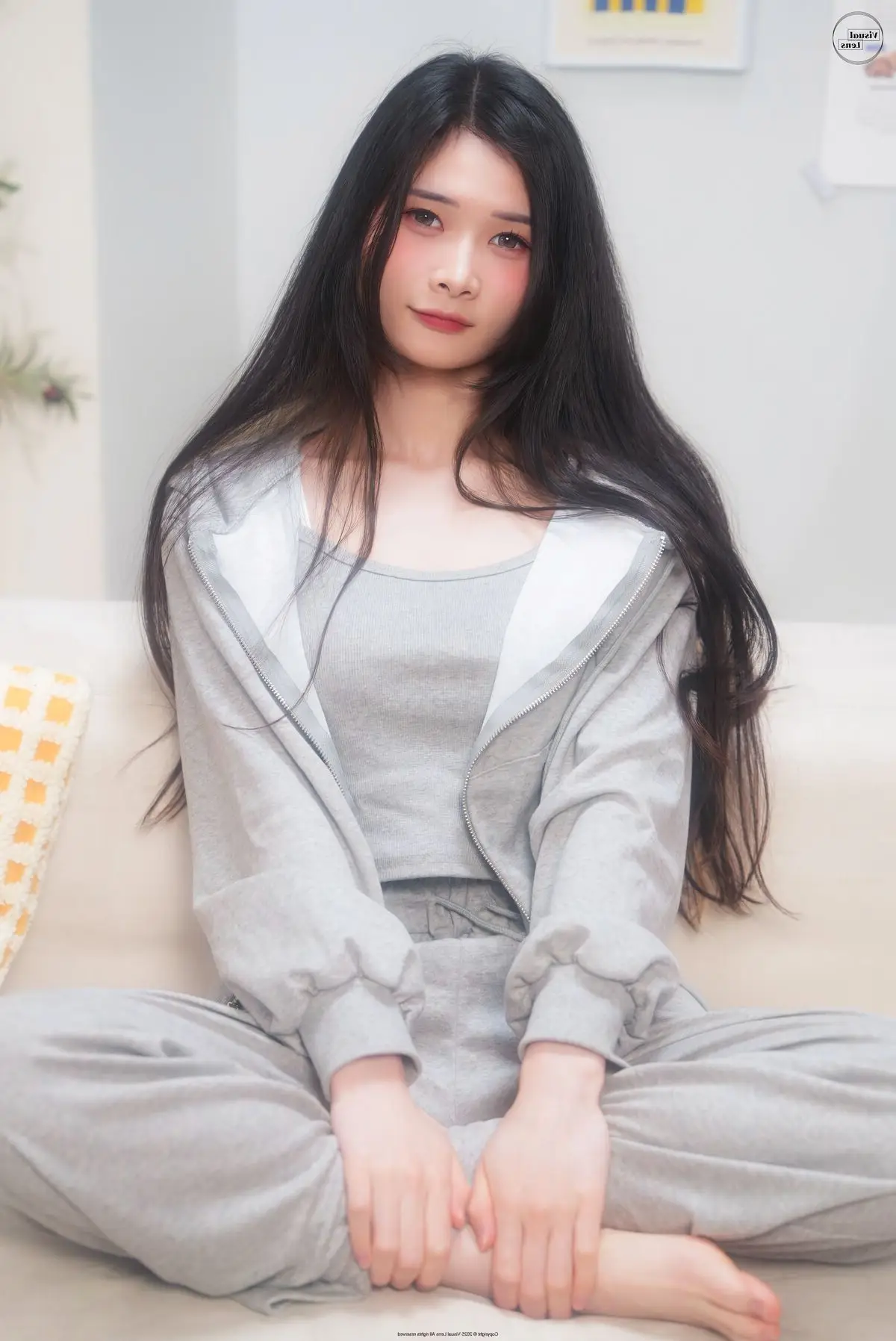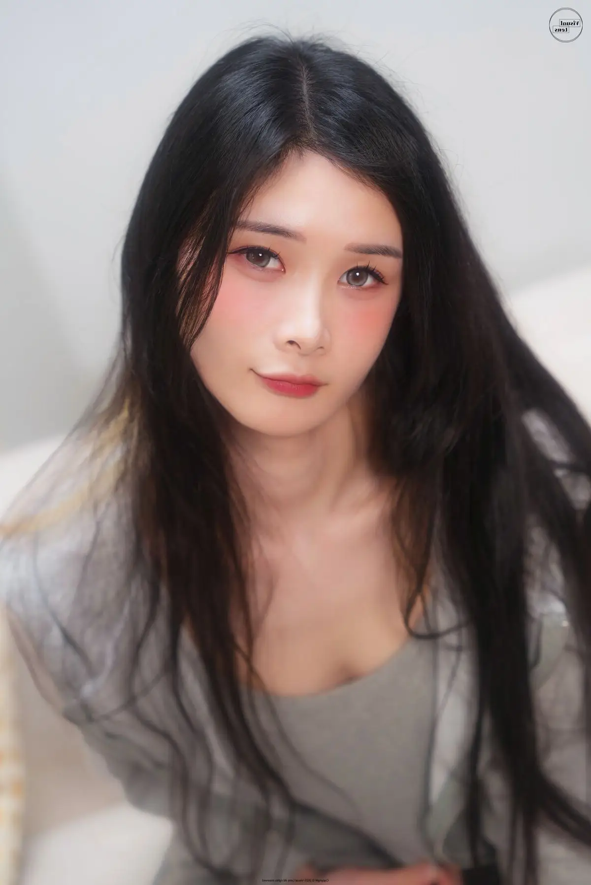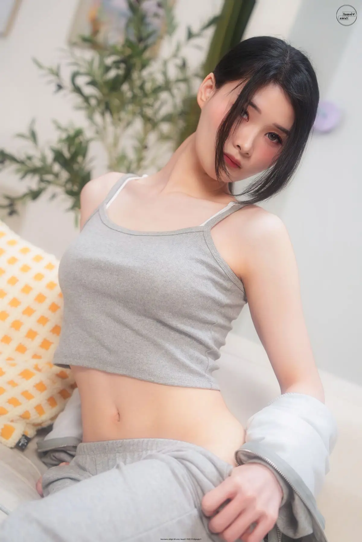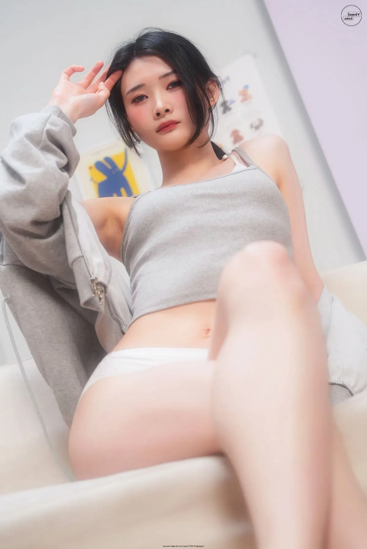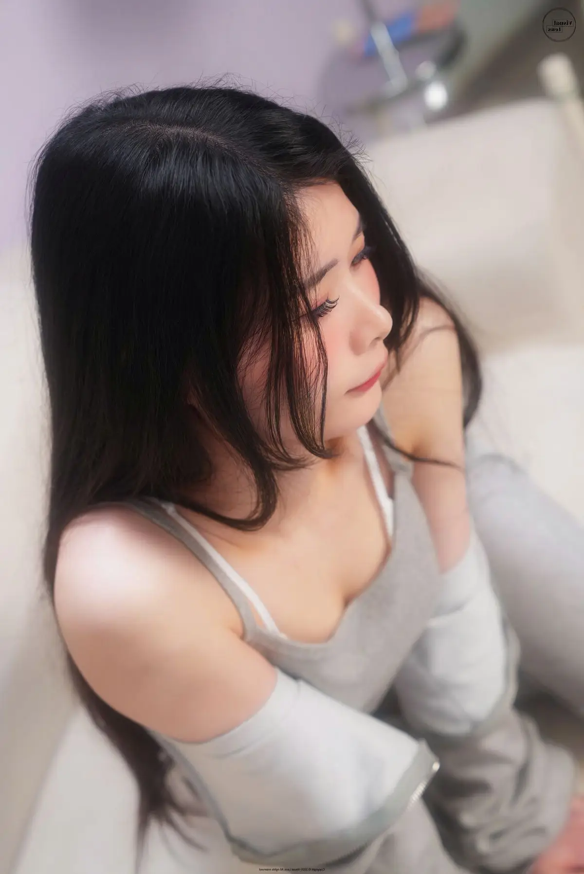 This image captures a truly exquisite moment of Min.E, showcasing her natural and captivating beauty. Kneeling gracefully on a soft sofa, Min.E exudes a gentle elegance and serenity. Dressed in a simple white tank top and light-colored briefs, her soft silhouette and alluring curves are subtly highlighted. Her gaze is directed downwards, and her dark hair is neatly tied, creating an introspective, quiet charm that is undeniably attractive. The minimalist white background further accentuates Min.E's pure aesthetic. This particular shot is part of the LE LERB-208A collection, where each photograph beautifully narrates a story of grace and inner allure.#MinE #NaturalBeauty #ArtisticPortrait #FemaleModel #LELERB208A