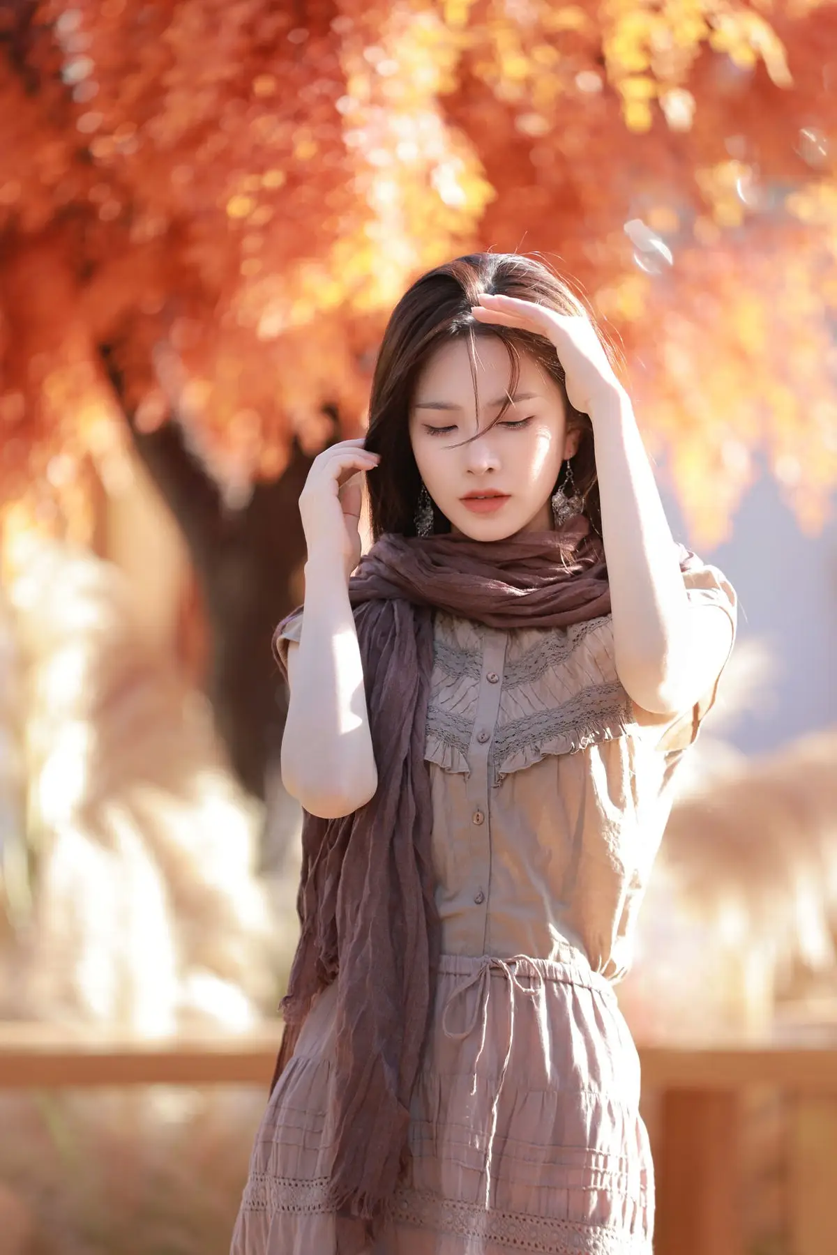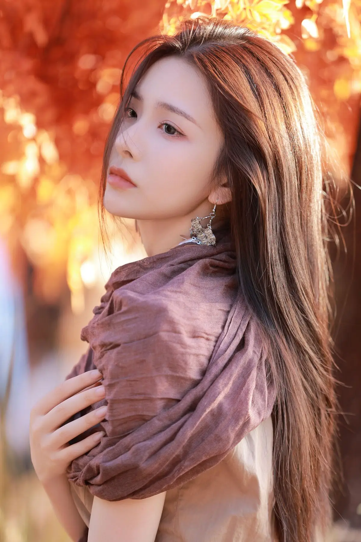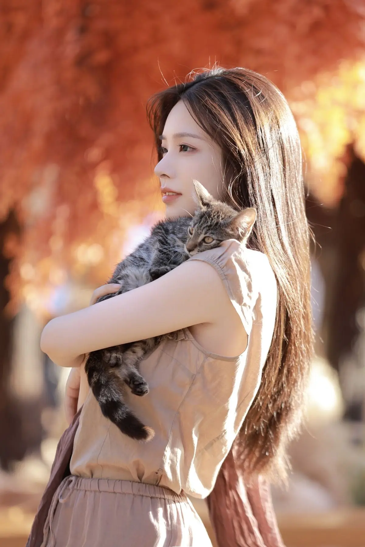 This exquisite photograph captures a tender moment with model Liang Chen, gently cradling her beloved cat. Her serene expression and distant gaze, combined with the innocent presence of the feline, create a scene brimming with emotion and tranquility. The vibrant reddish-orange foliage in the blurred background, characteristic of autumn, beautifully complements Liang Chen's natural elegance. This intimate moment not only showcases the bond between human and animal but also evokes the soft, peaceful ambiance of an autumn afternoon. Part of the YiTuYu Vol.8696 collection, this image exemplifies how photographic art conveys poetic narratives of beauty and feeling. Discover more captivating visuals of Liang Chen in this remarkable series.#LiangChen #YiTuYu #AutumnVibes #CatLover #ModelPortrait
