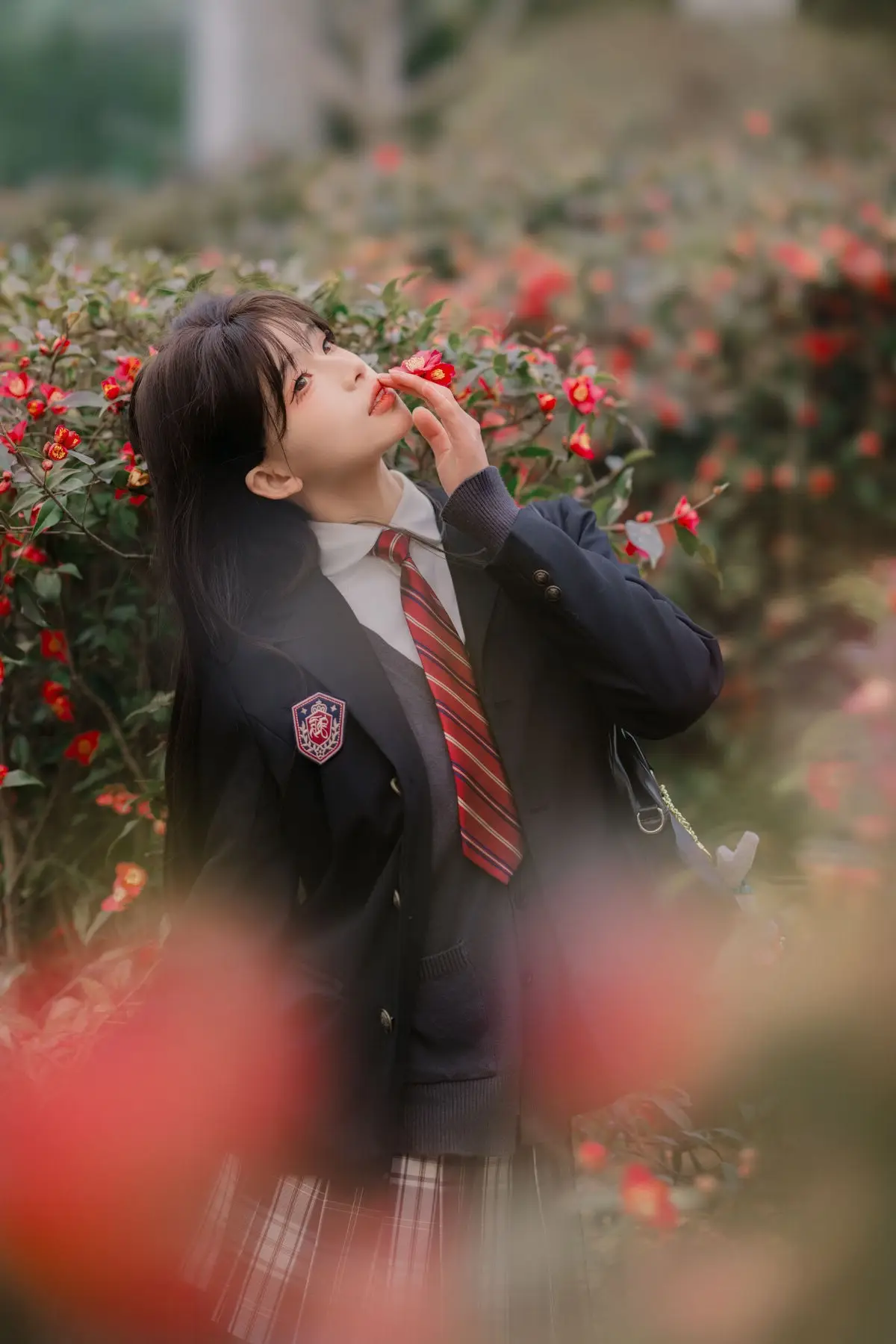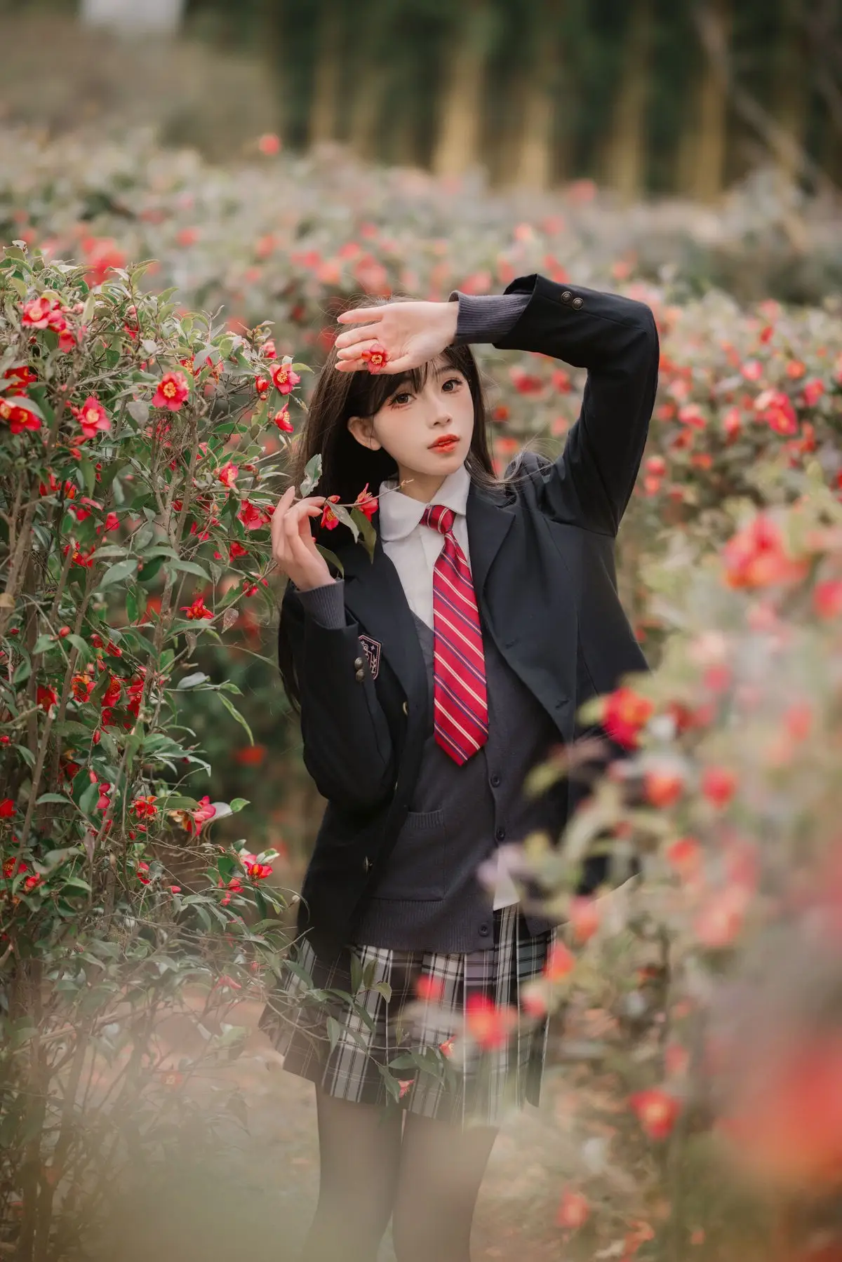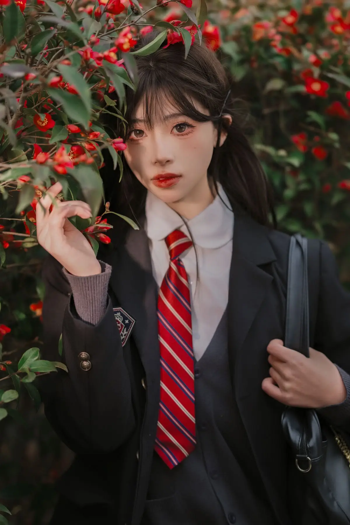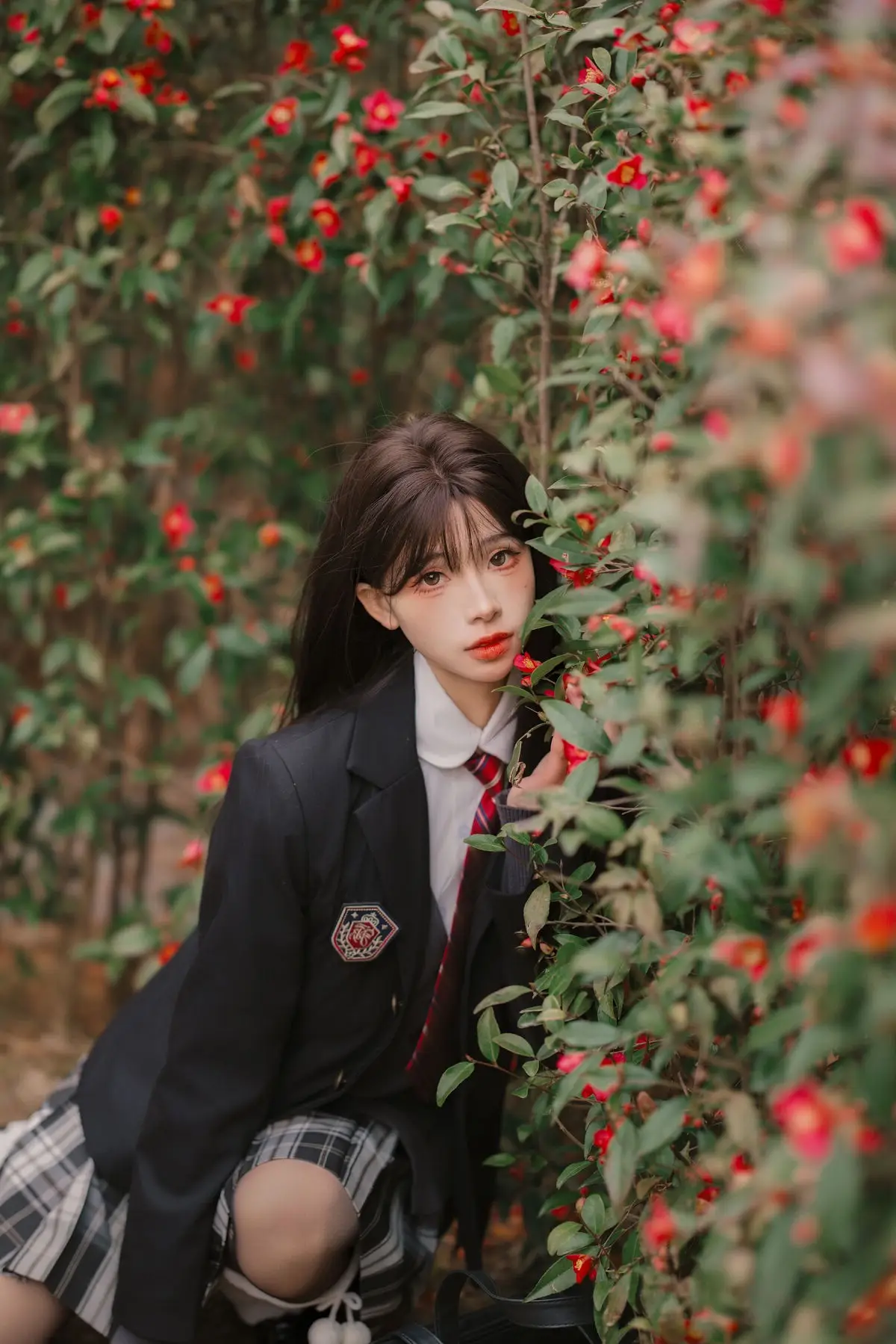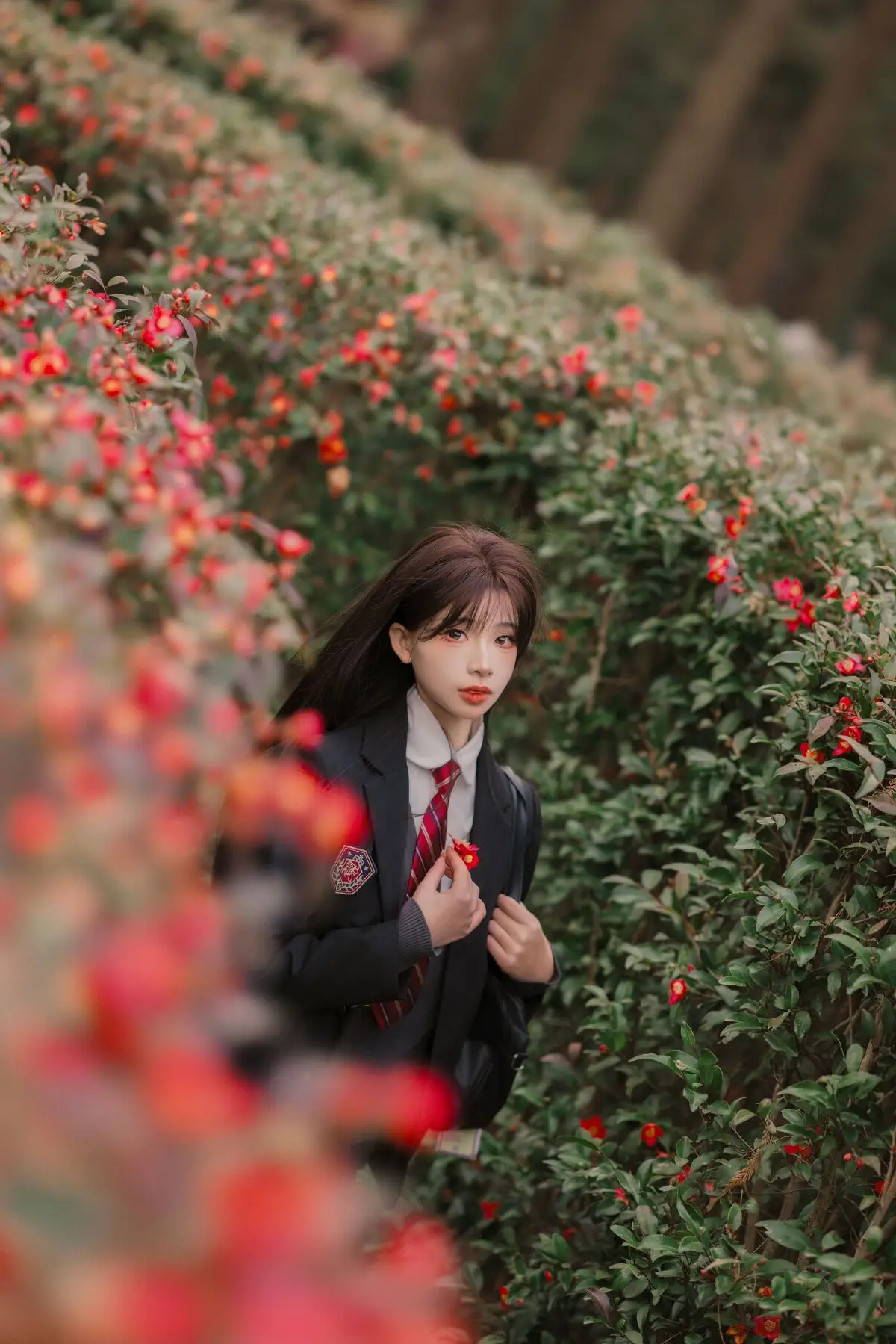 This exquisite photograph captures Xian Nu Juan in a poetic moment, exuding delicate and gentle beauty. The young model, with her long flowing hair and mesmerizing eyes, is adorned in a pristine school uniform, creating an image that is both innocent and captivating. Set against a lush backdrop of green leaves and vibrant red flowers, she gracefully touches a bloom, seemingly merging with the essence of nature. This YiTuYu Vol.8695 collection is not merely a photographic artwork but a narrative of youth, elegance, and hidden charm, guaranteed to enchant viewers and leave a lasting impression.#XianNuJuan #YiTuYu #SchoolGirlStyle #YouthfulBeauty #ArtPhotography