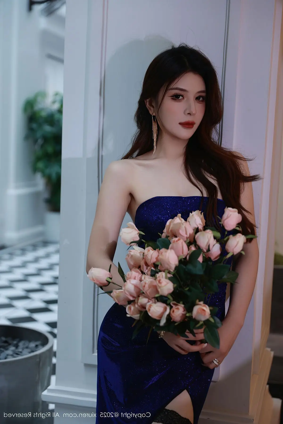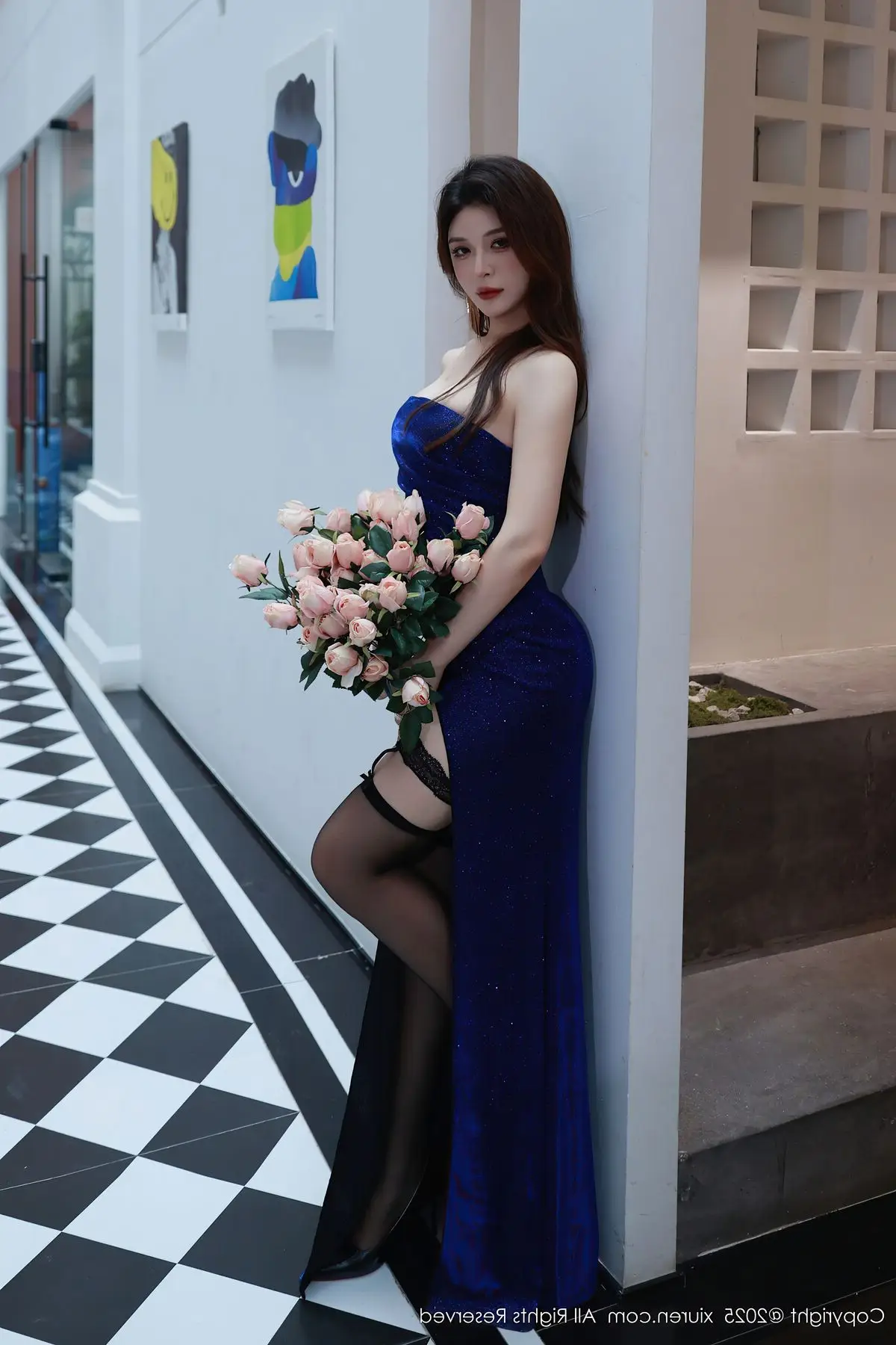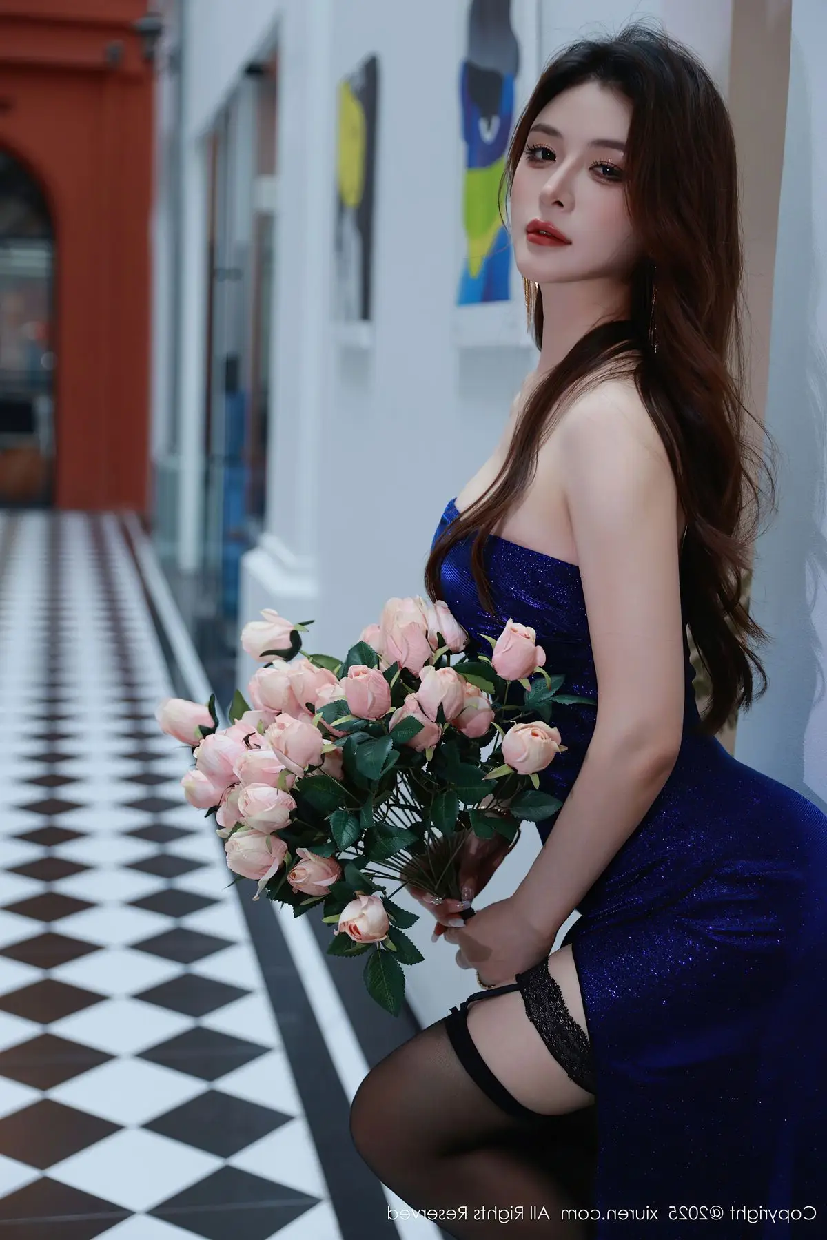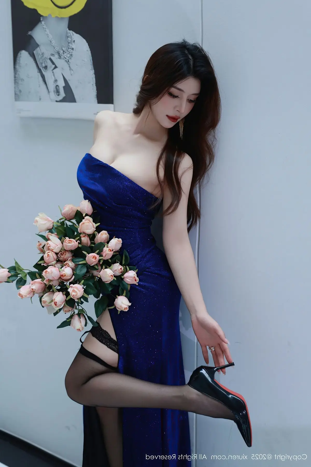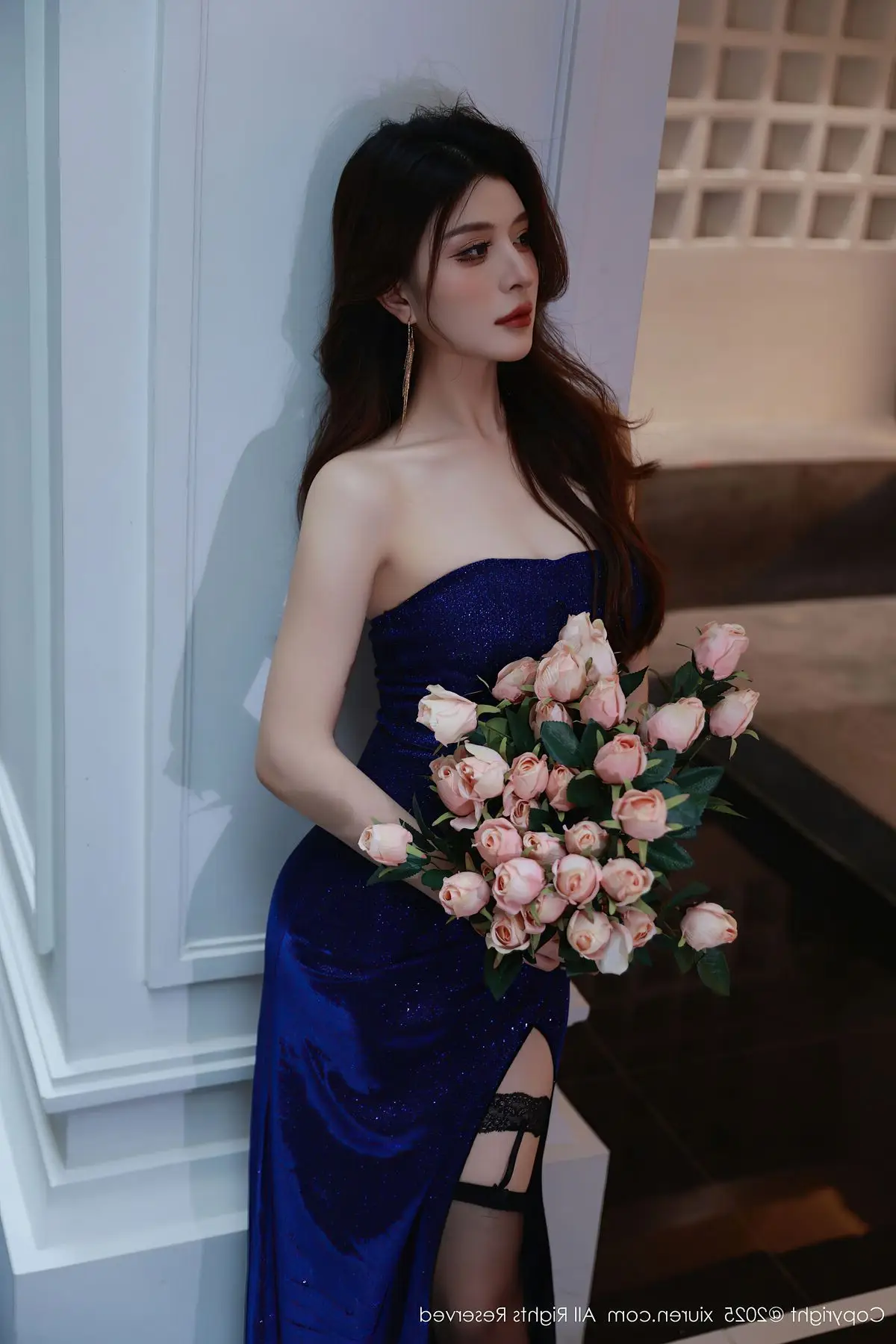 In the XiuRen No.10740 collection, A Yi Sha emerges with an utterly captivating charm. She dons a sleek navy blue dress, elegantly highlighting her slender silhouette. The alluring sheer stockings paired with her thoughtful, distant gaze create an irresistible allure. The backdrop of a sparkling city night, visible through a grand window, amplifies the luxurious and mysterious ambiance. Gentle illumination from a classic chandelier casts a shimmering glow, crafting a romantic and emotionally rich scene. A Yi Sha appears gracefully lost in contemplation, embodying a moment of serene power. Each photograph exquisitely captures her refined beauty and the confident poise of a modern woman.#XiuRen #AYiSha #Glamour #CityNight #NightFashion