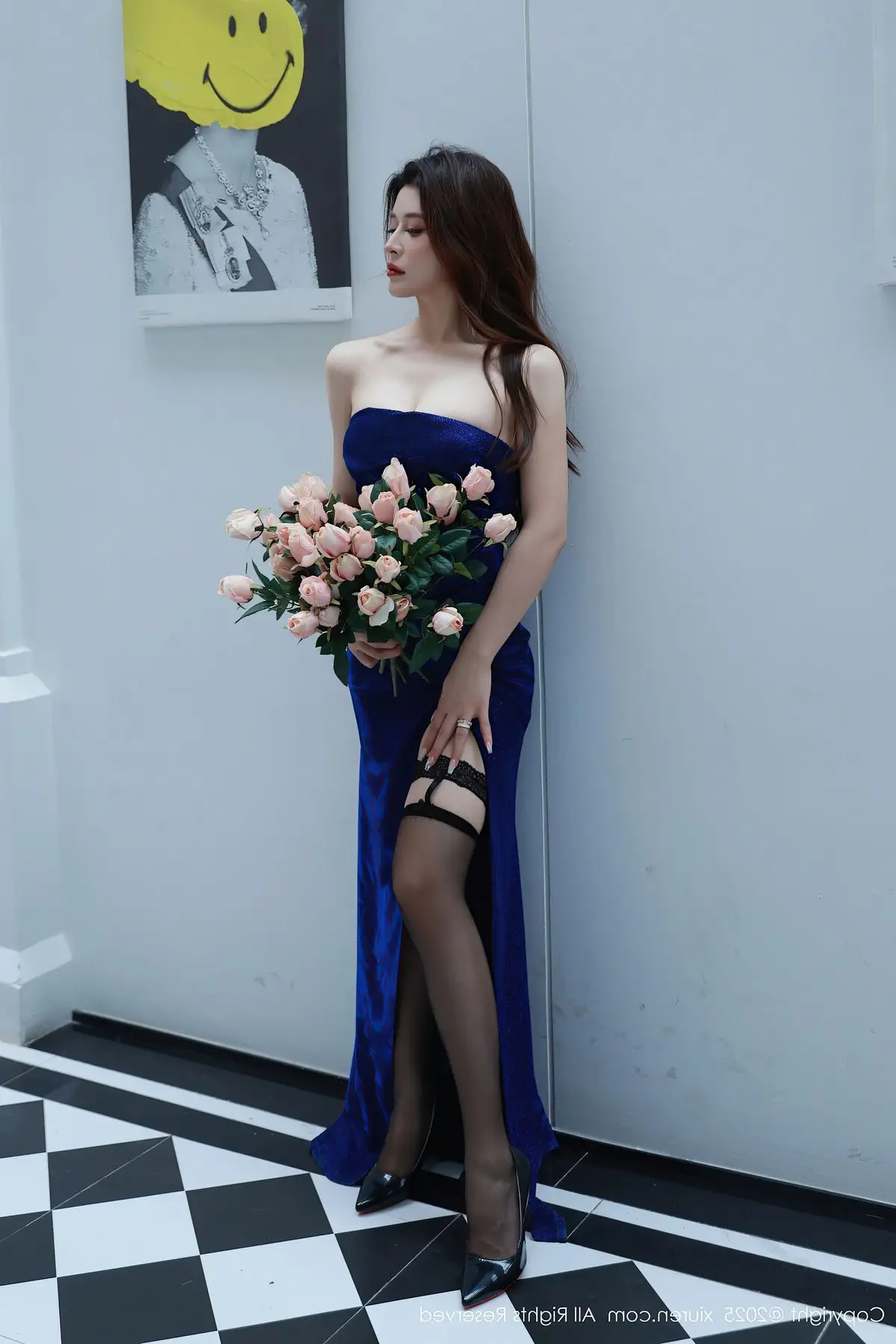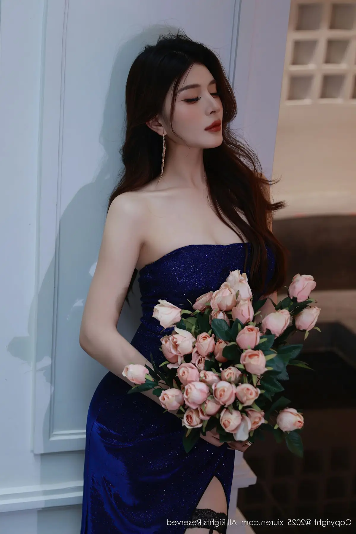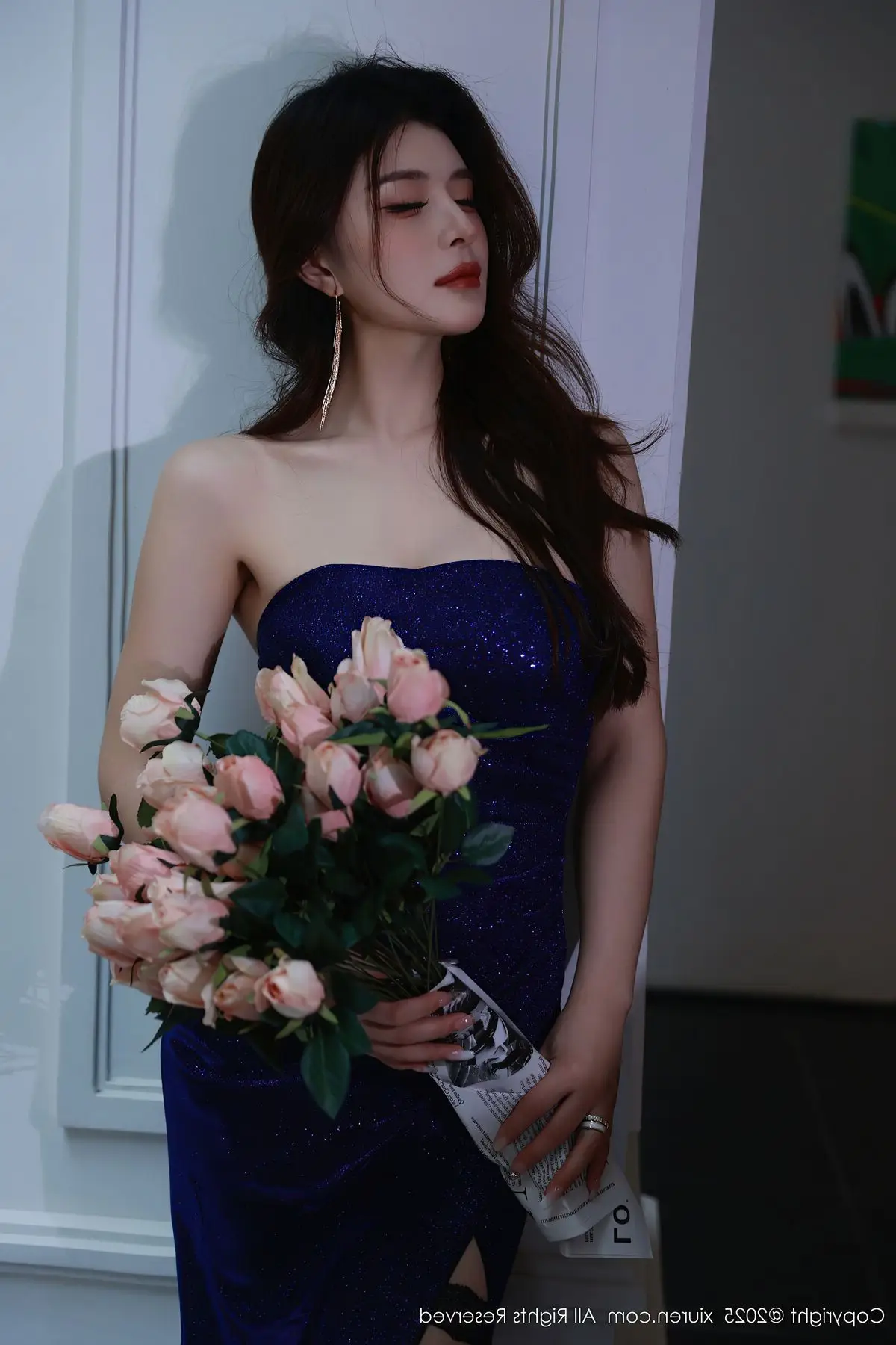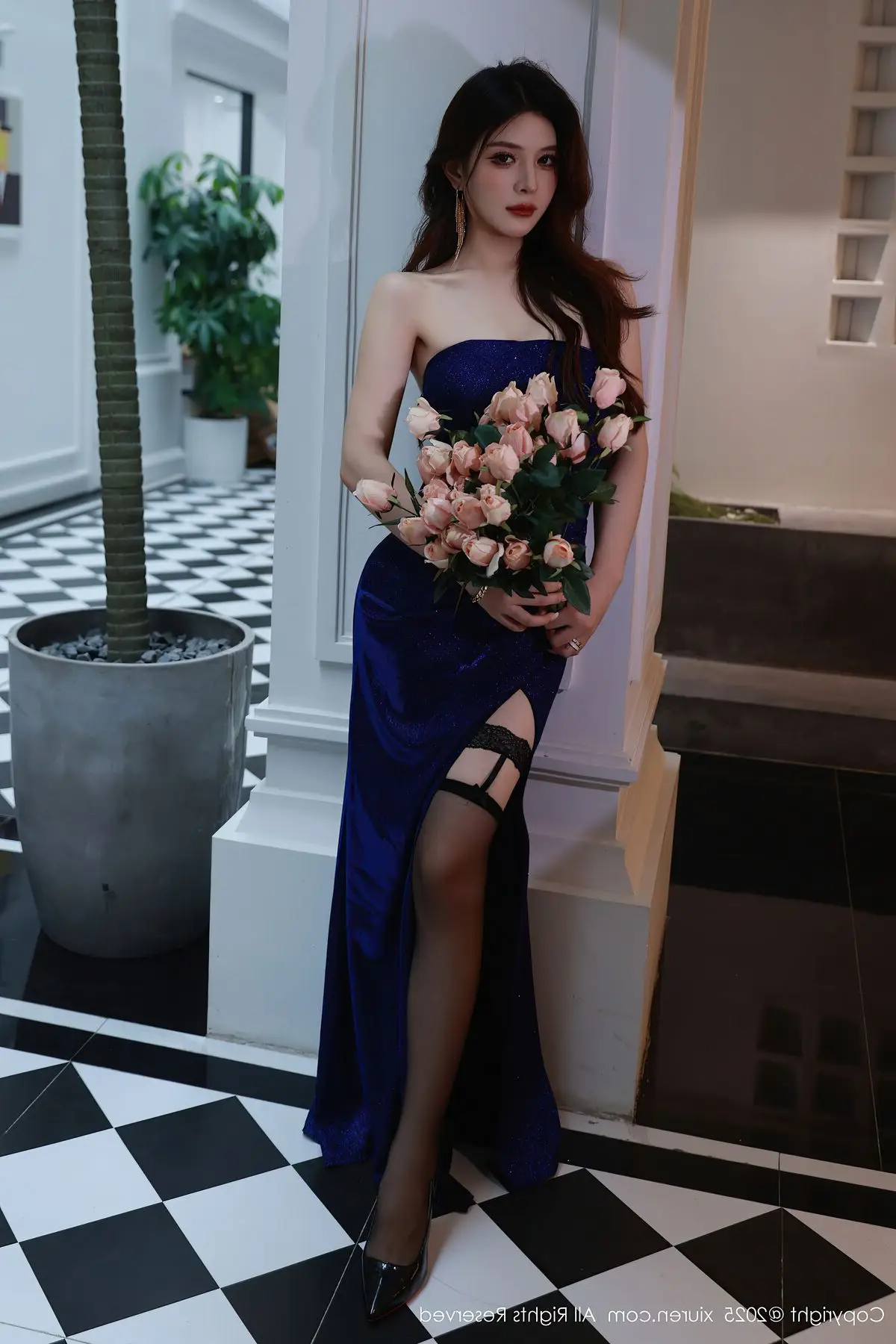 In the XiuRen No.10740 collection, A Yi Sha emerges with an utterly captivating charm. She dons a sleek navy blue dress, elegantly highlighting her slender silhouette. The alluring sheer stockings paired with her thoughtful, distant gaze create an irresistible allure. The backdrop of a sparkling city night, visible through a grand window, amplifies the luxurious and mysterious ambiance. Gentle illumination from a classic chandelier casts a shimmering glow, crafting a romantic and emotionally rich scene. A Yi Sha appears gracefully lost in contemplation, embodying a moment of serene power. Each photograph exquisitely captures her refined beauty and the confident poise of a modern woman.#XiuRen #AYiSha #Glamour #CityNight #NightFashion