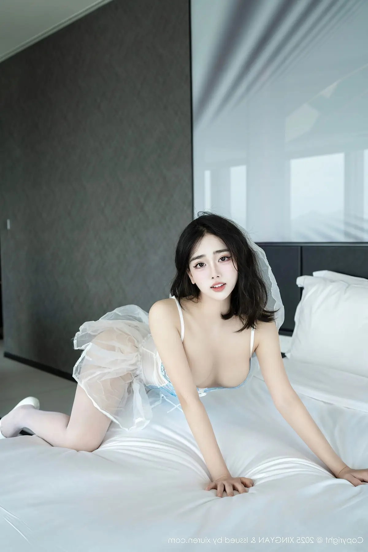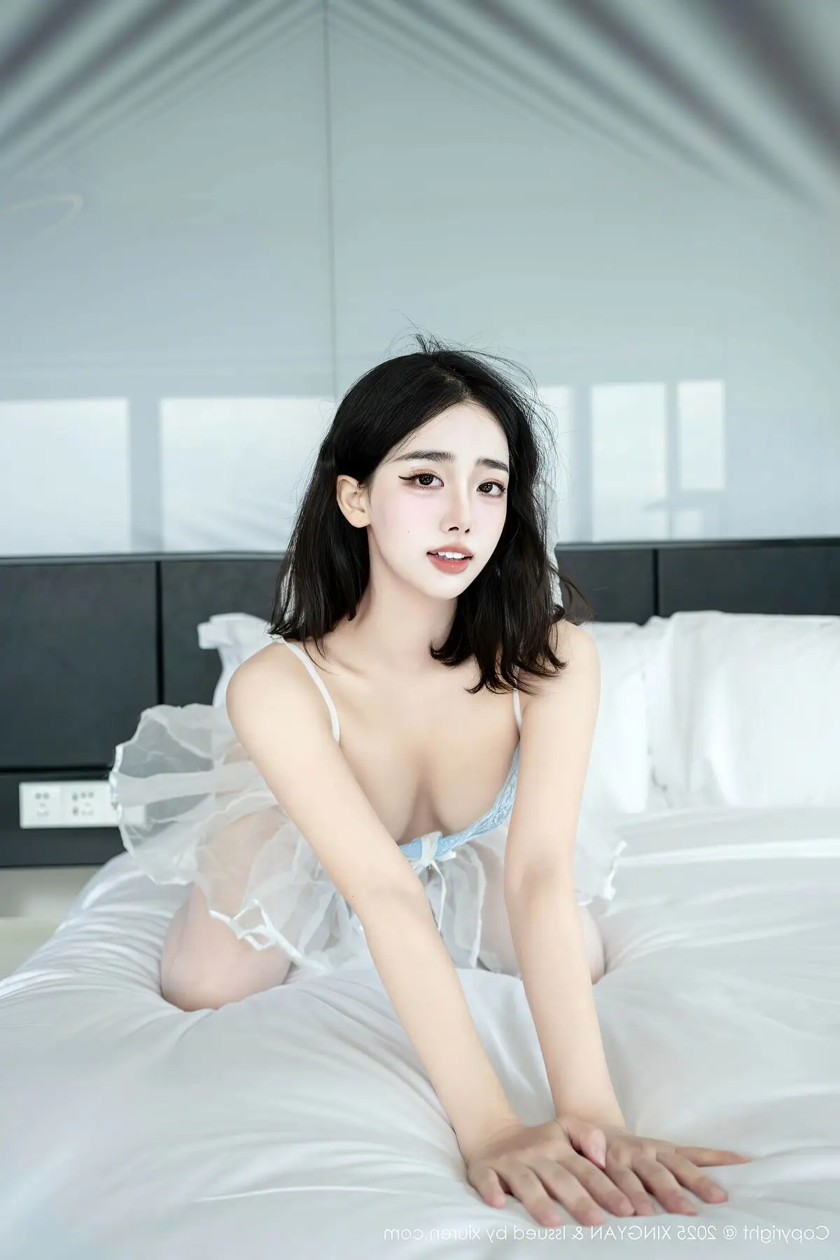 In the XingYan Vol.410 photo collection, model Ruan Fu Fu shines with her ethereal and captivating beauty. She gracefully poses in a delicate light blue and white lace and sheer ensemble subtly highlighting her soft elegant figure. The intimate bedroom setting bathed in gentle light features pristine white bedding and a striking purple accent lamp creating a romantic and dreamy atmosphere. Ruan Fu Fu's gentle gaze and serene expression convey both innocence and allure inviting viewers into her world. Each image beautifully captures her unique blend of purity and sensuality making this series a truly enchanting visual experience that is sure to mesmerize.#RuanFuFu #XingYan #AsianModel #LingerieFashion #EtherealBeauty
