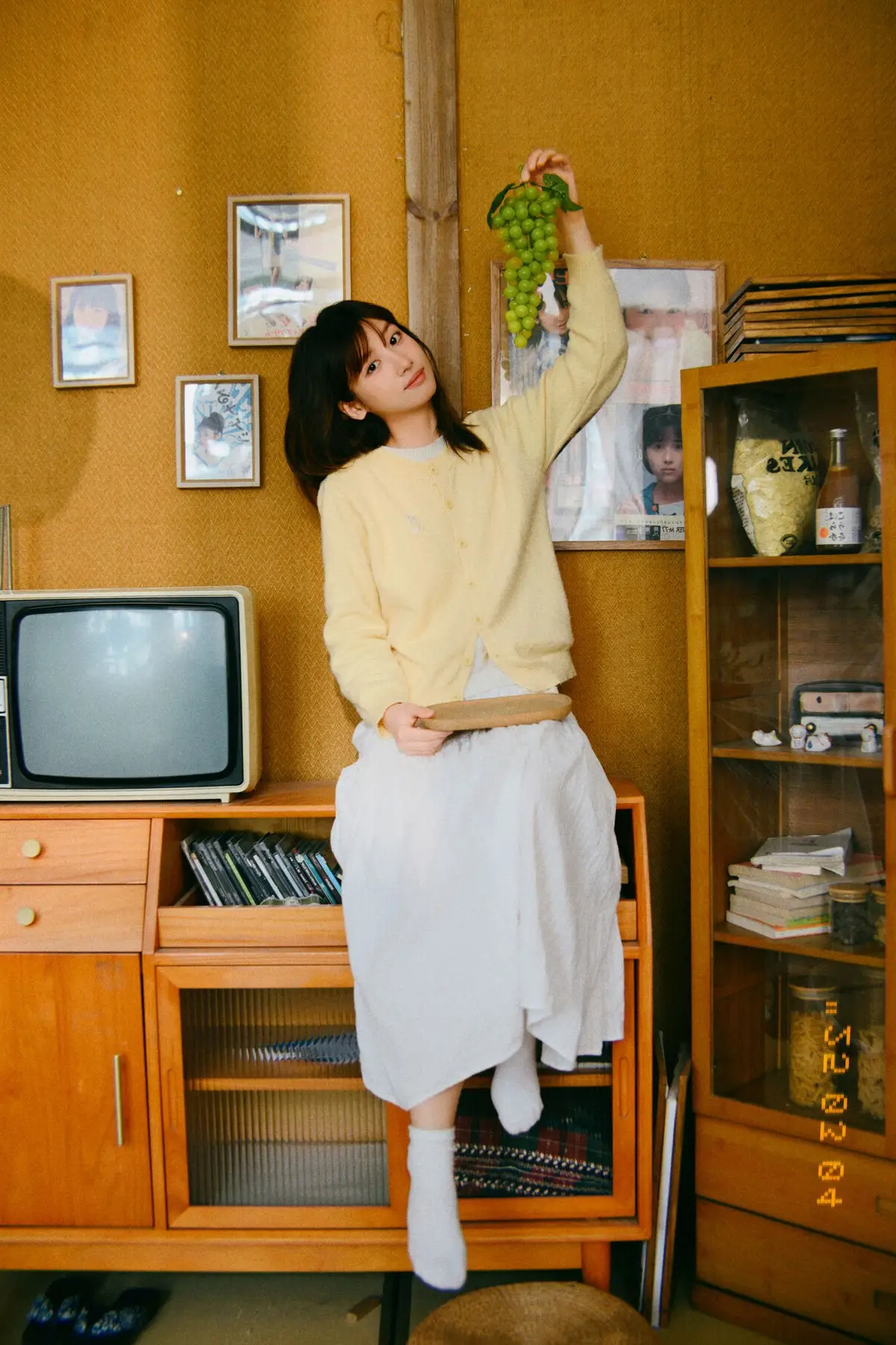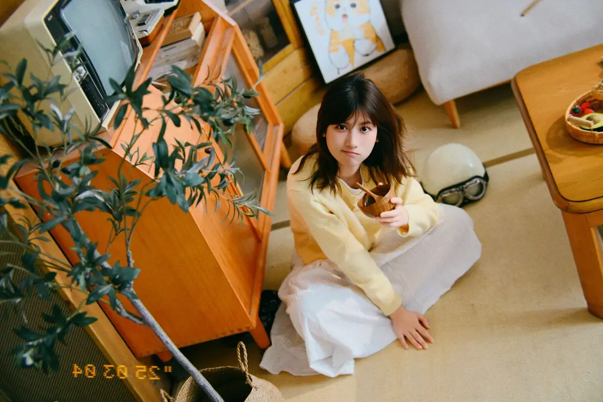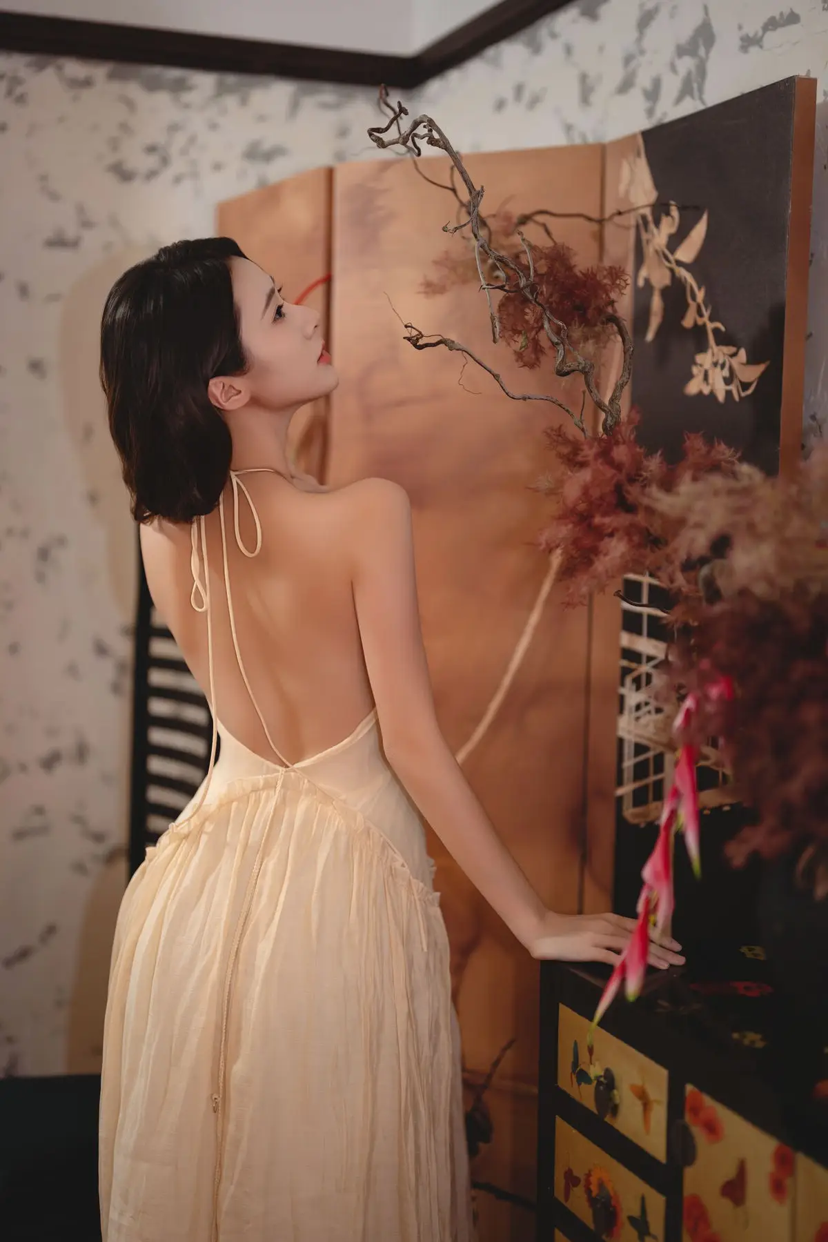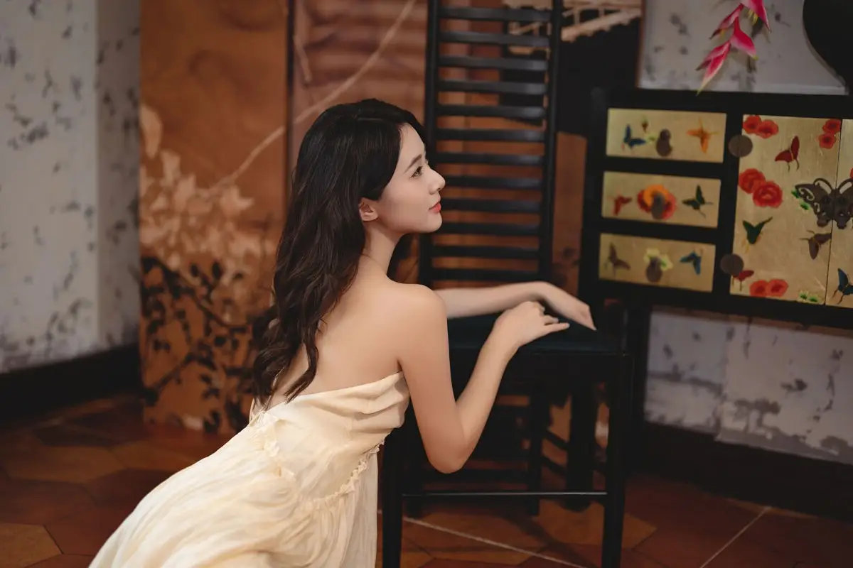 This captivating image from the YiTuYu Vol.8676 collection showcases model Fu Po in a moment of artistic grace and allure. She exudes an elegant beauty, draped in a soft, light yellow strapless dress that subtly highlights her shoulders. Fu Po's profound gaze directly engages the viewer, creating a powerful yet enigmatic connection. Her posture, leaning gently against a classic wooden chair, adds a touch of vintage charm and sophistication to the composition. The interplay of soft lighting, warm tones, and her delicate expression culminates in an emotionally rich photograph, inviting admirers to delve into Fu Po's pure beauty and undeniable charisma. This piece truly stands out within the Art Language series.#FuPo #YiTuYu #ArtisticPortrait #ElegantBeauty #AsianModel