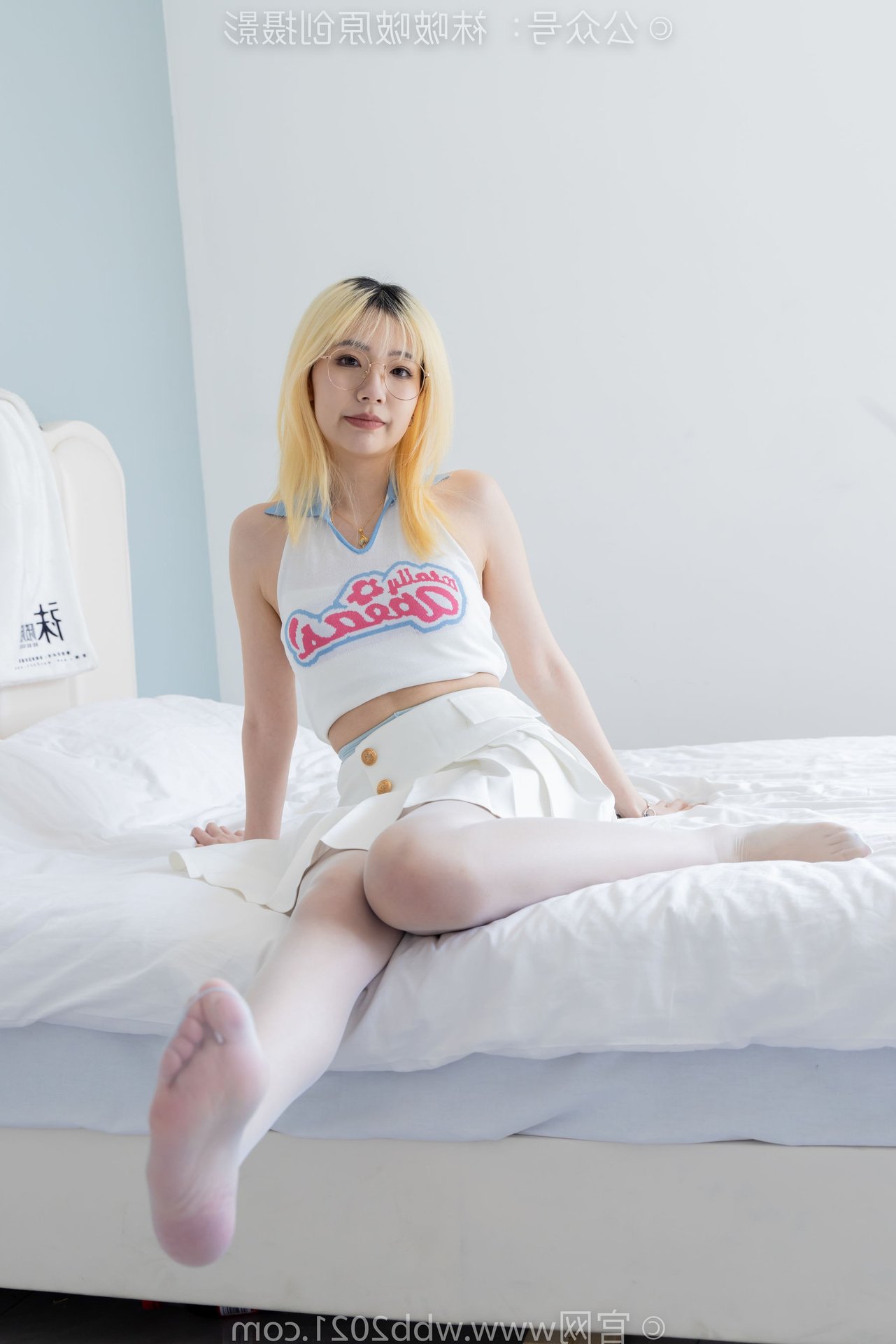 Chinese model BoBoSocks No543 radiates youthful charm and freshness With her bright blonde hair and a radiant smile her eyes hold a playful sparkle Dressed in a pristine white crop top and matching skirt she showcases a slender figure and energetic style Her comfortable barefoot pose on the crisp white bed evokes a sense of intimacy and natural beauty The minimalist bright bedroom accentuates her pure and graceful presence This moment captures her adorable and vibrant energy a true representation of BoBoSocks fashion that is full of emotion and unique personality.