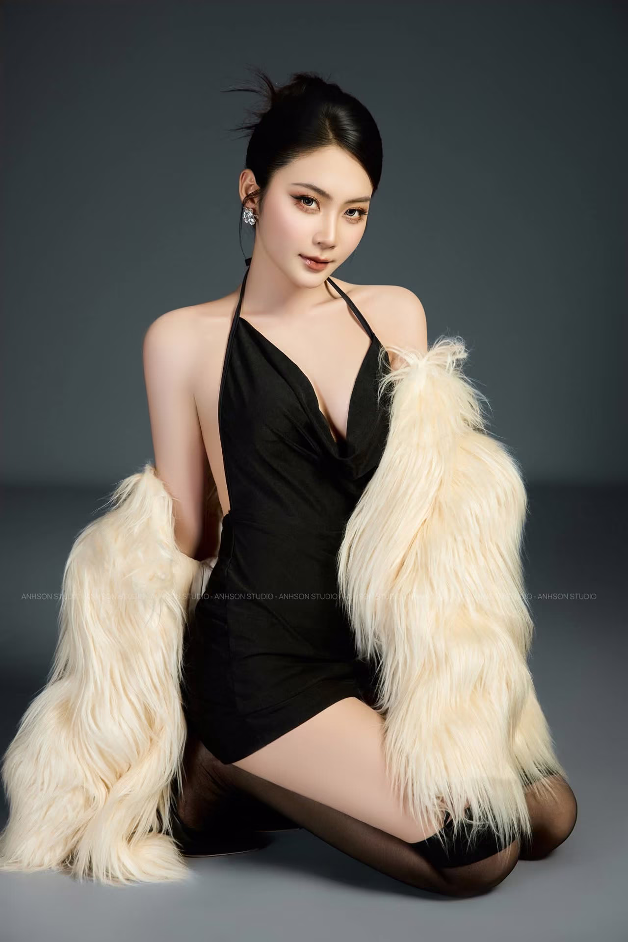 This VGU No21 image captures the mesmerizing beauty of a woman exuding absolute confidence and captivating allure She sits gracefully on a luxurious armchair adorned in a form-fitting black mini dress seductive sheer stockings and elegant high heels A sophisticated ivory fur coat draped casually over her shoulders enhances her luxurious and high-class appeal Her deep gaze and slightly parted lips convey an irresistible charm This is more than just a fashion moment it is a statement of self-assurance and inherent beauty Every detail from her attire to her demeanor is meticulously arranged creating a harmonious and utterly captivating ensemble This image will undoubtedly inspire a sense of style and boldness in fashion choices #Vietnamese #pretty #charmVGU No.19: The Enchanting Charm of Ao Dai and Vietnamese Beauty in the City