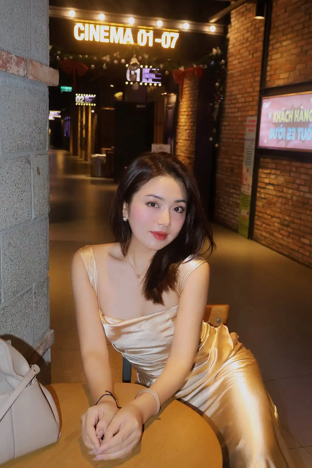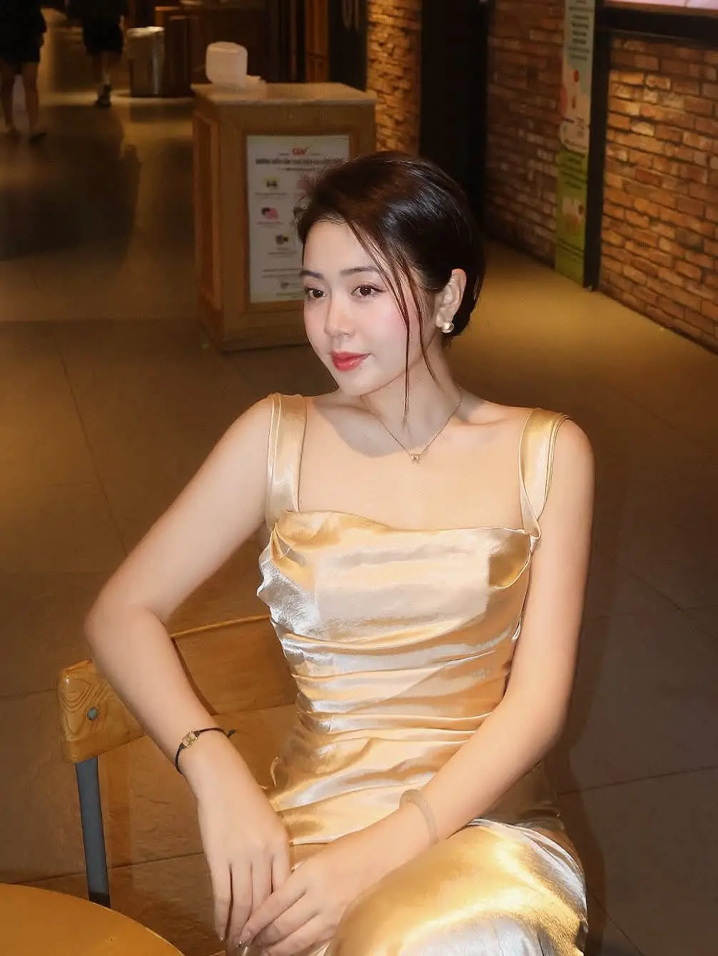 This captivating image captures a moment of refined elegance from a young woman exuding charm and sophistication. She is adorned in a shimmering champagne gold silk slip dress, exquisitely designed to gracefully highlight her slender figure. With her flowing hair, a gentle smile, and soft gaze, she sits comfortably at a small wooden table, posing naturally yet radiating confidence and alluring poise. The modern urban backdrop, possibly a stylish cafe or hallway with warm lighting, beautifully complements her luxurious aesthetic. This photograph perfectly embodies the enchanting urban fashion style and the inherent grace of a contemporary woman.#WomensFashion #SilkDress #ElegantStyle #BeautifulGirl #UrbanChic