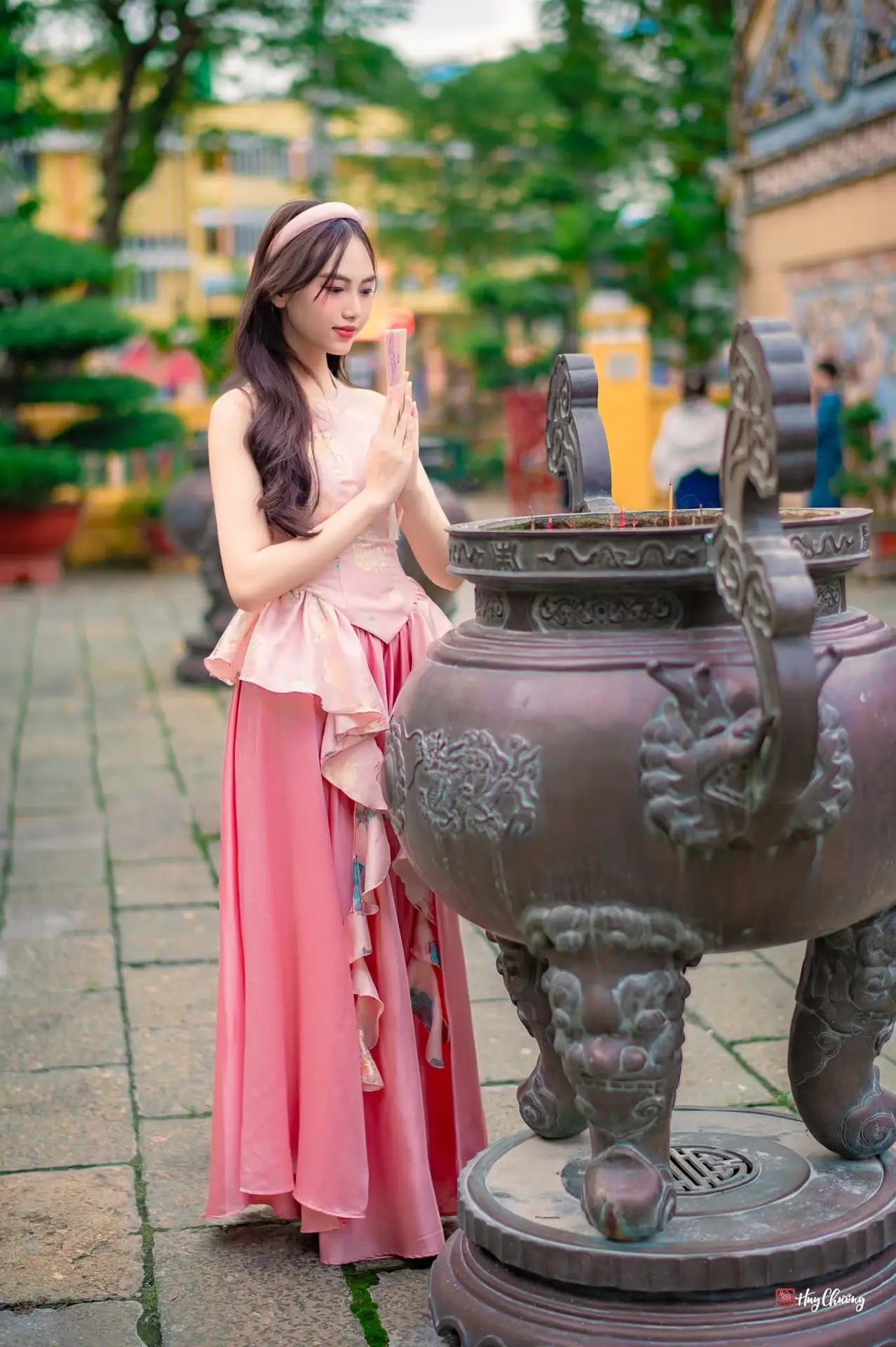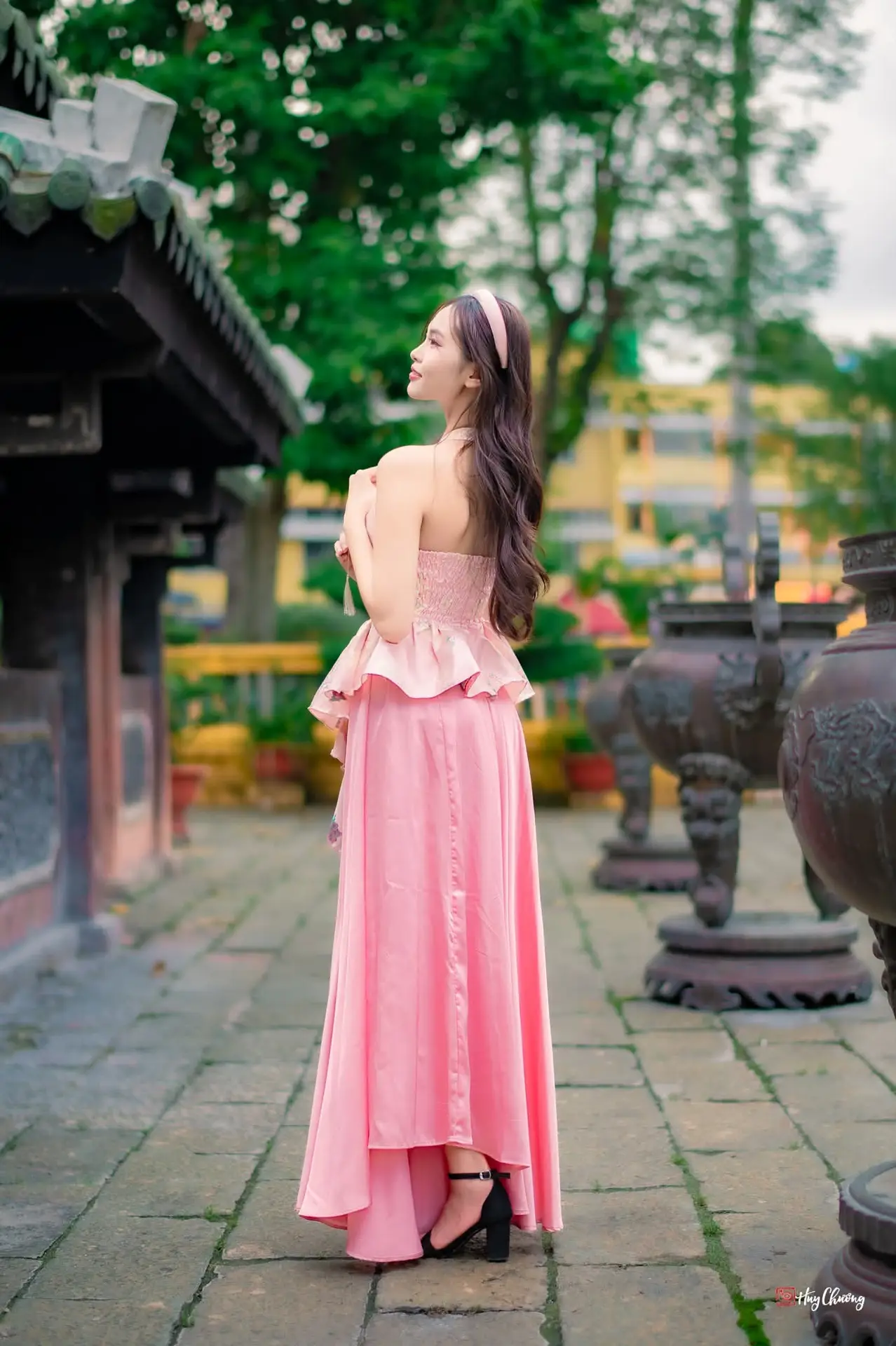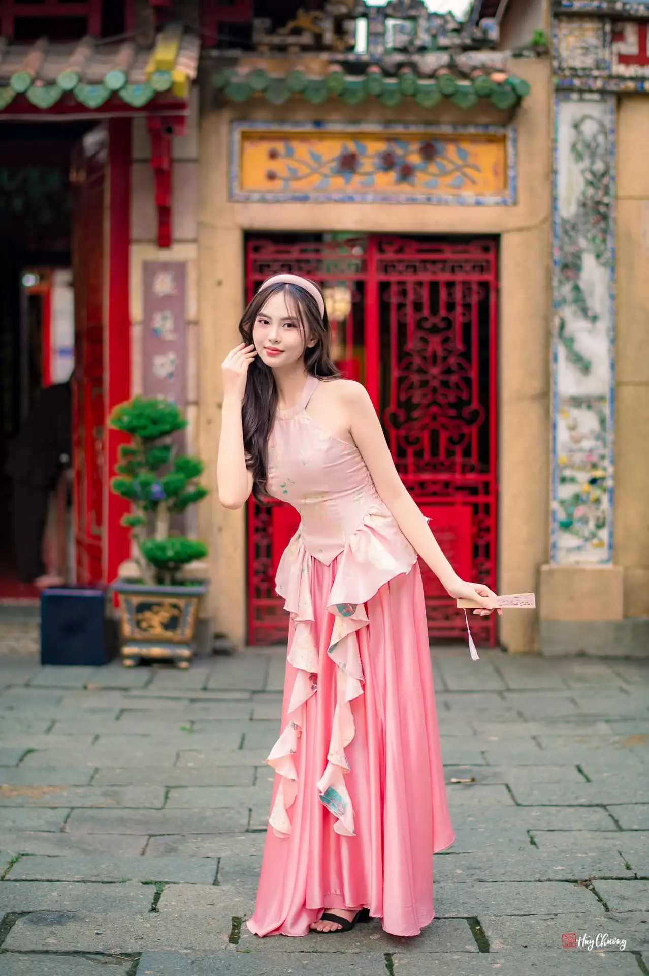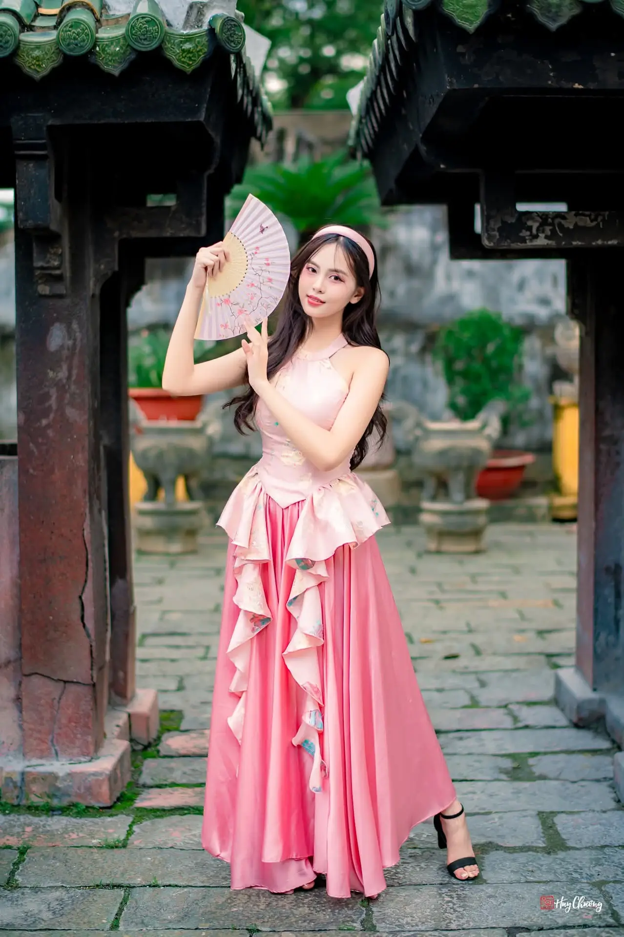 This captivating photograph features a graceful young woman adorned in a delicate pastel pink dress exuding an air of gentle beauty and elegance. Her attire with its intricate ruffles and flowing lines not only accentuates her slender figure but also adds a touch of fluidity to her pose. The backdrop showcases stunning ancient architecture characterized by vibrant red doors and traditional motifs evoking the rich cultural essence of an East Asian setting perhaps Hoi An Ancient Town or a historic temple. The harmonious blend of the womans contemporary elegance and the timeless beauty of the surroundings creates a vibrant and enchanting visual narrative. Holding a delicate fan her gaze is thoughtful as if sharing a story that bridges the past and the present. This image perfectly encapsulates sophistication charm and a deep appreciation for cultural heritage.#VietnameseBeauty #PinkDress #AncientArchitecture #CulturalHeritage #ElegantStyle