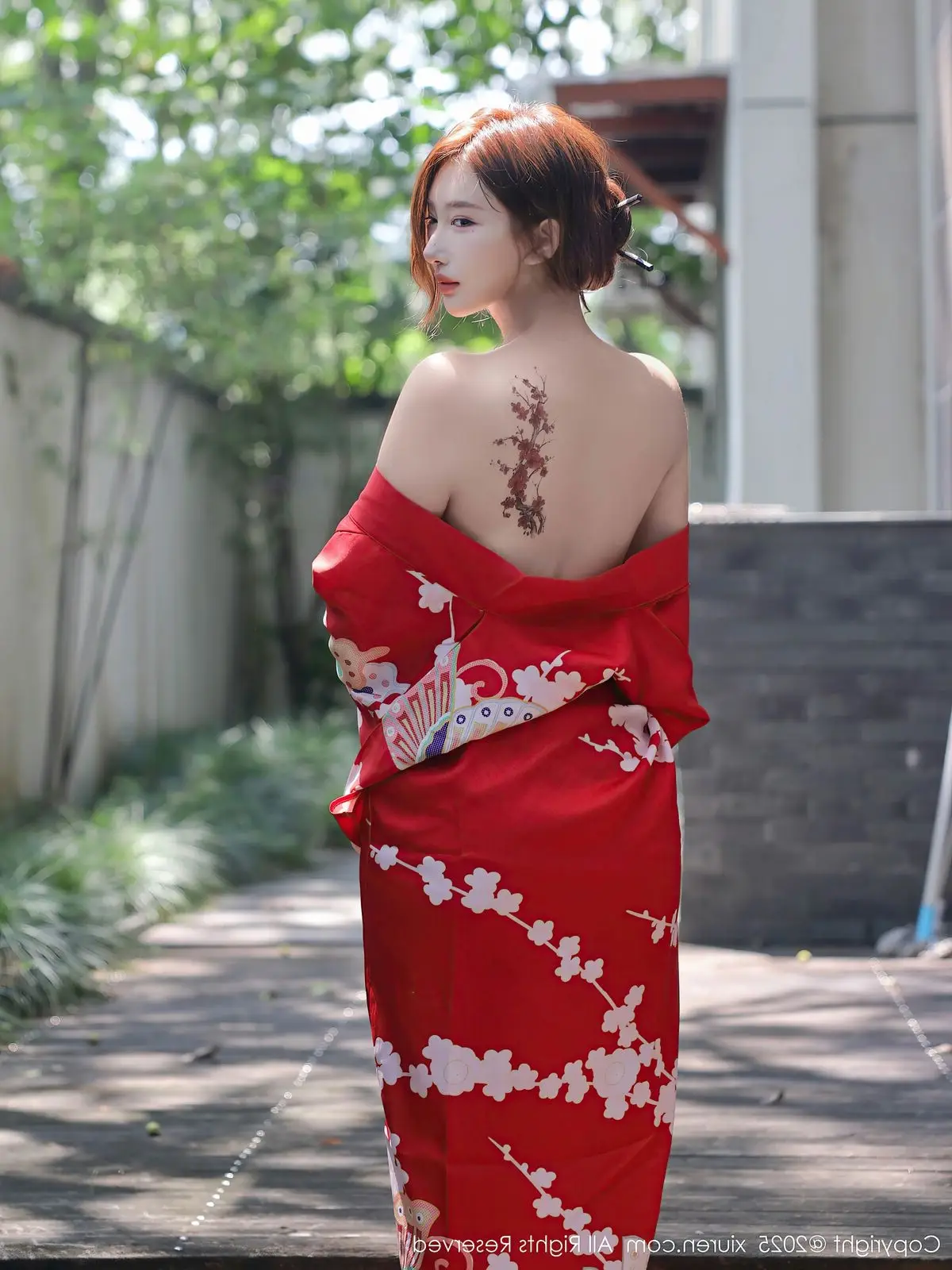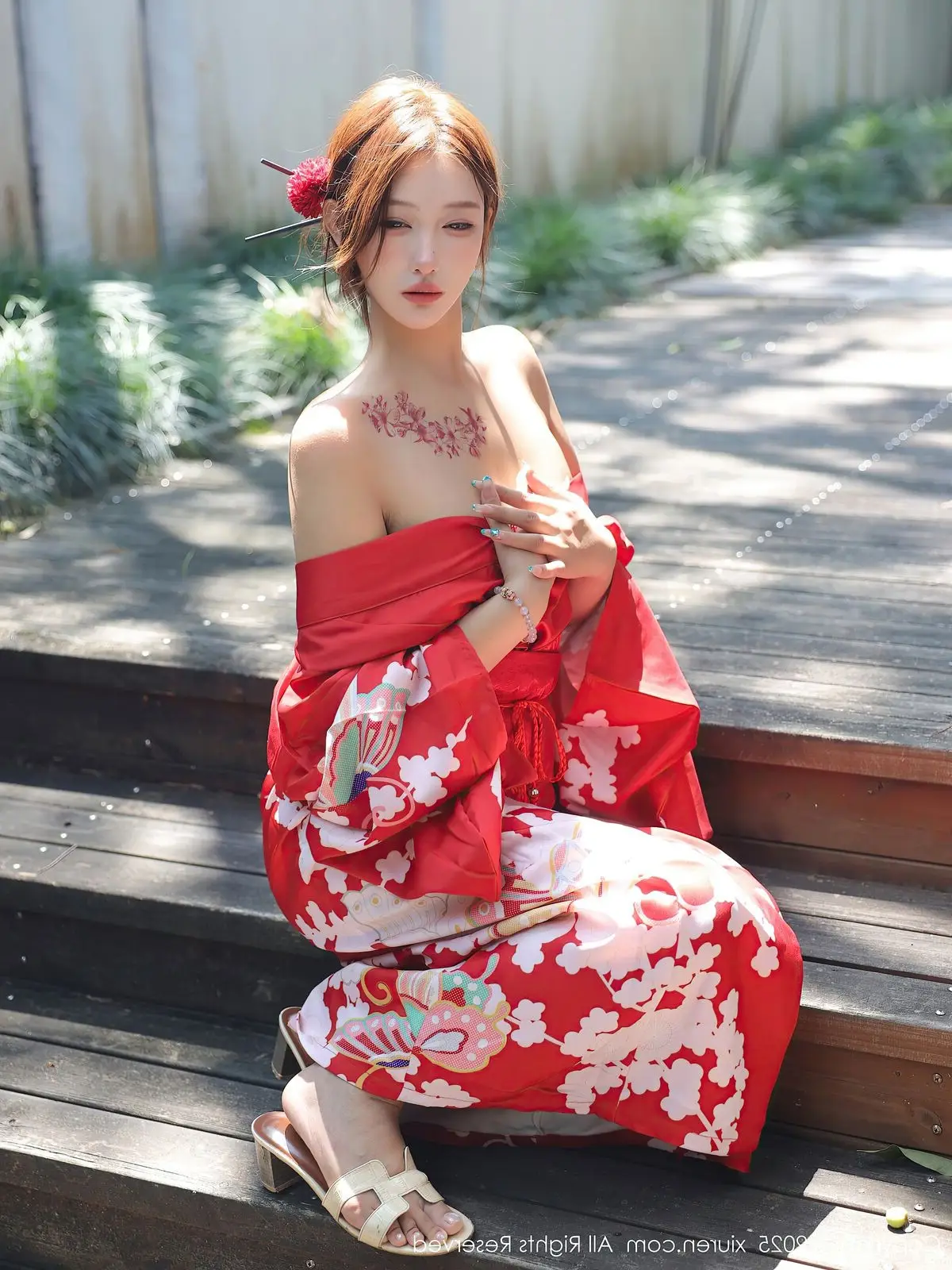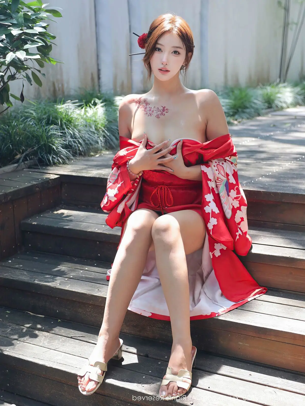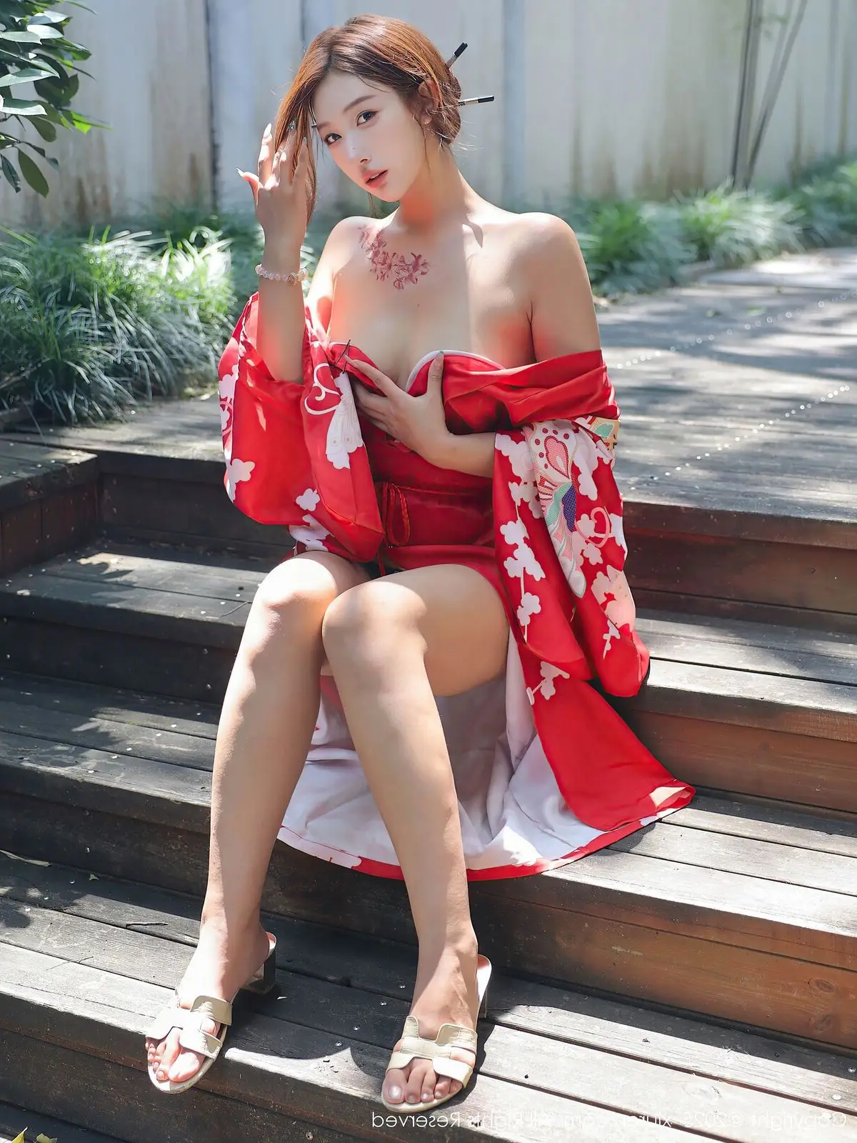 Jin Yun Xi Yuki radiates brilliantly in a traditional red kimono, yet styled with captivating allure. The striking red hue, adorned with delicate white floral patterns, highlights her graceful and elegant beauty. The kimono is artfully draped, revealing alluring bare shoulders, creating a harmonious blend of classic charm and modern appeal. Jin Yun Xi Yuki’s captivating gaze and confident demeanor make it impossible for viewers to look away. She stands on wooden steps amidst a lush green setting, forming a picturesque and enchanting scene. This is not merely a fashion photograph but a sophisticated expression of East Asian beauty, exuding an irresistible charm.#JinYun #XiYuki #RedKimono #AsianBeauty #XiuRenNo10683 #SeductiveFashion