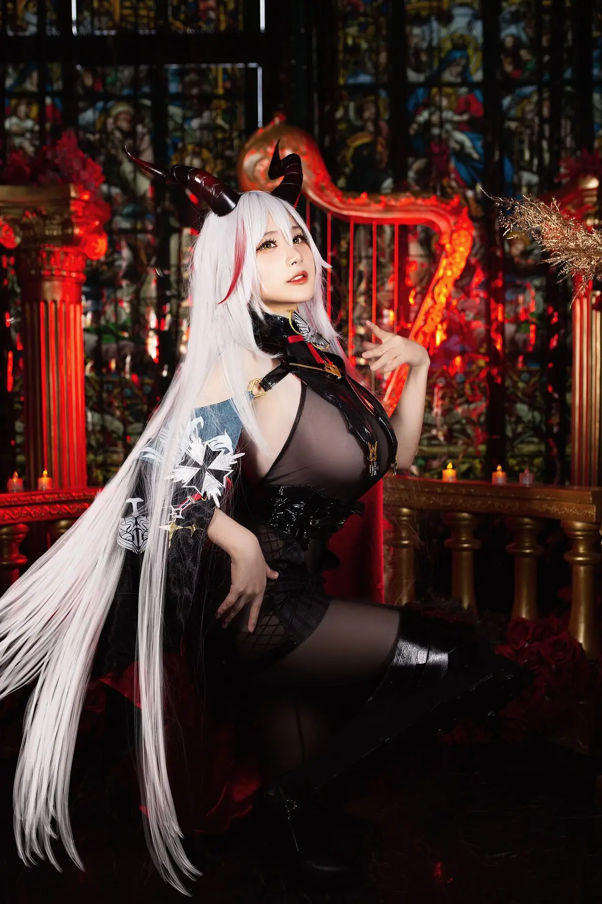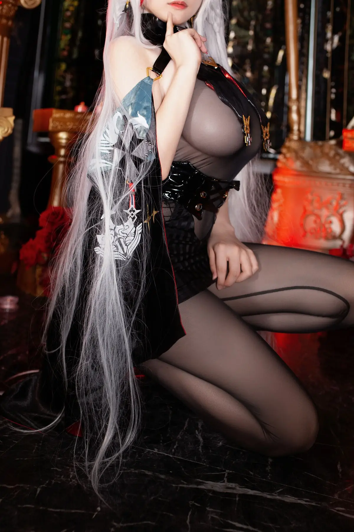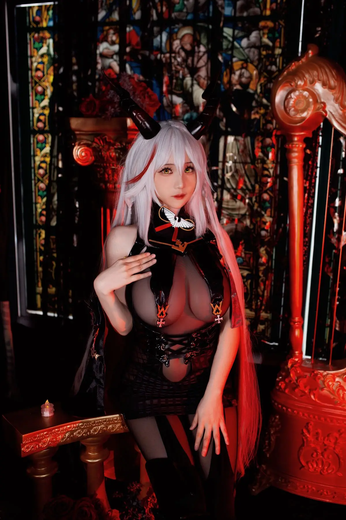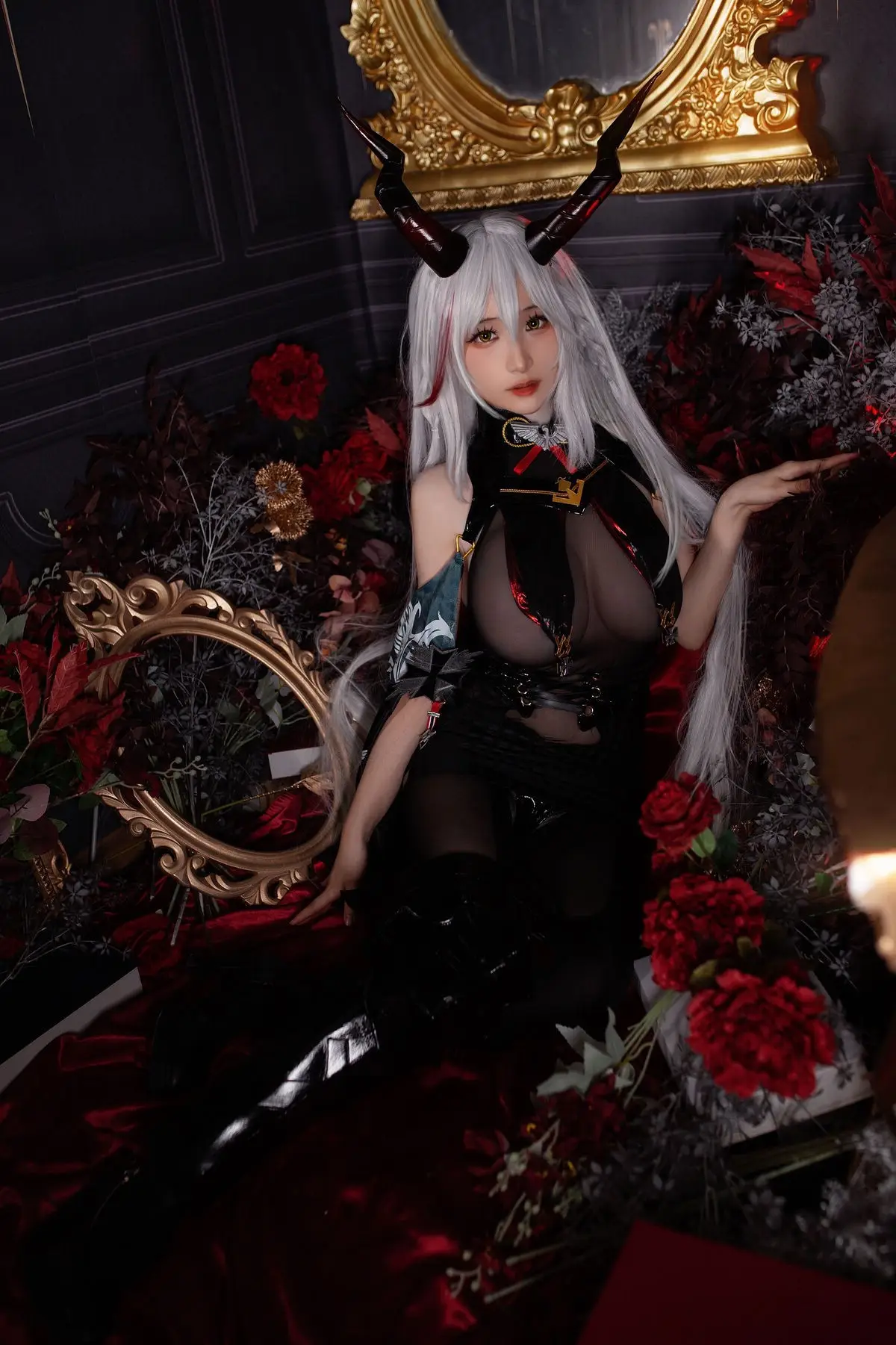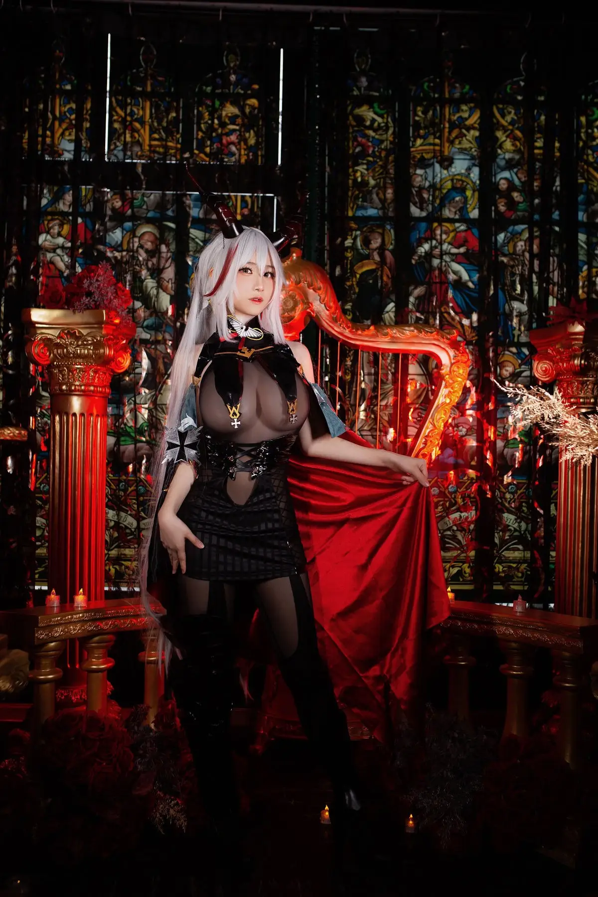 In this striking photo collection Coser Youmeko masterfully brings to life the character Ägir from the popular game Azur Lane. Dressed in a sophisticated dark ensemble complemented by a dramatic flowing red cape she embodies a powerful and enigmatic warrior. The luxurious setting featuring classic furnishings and atmospheric lighting further enhances Ägir's noble and mysterious allure. Every detail from the intricate costume to Youmeko's captivating expression is flawlessly executed presenting an Ägir that is both formidable and alluring drawing every gaze. This is a truly impressive transformation showcasing the cosplayer's dedication and talent.#Coser #Youmeko #AzurLane #ÄgirCosplay #GameCosplay #FantasyCharacter