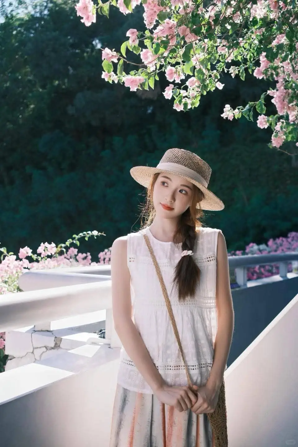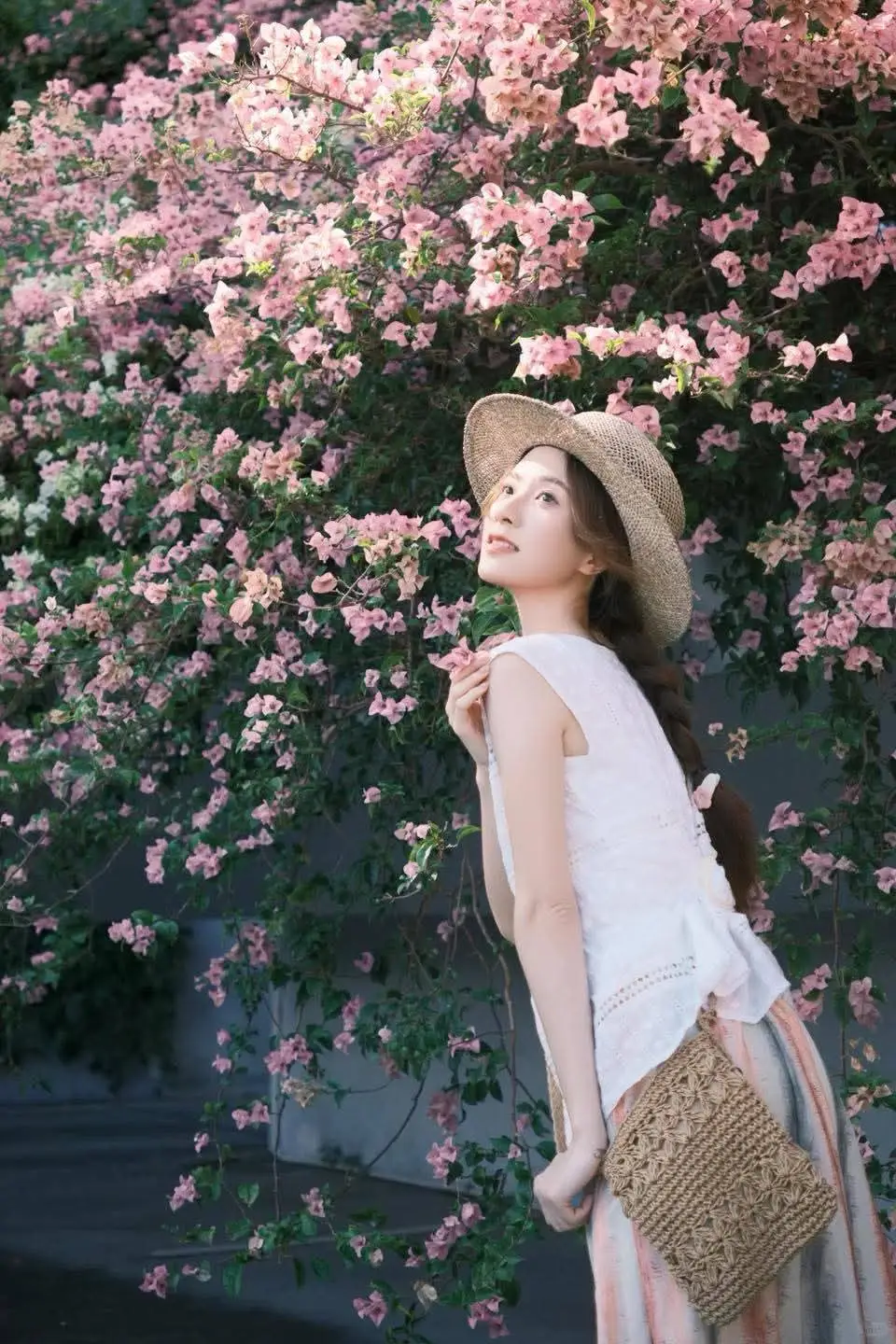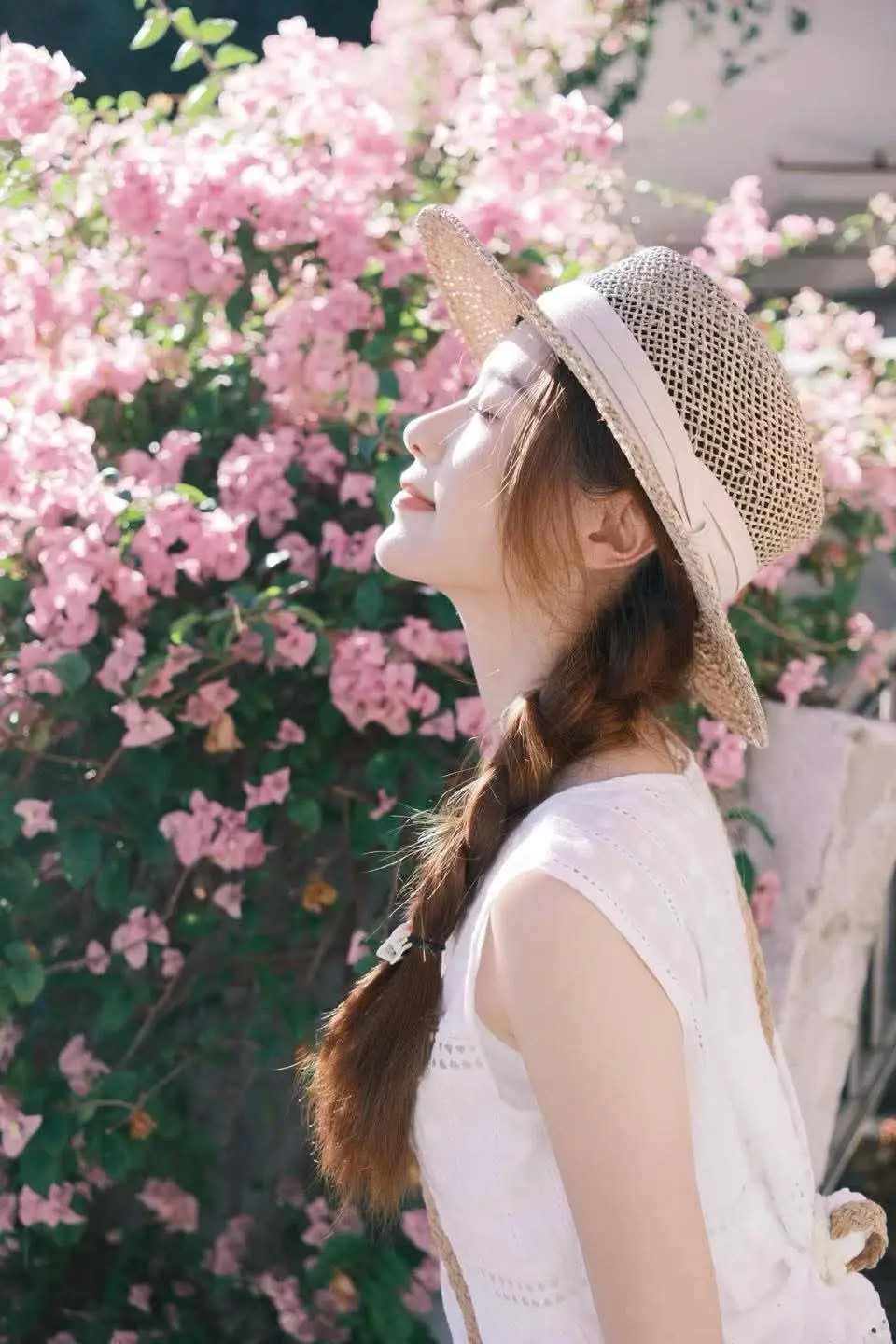 VGU No.174: Youthful Charm of a Girl in a Straw Hat Amidst Blooming Pink Flowers Under Summer Sun