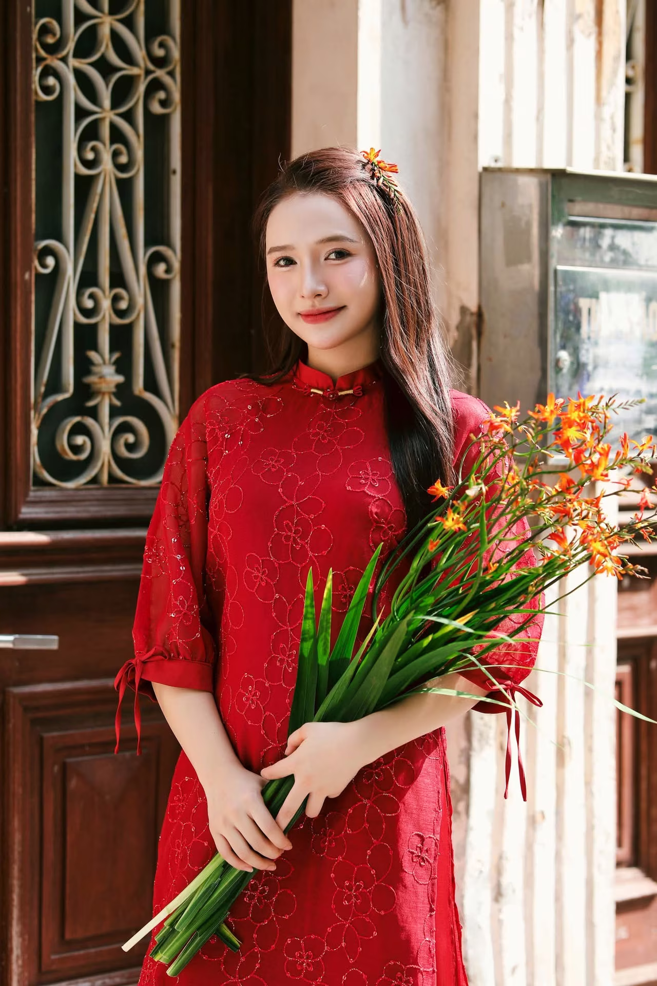 This VGU No.30 image captures the radiant beauty of a young and graceful woman She wears an elegant offshoulder black and white polka dot dress exuding a sweet and chic fashion style In her hands she holds a fresh bouquet of pink flowers adding to her gentle charm The backdrop is a stunning wall of vibrant colorful flowers creating a lively and enchanting setting From cheerful yellow blossoms to romantic pink and purple hues all blend harmoniously to highlight the girl's exquisite features This photograph beautifully combines fashion and nature radiating joy freshness and the pure essence of youth It is a true inspiration for those who appreciate softness and romance #Vietnamese #pretty #charmVGU No.27: Radiant Smile in Red Ao Dai, Capturing Vietnamese Traditional Beauty