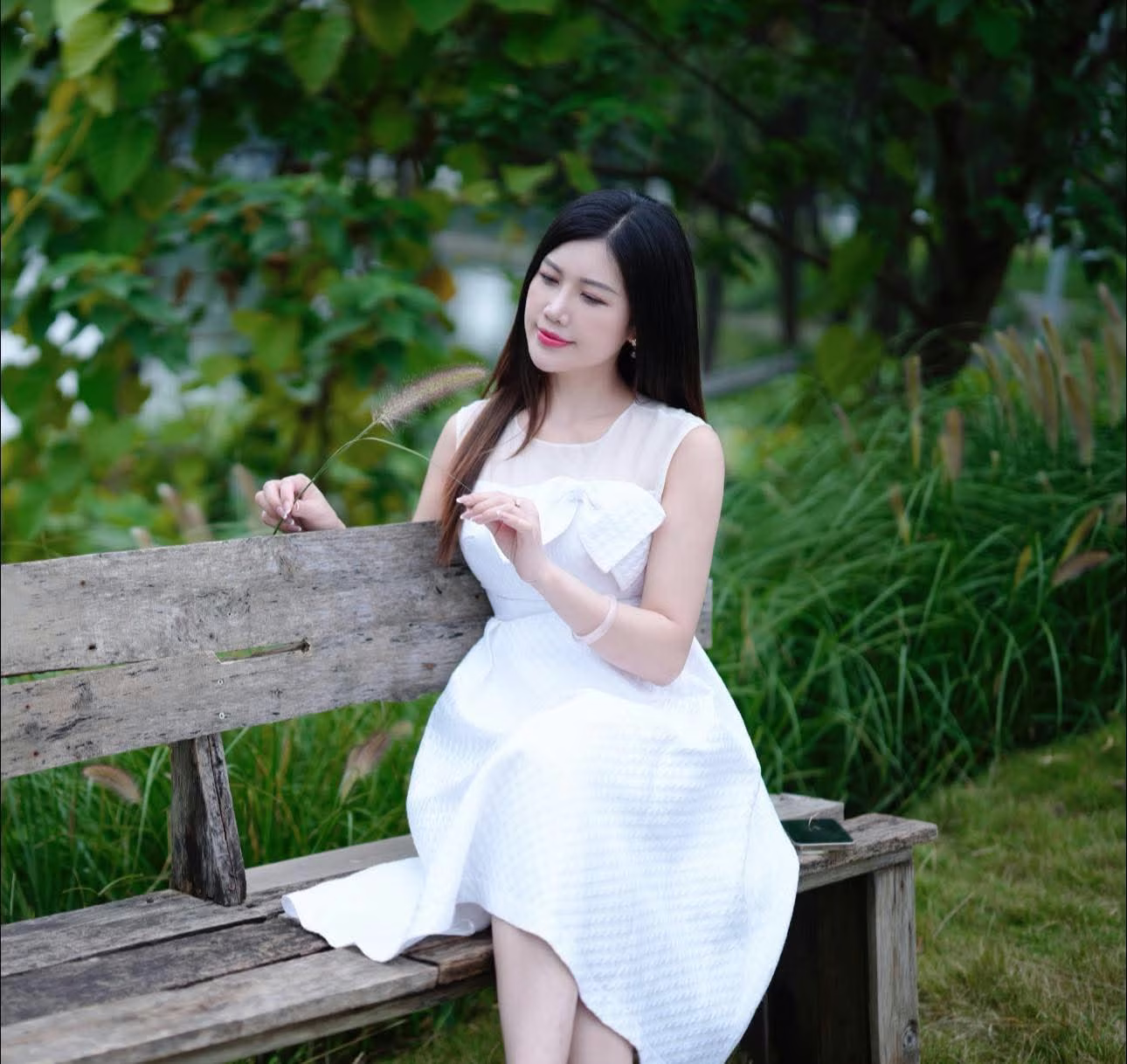 In this captivating VGU No.159 image, a young woman embodying pristine beauty sits gracefully on rustic wooden steps, enveloped by a lush, vibrant garden. Her elegant white dress beautifully complements her radiant smile, exuding an aura of gentleness and peace. Surrounding her are verdant trees and a kaleidoscope of colorful flowers, creating a truly picturesque and serene setting. This moment invites viewers into a world of tranquility, where natural splendor harmonizes perfectly with human grace. The photograph not only captures a stunning visual but also conveys a sense of freshness and the simple joy of life.#VGU #Garden #Beauty #SereneMoments