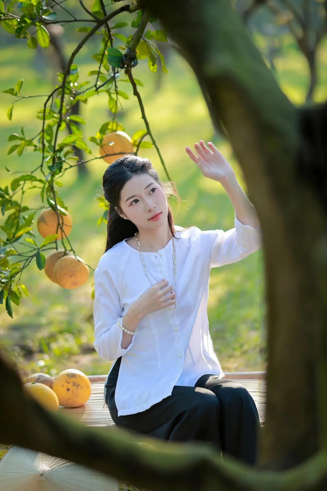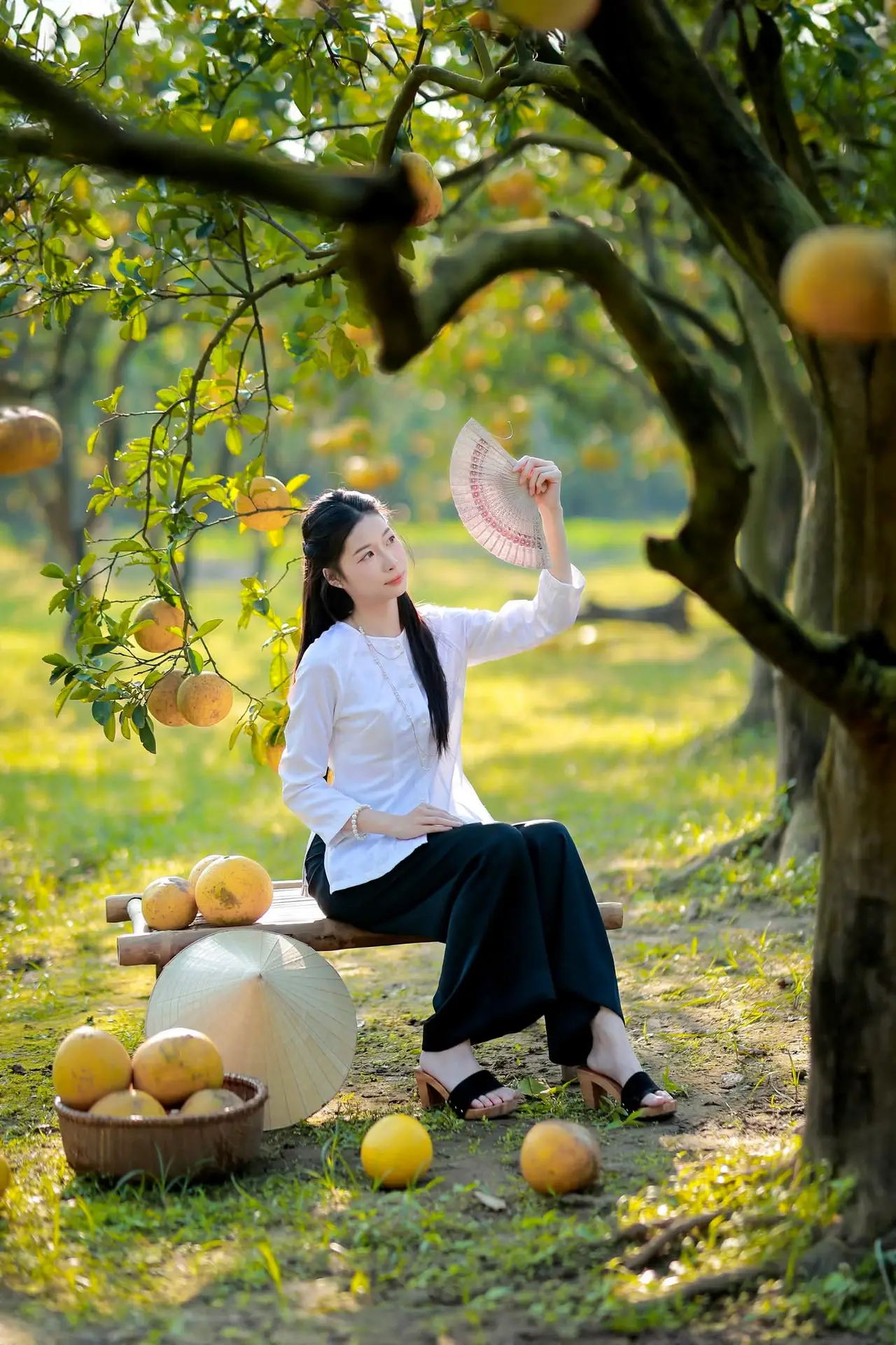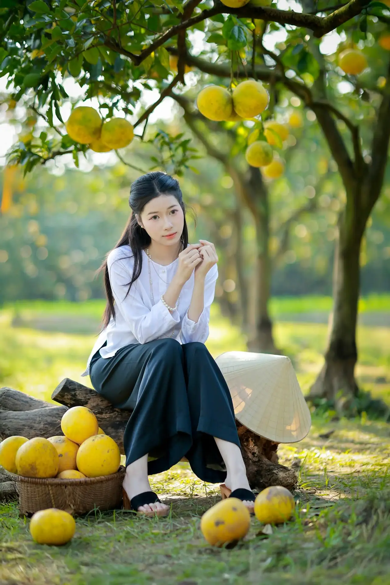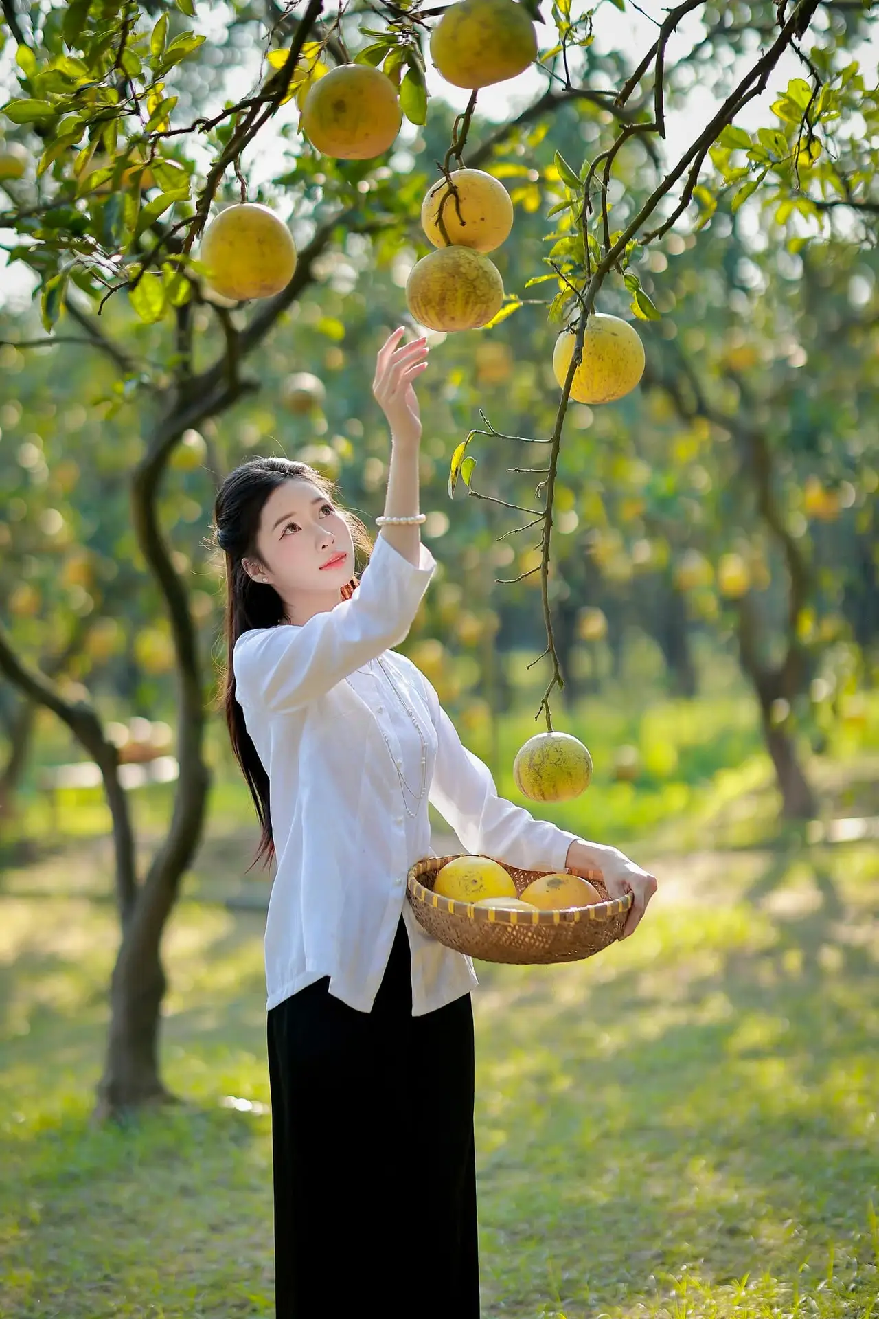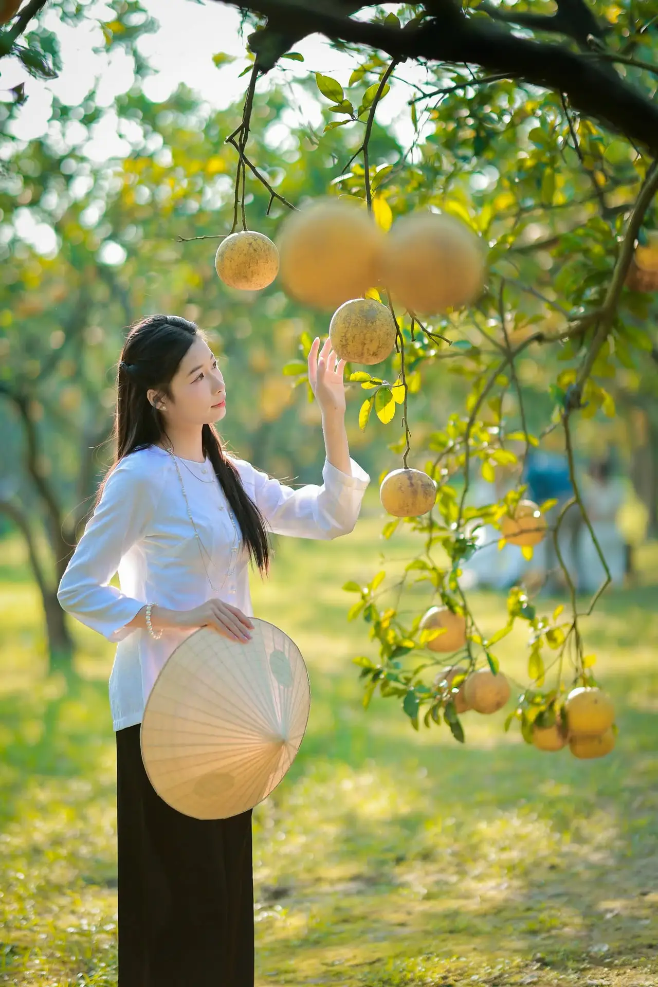 The images captures a beautiful young woman in a pristine white outfit gently touching ripe pomelos on a branch. Her delicate features and soft gaze blend perfectly with the lush green surroundings of the orchard. Golden sunlight filtering through the leaves creates a serene and poetic scene, highlighting her natural beauty and purity. This image not only evokes the freshness of youth but also showcases the rustic charm and grace of a Vietnamese girl amidst untouched nature. It is a peaceful moment brimming with vitality, offering a sense of relaxation and simplicity.#VietnameseGirl #YouthfulBeauty #PomeloGarden #FreshNature #PeacefulVibes