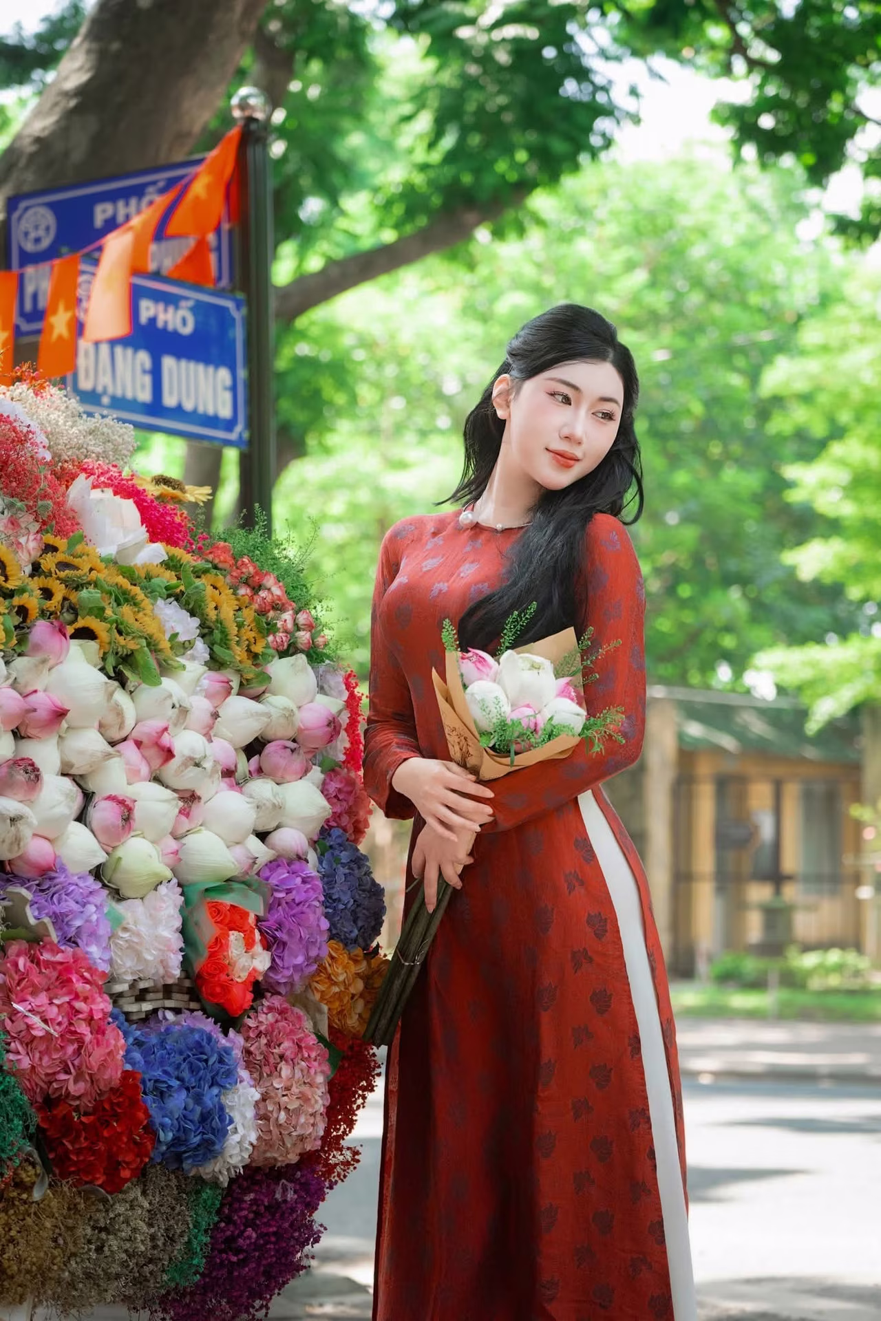 VGU No110 captures a beautiful moment of a graceful Vietnamese woman in a pristine white Ao Dai. Her radiant smile and gentle eyes blend seamlessly with the vibrant street adorned with red flags featuring the yellow star a sacred symbol of Vietnam. Holding a traditional fan embellished with the national flag motif she embodies national pride and traditional cultural beauty. This image transcends mere attire; it symbolizes the profound patriotic spirit elegance and distinctive charm of Vietnamese women evoking feelings of pride and admiration for the rich heritage. #Vietnamese #pretty #charmVGU No.109: Admire the Graceful Vietnamese Ao Dai Amidst a Sea of Vibrant Flowers