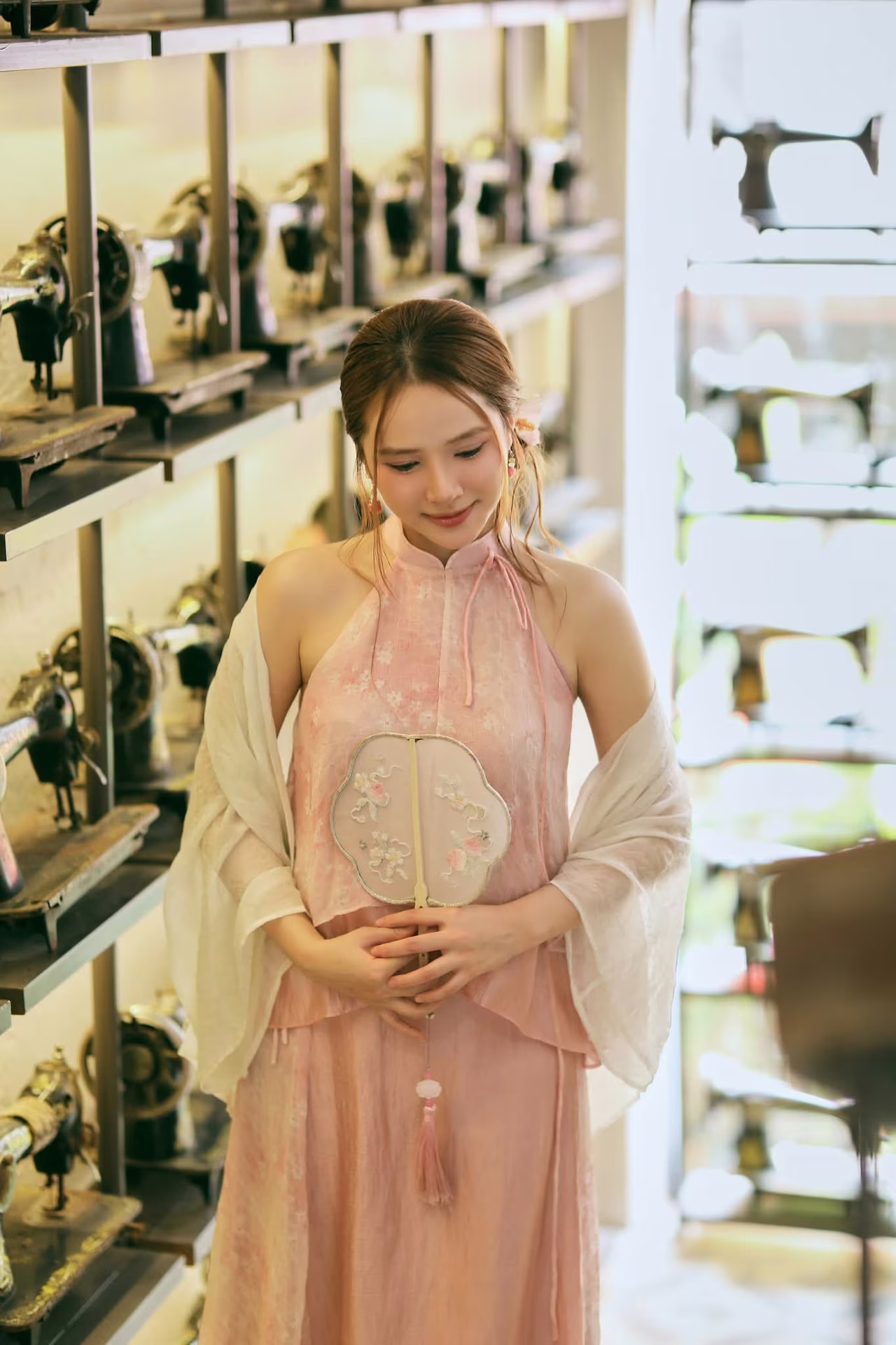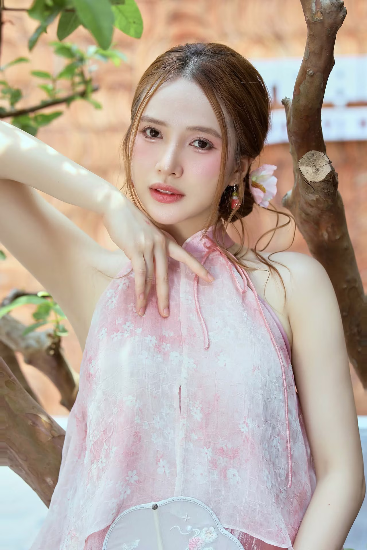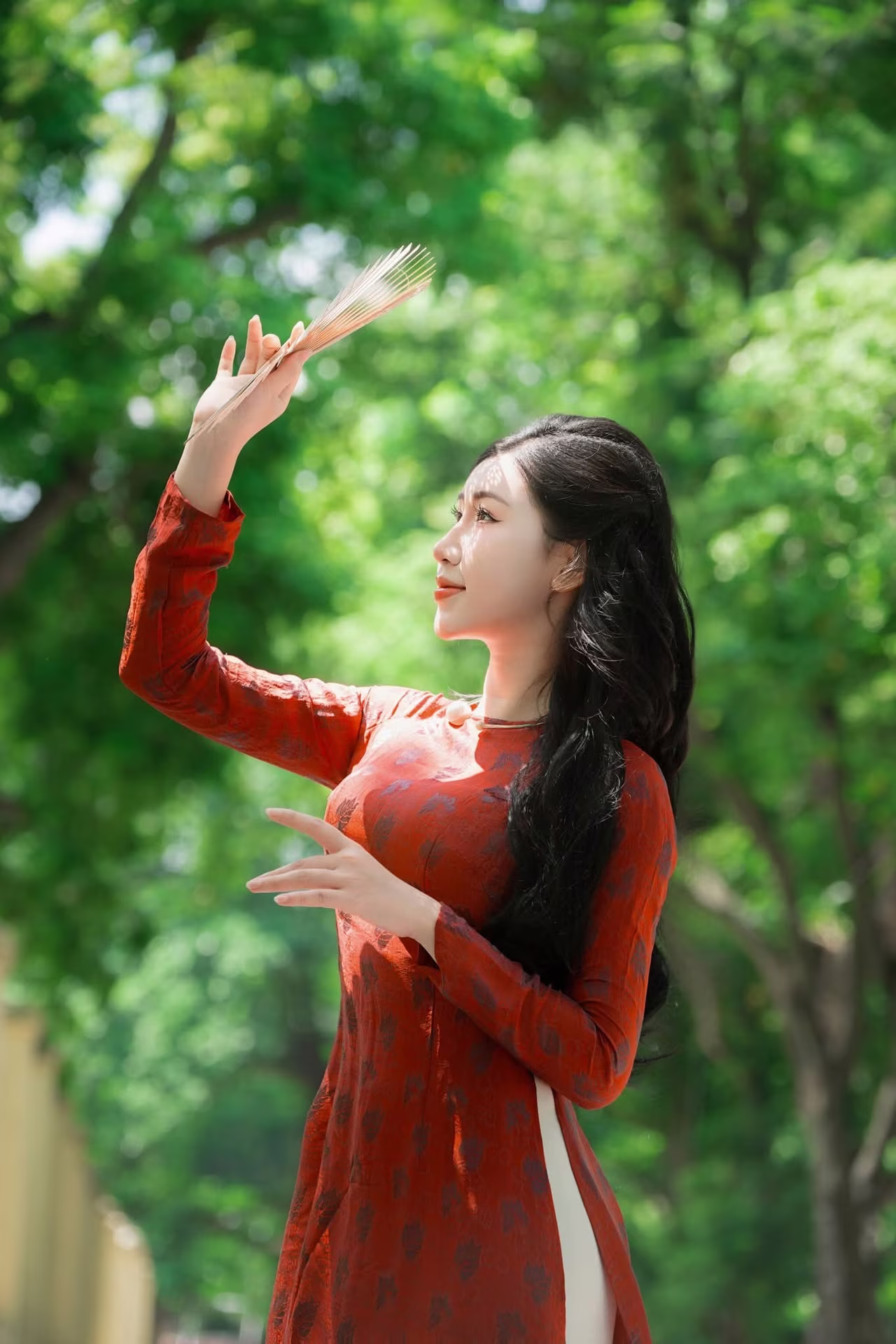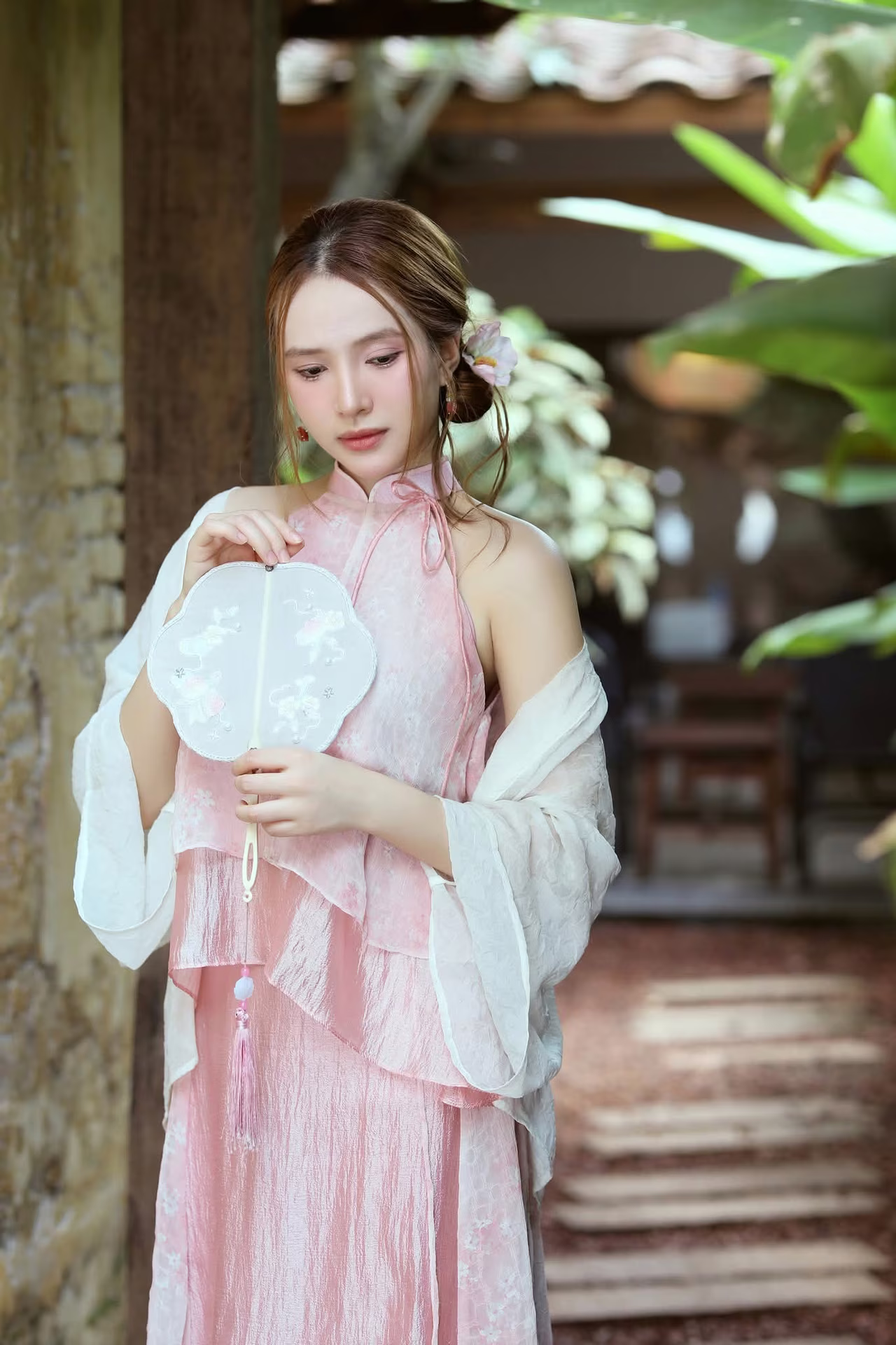 The image VGU No.107 beautifully captures an Asian muse with a delicate, gentle, and utterly captivating charm. The young woman is adorned in an outfit inspired by traditional aesthetics, featuring soft pastel pink layers complemented by a pure white sheer shawl, creating an ensemble that is both graceful and elegant. Her flowing brown hair is subtly embellished with a pristine white flower, while a cherry blossom patterned paper fan held gently in her hand further enhances her classic and romantic allure. Her dreamy gaze, directed softly into the distance, suggests she is lost in poetic thought, evoking a sense of peace and enchantment. Her pure and ethereal beauty seems to blend seamlessly with the lush green backdrop, forging an artistic moment rich in emotion and captivating appeal, leaving viewers utterly mesmerized. #Vietnamese #pretty #charmVGU No.106: Elegant Vietnamese Woman in Red by Hoan Kiem Lake, Hanoi's Traditional Beauty