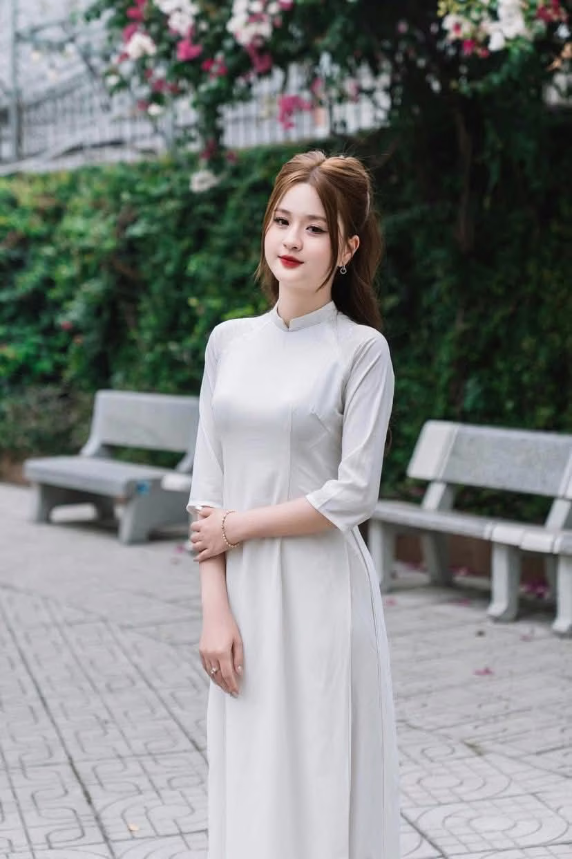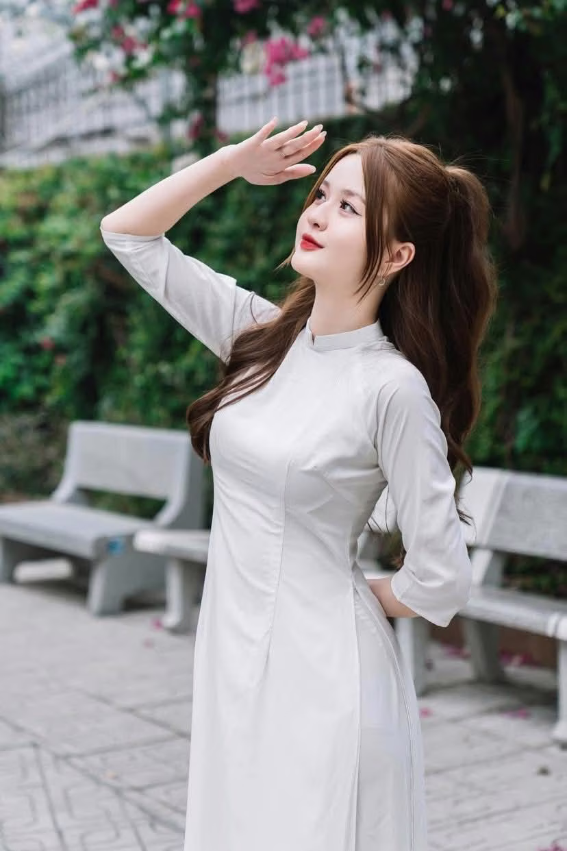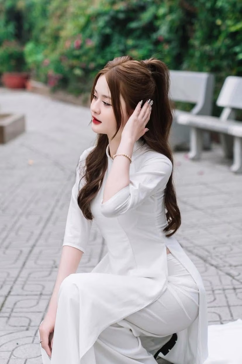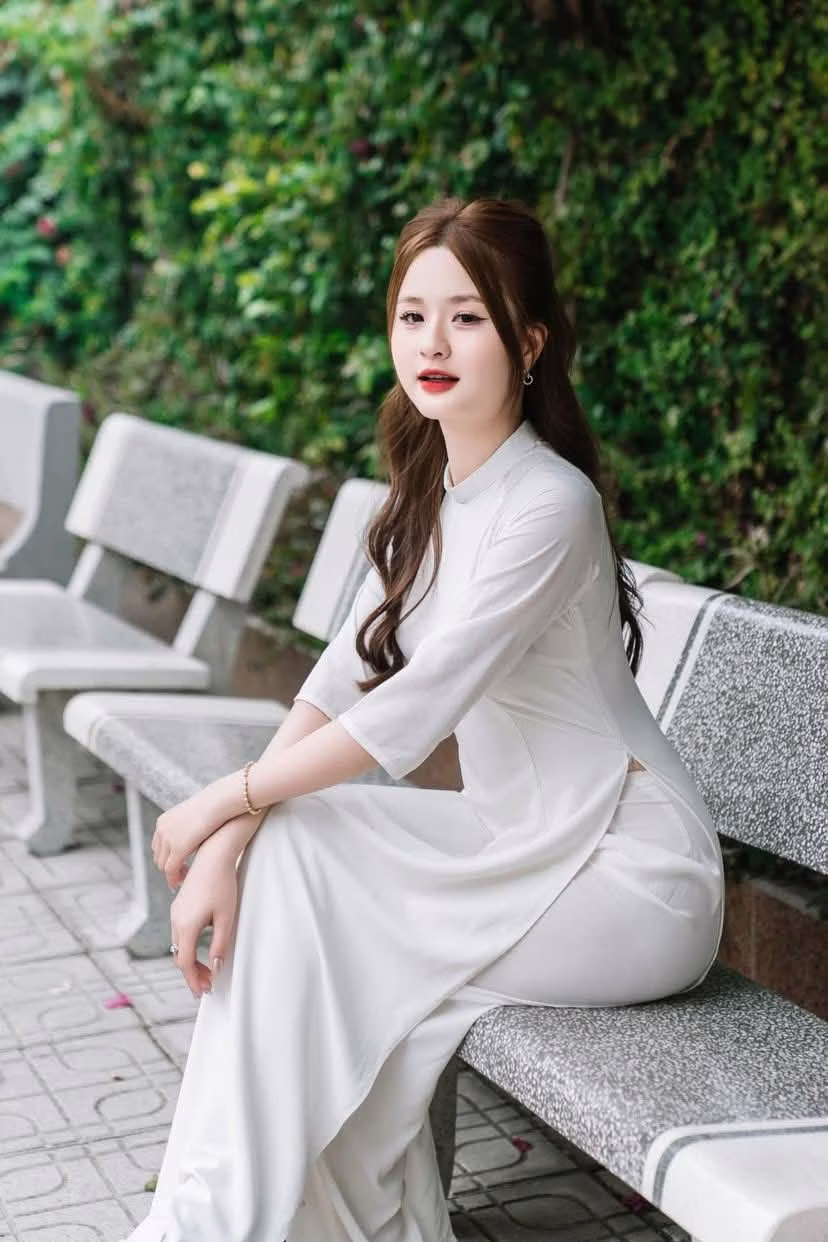 This photo captures a gentle moment of a Vietnamese girl in a pristine white ao dai. She sits gracefully on a stone bench, her long hair flowing down, and a charming smile, exuding elegant beauty and tranquility. The ao dai is not just an outfit but also a cultural symbol, honoring the grace and gentleness of Vietnamese women. The lush green background enhances the pure beauty and serene demeanor of the girl. This is an emotional image, evoking admiration for traditional beauty and radiant youth. This moment is like an invitation to admire the simple yet captivating charm of the ao dai in everyday life. #Vietnamese #pretty #charmVGU No.104: The Gentle Charm of Áo Yếm Nón Lá – Timeless Vietnamese Beauty