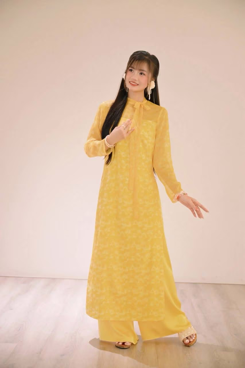 This stunning photograph captures a graceful young woman adorned in a traditional bright yellow Ao Dai, standing out beautifully against a vibrant backdrop of lotus flowers. The golden hue of the Ao Dai symbolizes prosperity and brightness, harmonizing with the pure pink of the lotus blooms to create a picture rich in Vietnamese culture. A delicate Vietnamese flag pin on her chest adds a subtle touch, reflecting patriotism and national pride. More than just an outfit, the Ao Dai is an emblem of the elegant and gentle beauty of Vietnamese women. The image evokes a sense of peace and dignity, celebrating cherished traditional values. #Vietnamese #pretty #charmVGU No.113 Elegant Vietnamese Girl in Blue Ao Dai Captures Timeless Beauty Amidst Nature Serenity