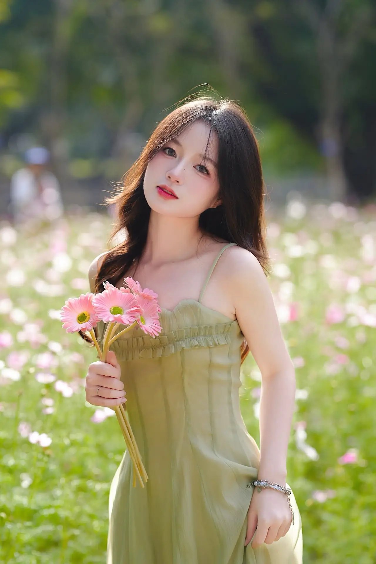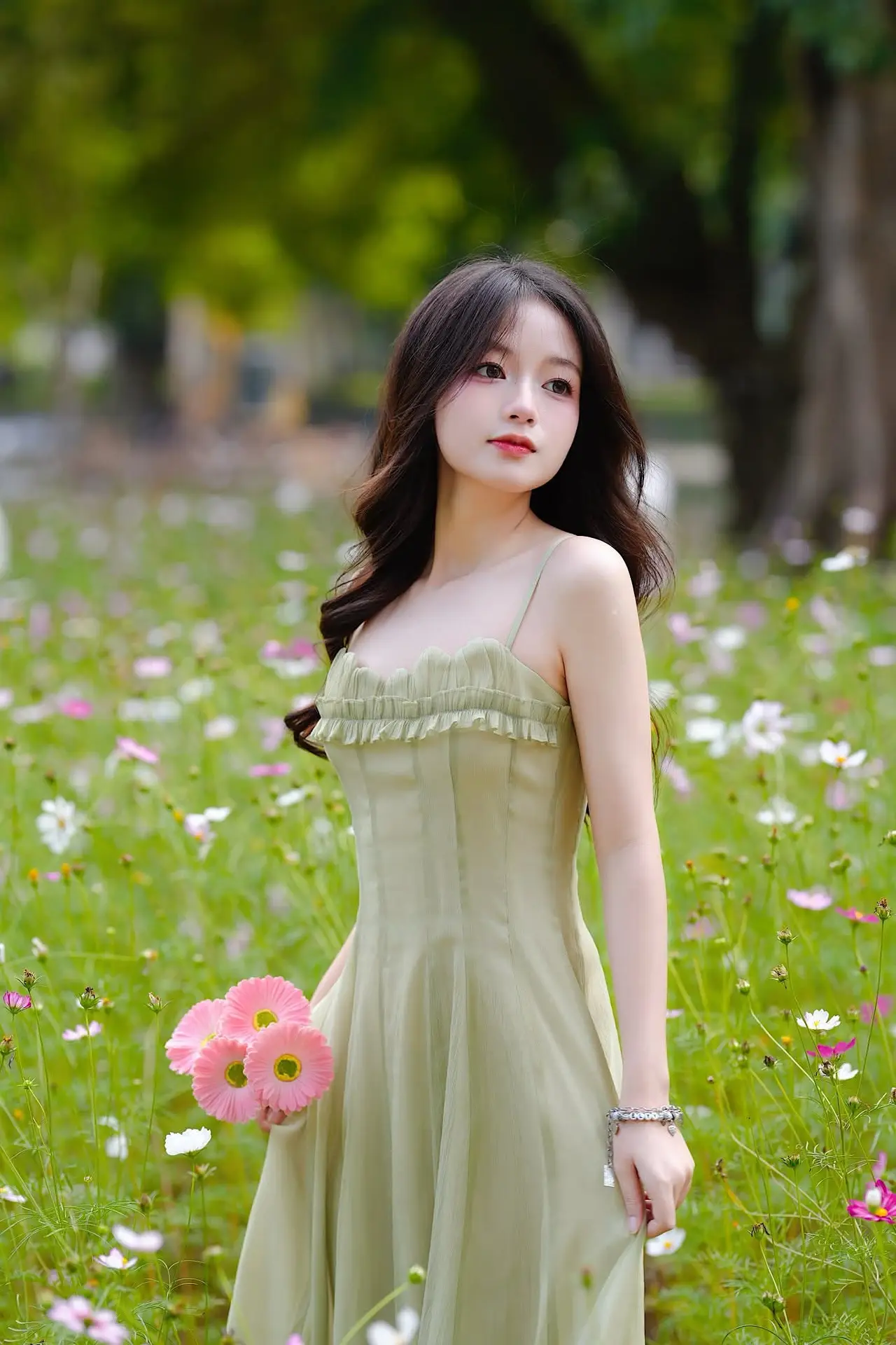 This captivating image features a beautiful young woman exuding gentle charm with her flowing long hair and captivating gaze. She is dressed in an elegant light green dress, highlighting her slender figure. In her hands, she delicately holds a fresh pink flower, adding a sweet touch. The backdrop is an old train track, evoking a sense of nostalgia, surrounded by lush ancient trees and bathed in natural sunlight. The photograph radiates pure beauty, a wonderful harmony between humanity and nature. It captures a serene, poetic moment, offering viewers a sense of relaxation and tranquility.#GentleBeauty #NaturalElegance #OutdoorPortrait #TrainTracks #NaturePhotography