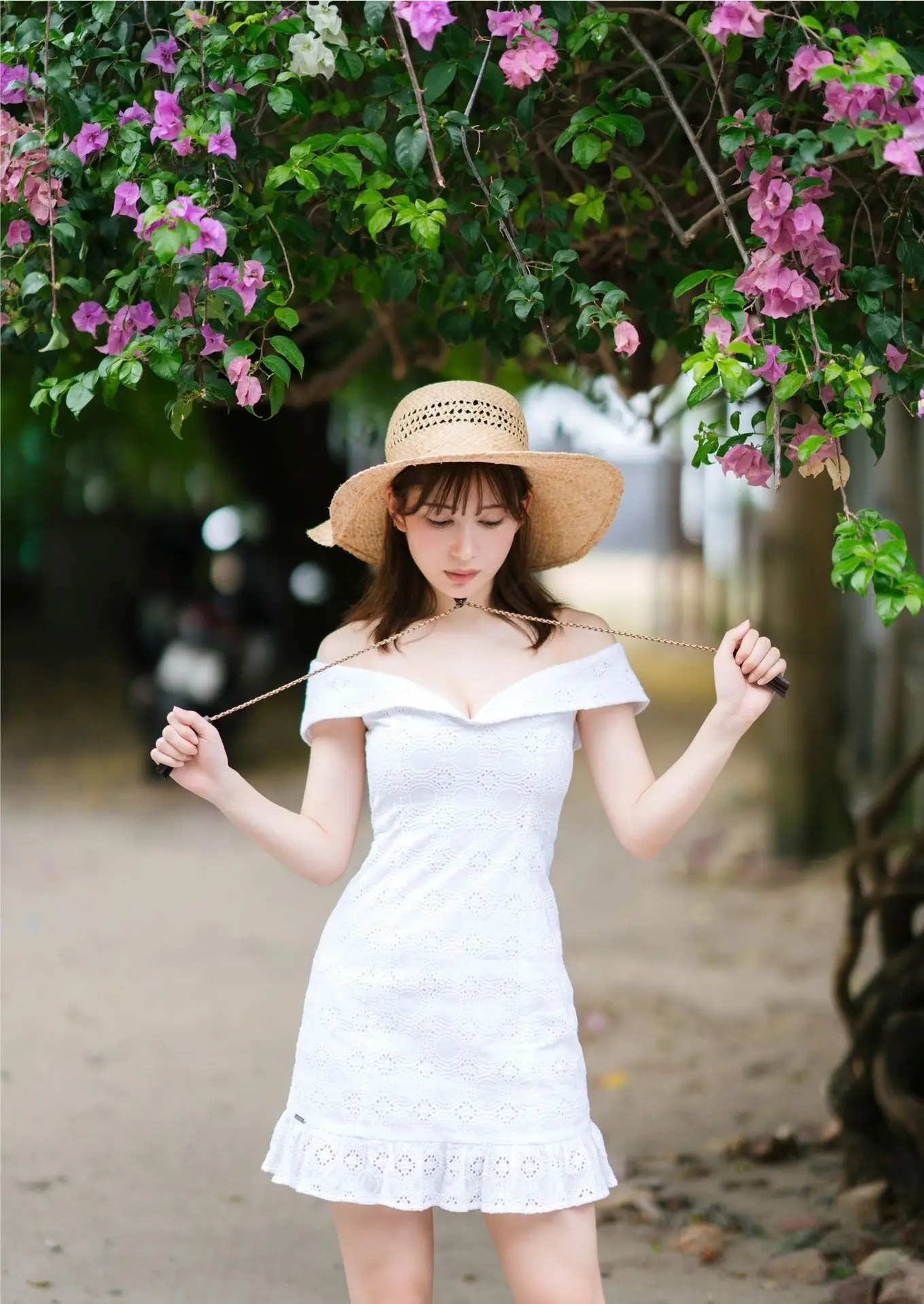 This stunning photo captures Japanese actress Yukihira Risa with her youthful and fresh beauty. The gentle lady wears a wide-brimmed straw hat, posing gracefully while gently holding the brim. Risa's clear eyes and soft, dreamy smile have the power to move hearts, truly embodying the saying 'if you smile, the whole world smiles with you'. Her pristine white outfit combined with white boots further enhances her pure and delicate charm. Surrounded by lush green foliage and delicate pink flowers, it evokes a fresh and poetic summer atmosphere. Yukihira Risa's natural beauty and gentle style in this moment truly make viewers feel a sense of peace and positive energy.