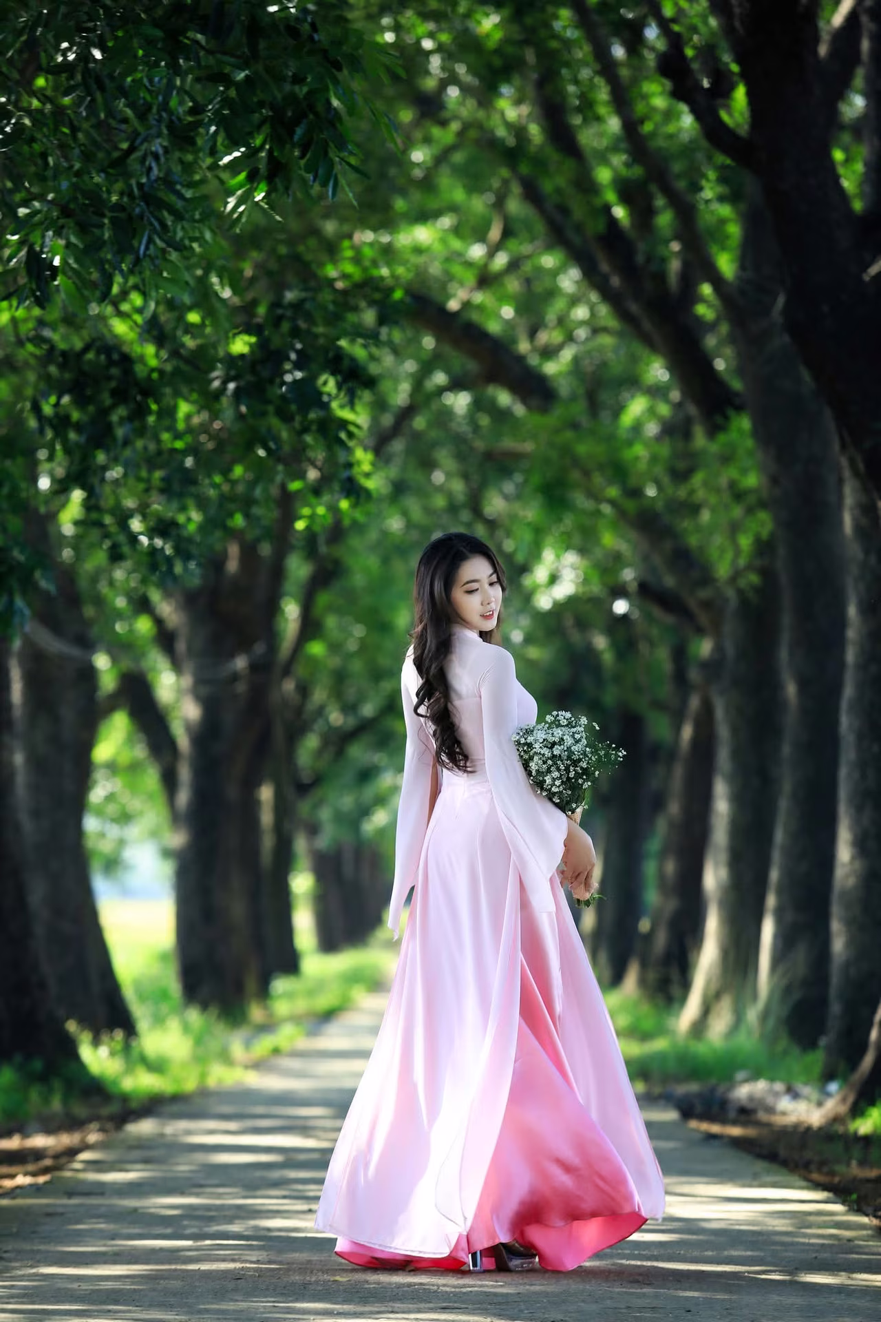 In this captivating image VGU No.150, a Vietnamese woman embodies serene grace and timeless elegance, adorned in a beautiful pink Ao Dai. She sits thoughtfully on a peaceful tree-lined path, holding a delicate bouquet of fresh white flowers, her gaze softly directed upwards as if lost in a dream. The flowing lines of her traditional dress and her long wavy hair create a poetic and tranquil scene. This photograph beautifully captures the essence of Vietnamese charm and the harmonious connection between nature and human beauty. The soft pink of her Ao Dai contrasts gently with the lush green foliage, evoking a sense of calm and romance. It is a moment of quiet reflection, where traditional allure and elegant simplicity are celebrated in a truly enchanting setting.#AoDai #Vietnamese #Beauty #Traditional #Graceful #Culture