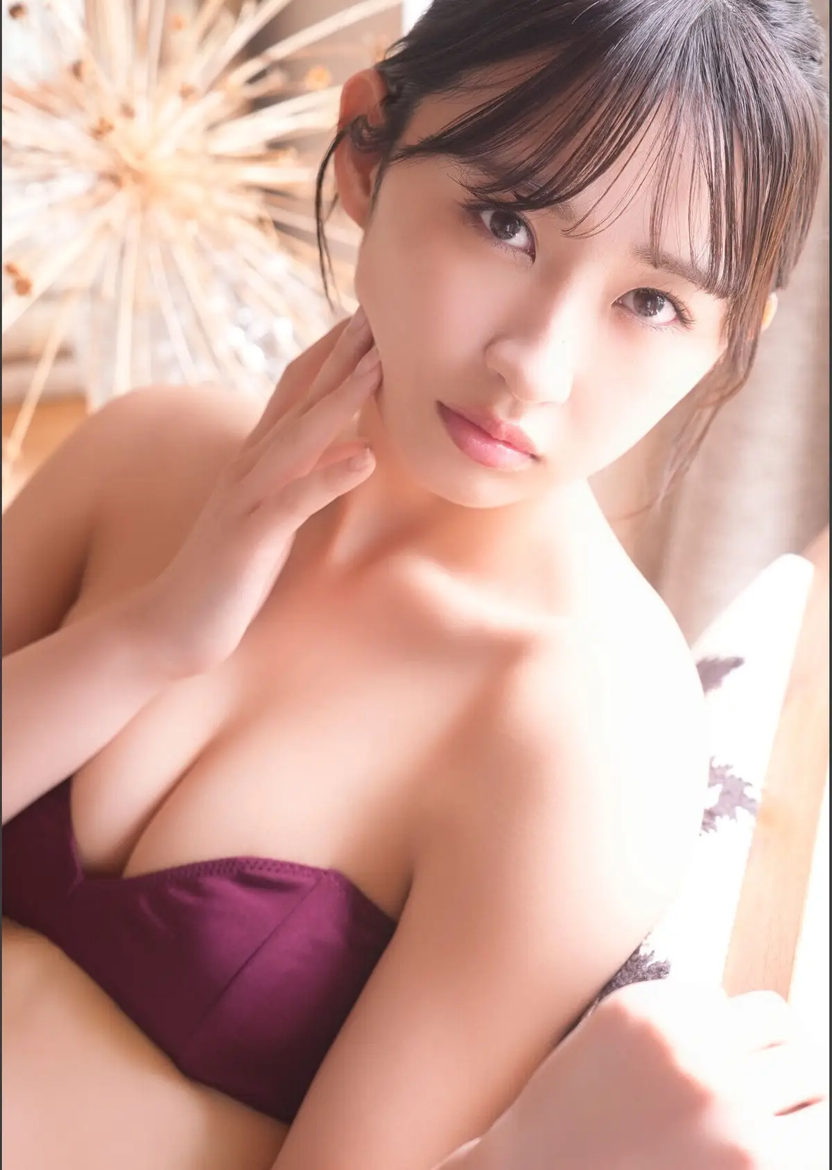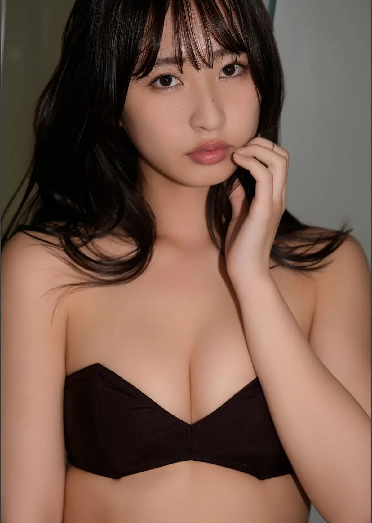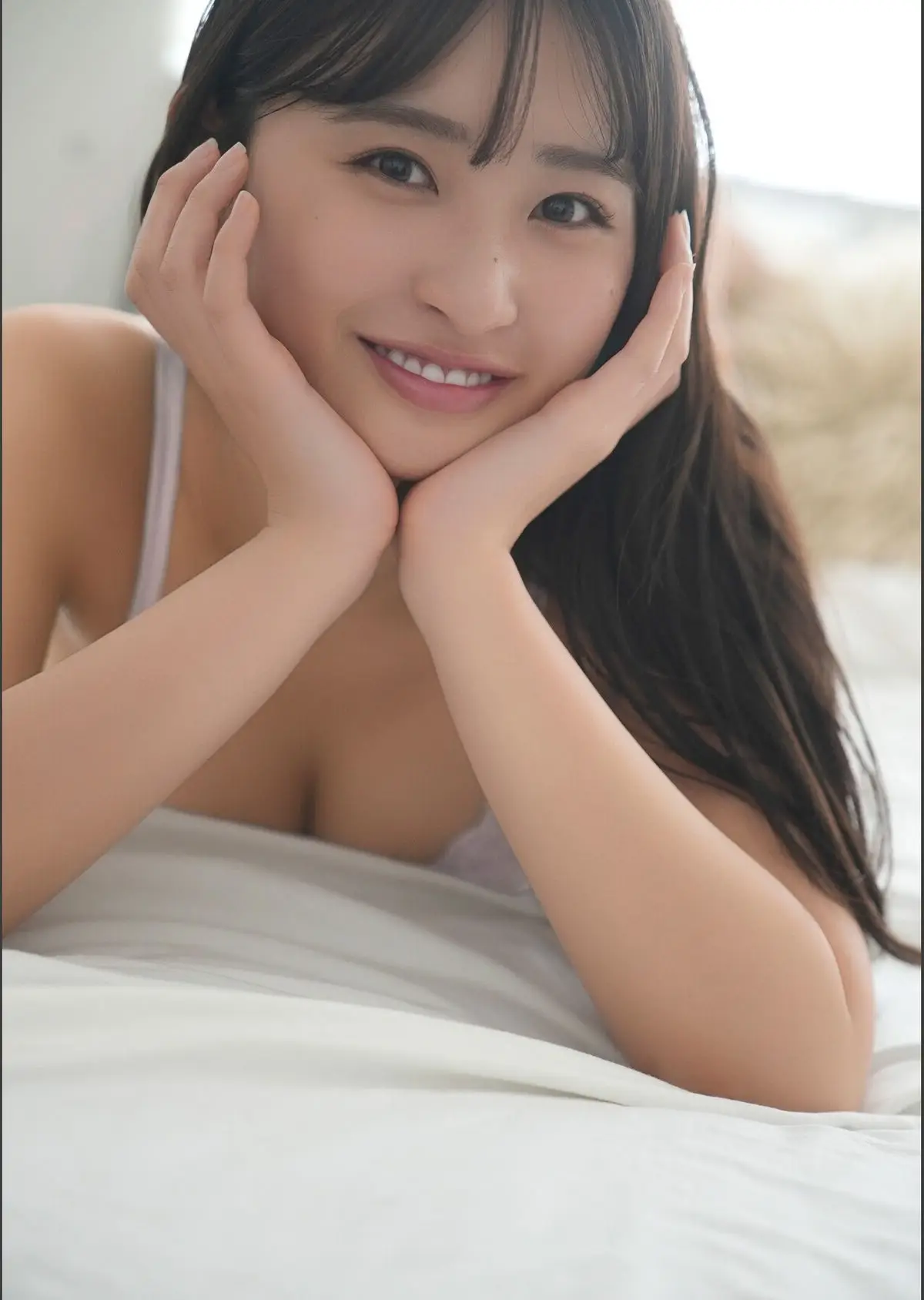 This image beautifully captures Hinata Matsumoto (松本日向) with her natural and pristine beauty. She is depicted in a simple strapless top highlighting her delicate features and smooth skin. Her gentle gaze and the graceful touch of her hand to her face create a moment of subtle contemplation and refined allure. The overall scene evokes the serene and promising feeling of a "first morning" (Hajimete no Asa) where her beauty shines most authentically. This photograph is part of the BOMB Digital Photo Book offering an intimate glimpse into Hinata Matsumoto's captivating charm and innocence.#HinataMatsumoto #MatsumotoHinata #FirstMorning #BOMBPhotoBook #JapaneseIdol