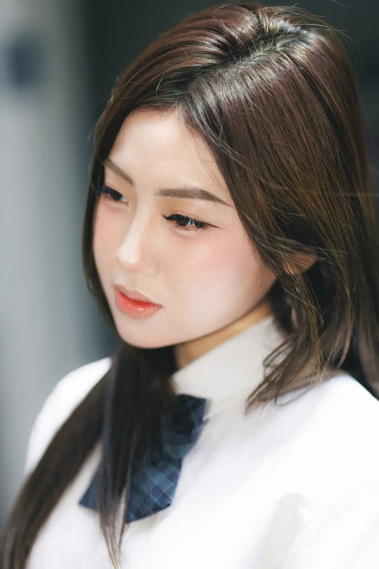Explore the graceful allure captured in XiuRen No.10287 Bu Ding WOW, featuring model Bu Ding WOW as a charming student in a classic JK uniform. With her long dark hair and thoughtful gaze, she poses elegantly at a school desk, exuding an aura of innocence combined with subtle charm. The pristine white shirt paired with a dark pleated skirt perfectly embodies the timeless appeal of school days. The familiar classroom setting, complete with wooden desks and blue curtains, enhances her natural elegance and youthful beauty. This captivating image offers a serene moment, portraying the enchanting grace and inherent magnetism of youth.