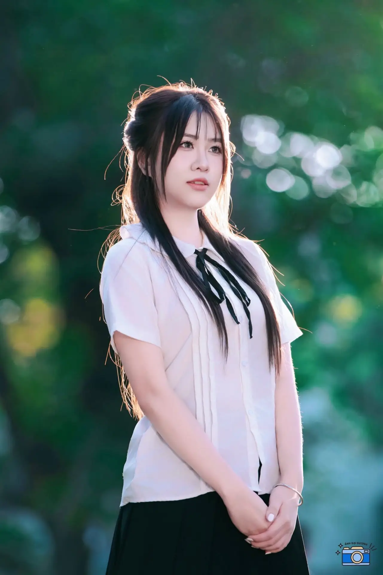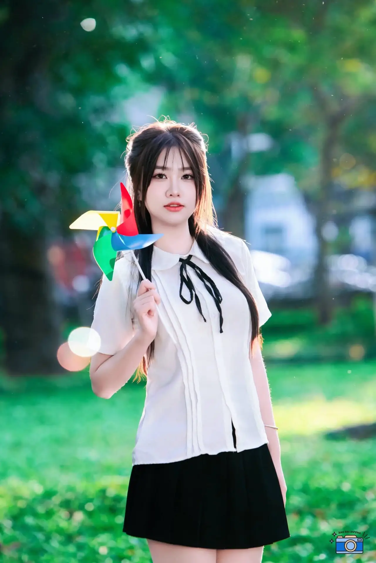This photograph captures a beautiful moment of a young girl with a radiant smile, exuding the pure and gentle beauty of youth. She wears a pristine white shirt paired with a black skirt, creating a familiar yet captivating school-style look. Soft afternoon sunlight filters through her hair, creating a magical, shimmering effect that further enhances her natural charm. In her hand, she holds a colorful pinwheel, a symbol of innocence, dreams, and cherished childhood memories. This image evokes a sense of peace, freshness, and positive energy, like an invitation to discover the pure and elegant beauty of Vietnamese girls.#VietnameseGirl #YouthfulBeauty #BrightSmile #PinwheelDreams #AsianBeauty #JK #JKUniform