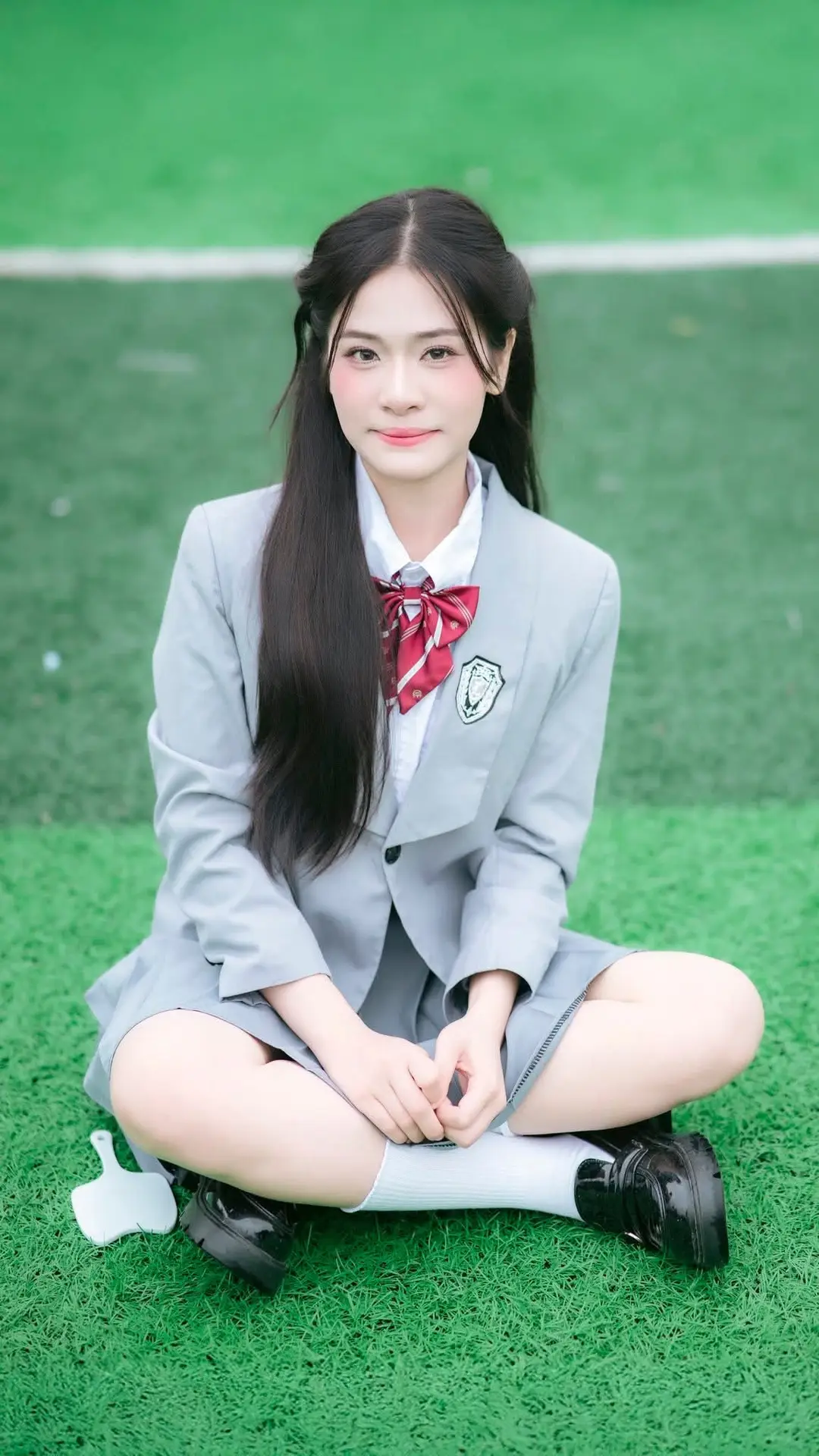 A youthful girl in a grey school uniform sits gracefully on lush green grass With a radiant smile and sparkling eyes she frames a beautiful moment with her hands seemingly capturing the essence of vibrant youth Her innocent energetic and lively charm as a schoolgirl is vividly portrayed evoking feelings of joy and serenity This image symbolizes the pure and endearing nature of student life a natural and emotional snapshot amidst the refreshing green surroundings#Schoolgirl #YouthfulVibes #SchoolUniform #GreenGrass #CuteGirl #JKUniform #JK