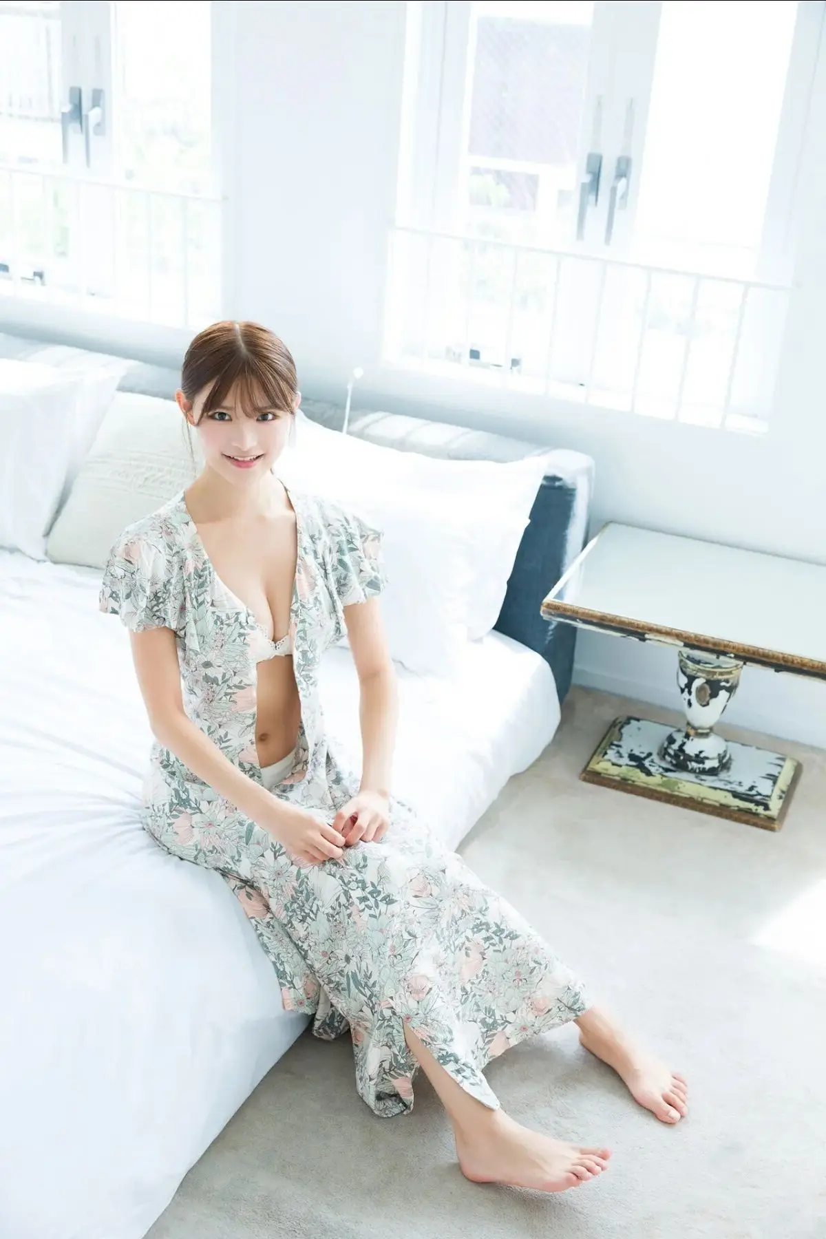 This captivating image beautifully portrays Yuka Kohinata (小日向ゆか), a radiant presence from the BRODY Digital Photo Book "Drenched in Love". Her serene gaze and gentle expression convey a sense of delicate charm and introspection. Dressed in a pristine white top with ethereal sheer sleeves, Yuka exudes an elegant simplicity that is both enchanting and refined. The softly blurred background skillfully draws attention to her captivating aura, making her the undeniable focal point. This photograph transcends a mere snapshot, offering a glimpse into a narrative of inner beauty, tranquility, and profound emotions. It invites viewers to delve deeper into the full collection, experiencing the emotional depth and artistic vision that Yuka Kohinata embodies.#YukaKohinata #JapaneseModel #BRODY #DigitalPhotobook #AsianBeauty