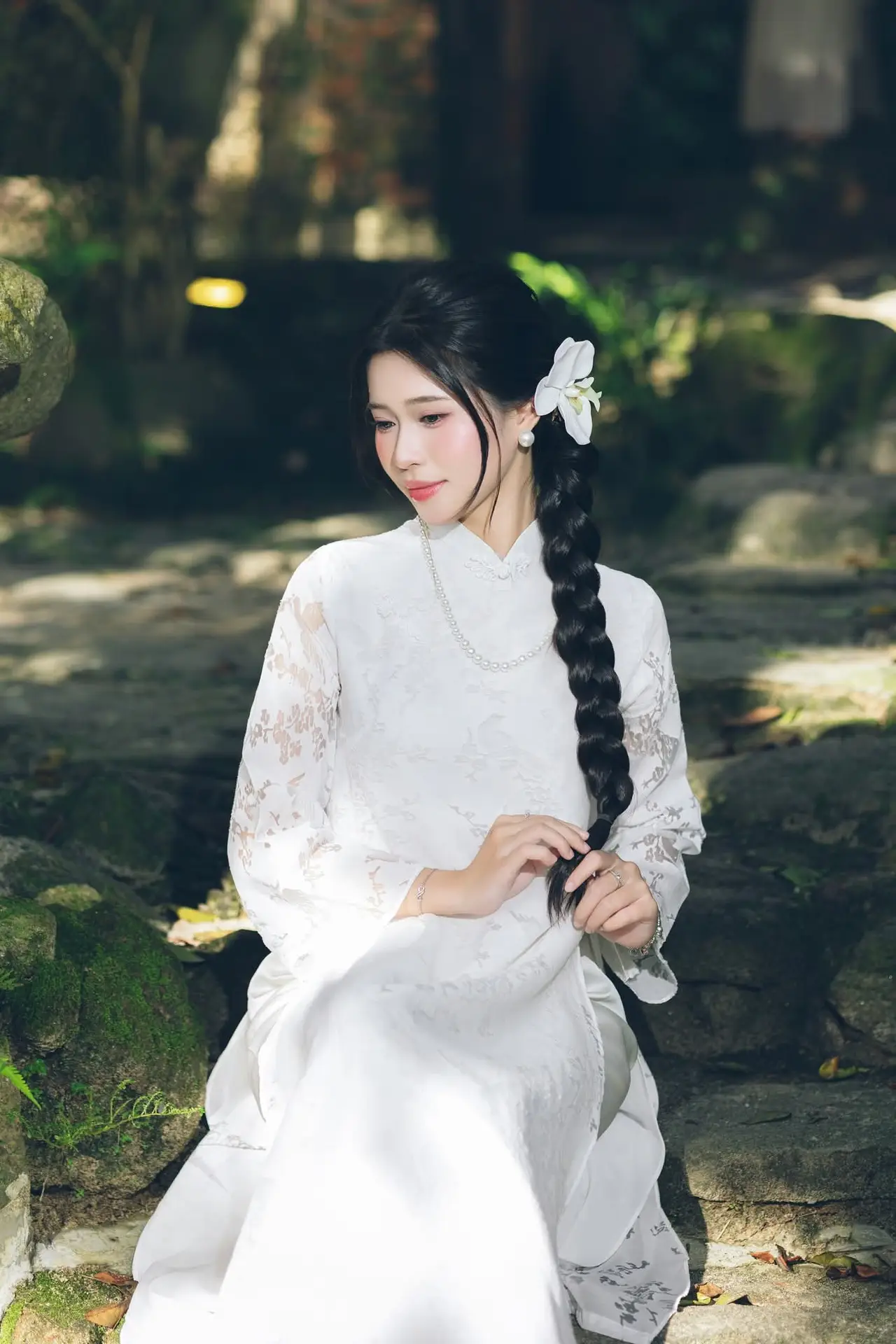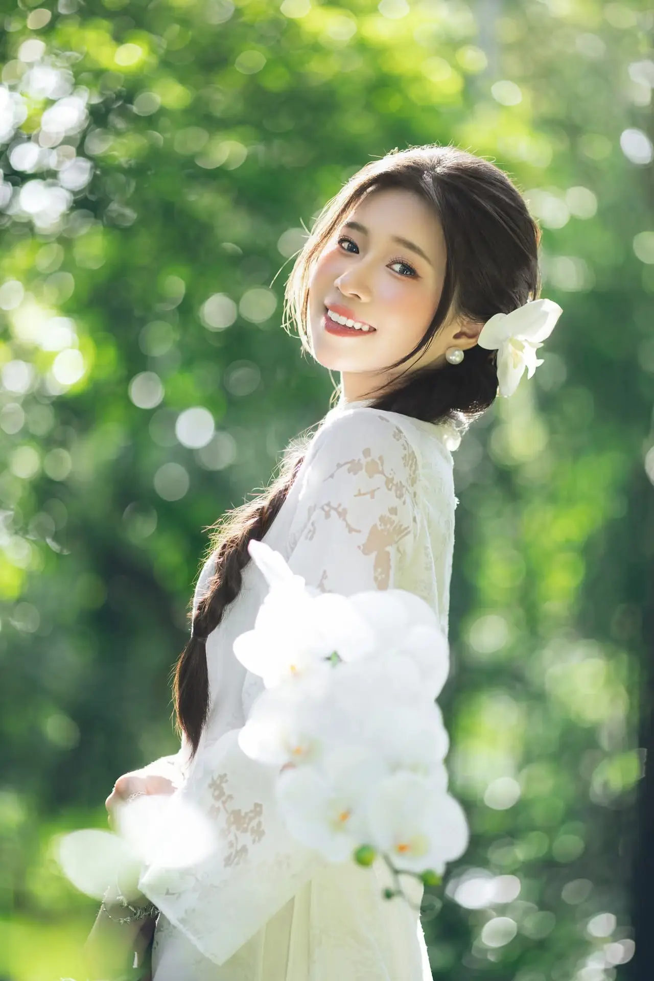 In image 1000026906 a beautiful young woman radiates an aura of elegance and gentle charm. She wears a pristine white lace dress featuring intricate details that gracefully enhance her slender figure. Her long hair is neatly braided cascading over her shoulder adding a touch of grace. A delicate white orchid adorns her hair while a bouquet of white orchids in her hand further emphasizes her pure beauty. Her bright smile and clear eyes reflect the freshness of an early morning. The lush green natural background perfectly complements her natural beauty creating a serene and poetic moment that captures the essence of youthful grace.#VietnameseGirl #WhiteLaceDress #WhiteOrchids #NaturalBeauty #ElegantPortrait