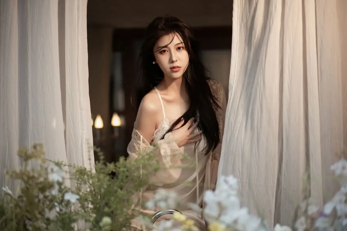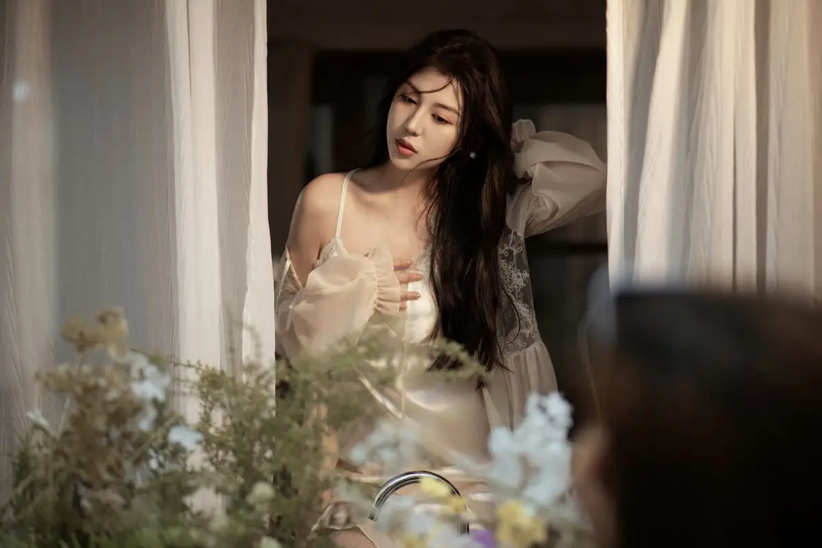 Immerse yourself in a dreamy world with Etsuko from the YiTuYu Vol 8580 collection. This captivating image portrays Etsuko's gentle and refined beauty as she gracefully wears a delicate silky lace nightgown. The soft glow of flickering candles creates a warm and romantic ambiance highlighting her luminous skin and alluring contours. Her sheer lace robe drapes elegantly over her figure exuding a discreet yet captivating sensuality. Etsuko’s pensive gaze suggests a moment of deep thought inviting viewers into her intimate space. This photograph is more than just an image it is an artistic piece that speaks of peaceful introspection and the profound inner beauty of a woman.#Etsuko #YiTuYu #LaceLingerie #SensualBeauty #SoftLight