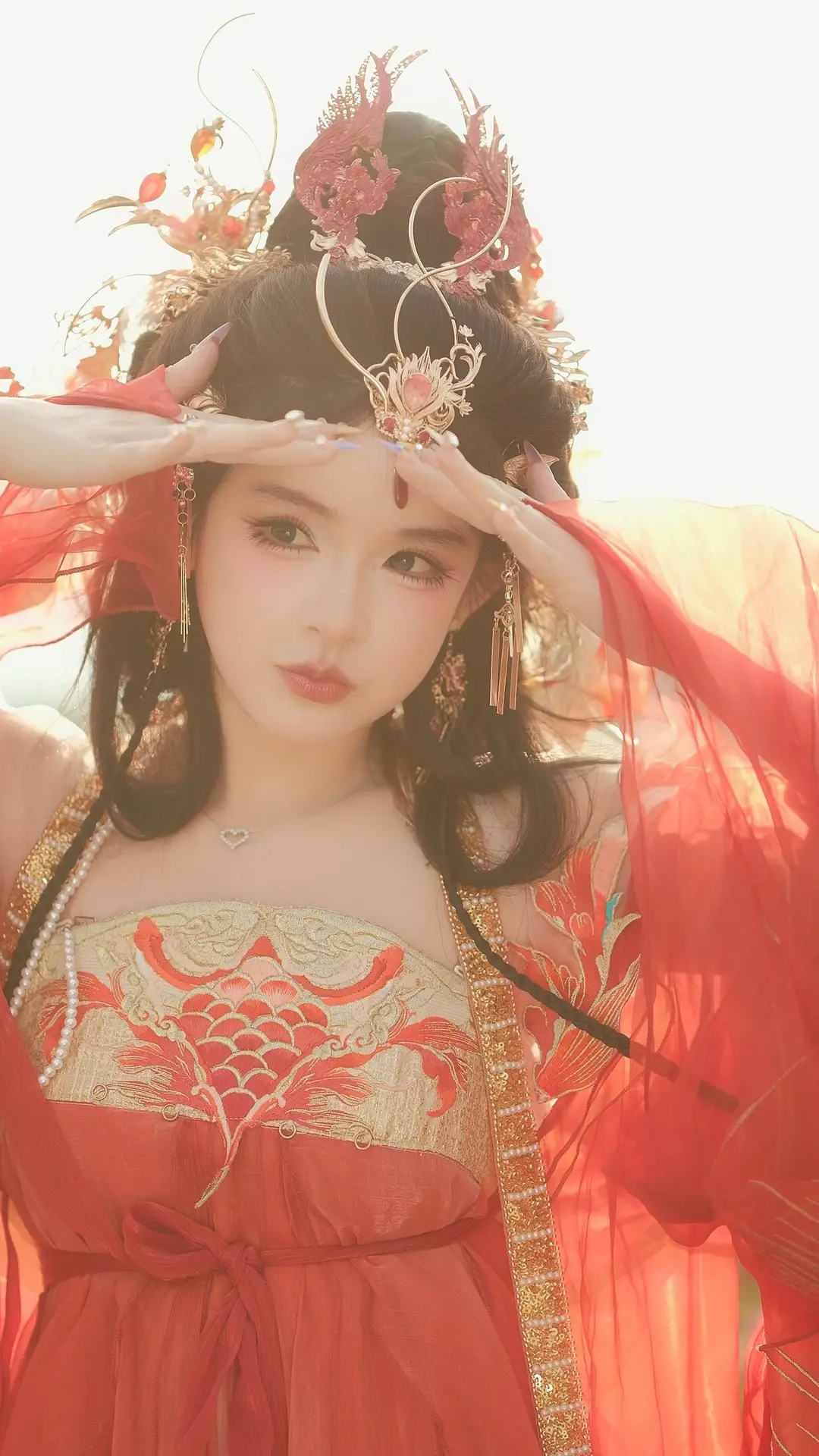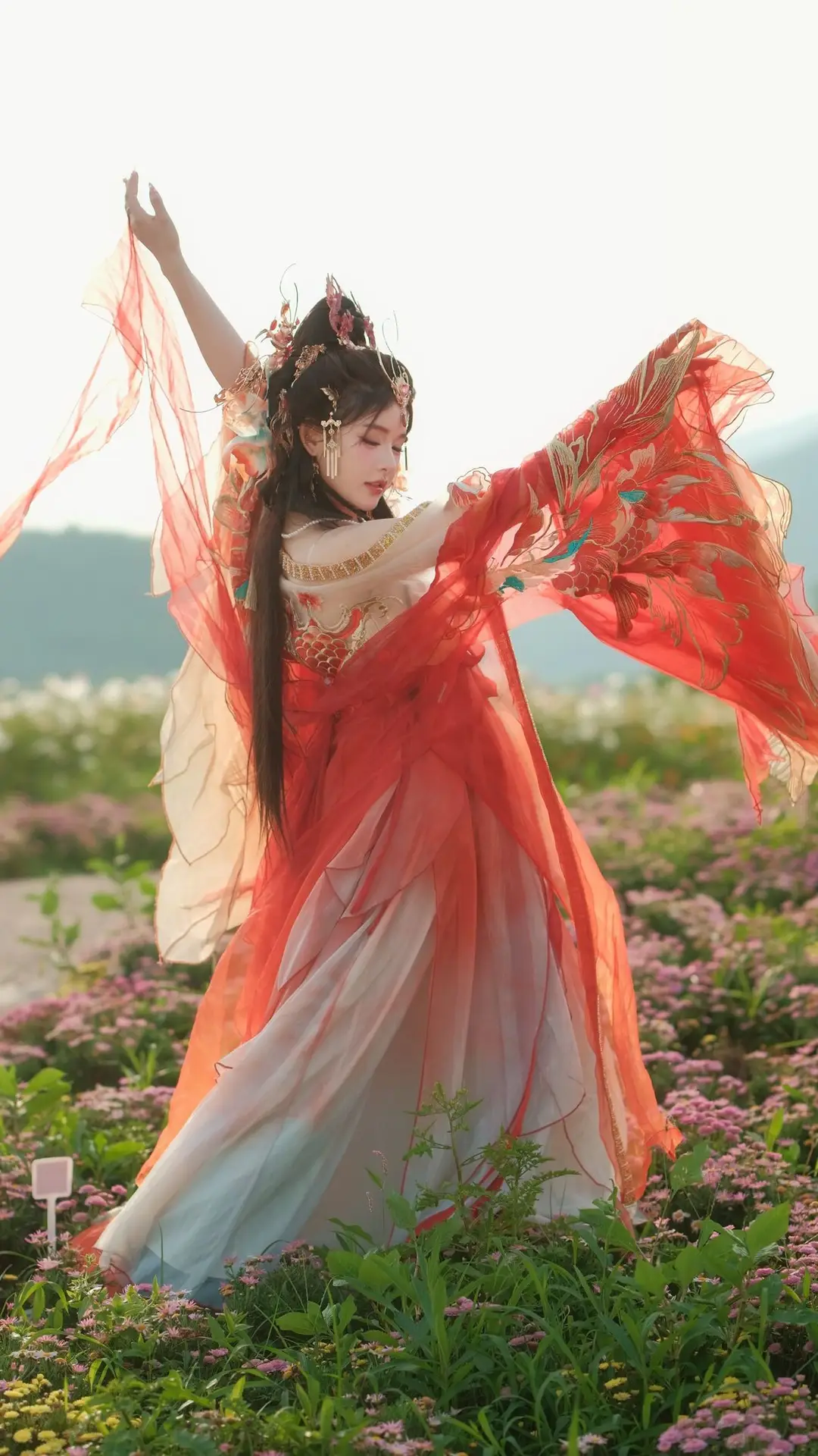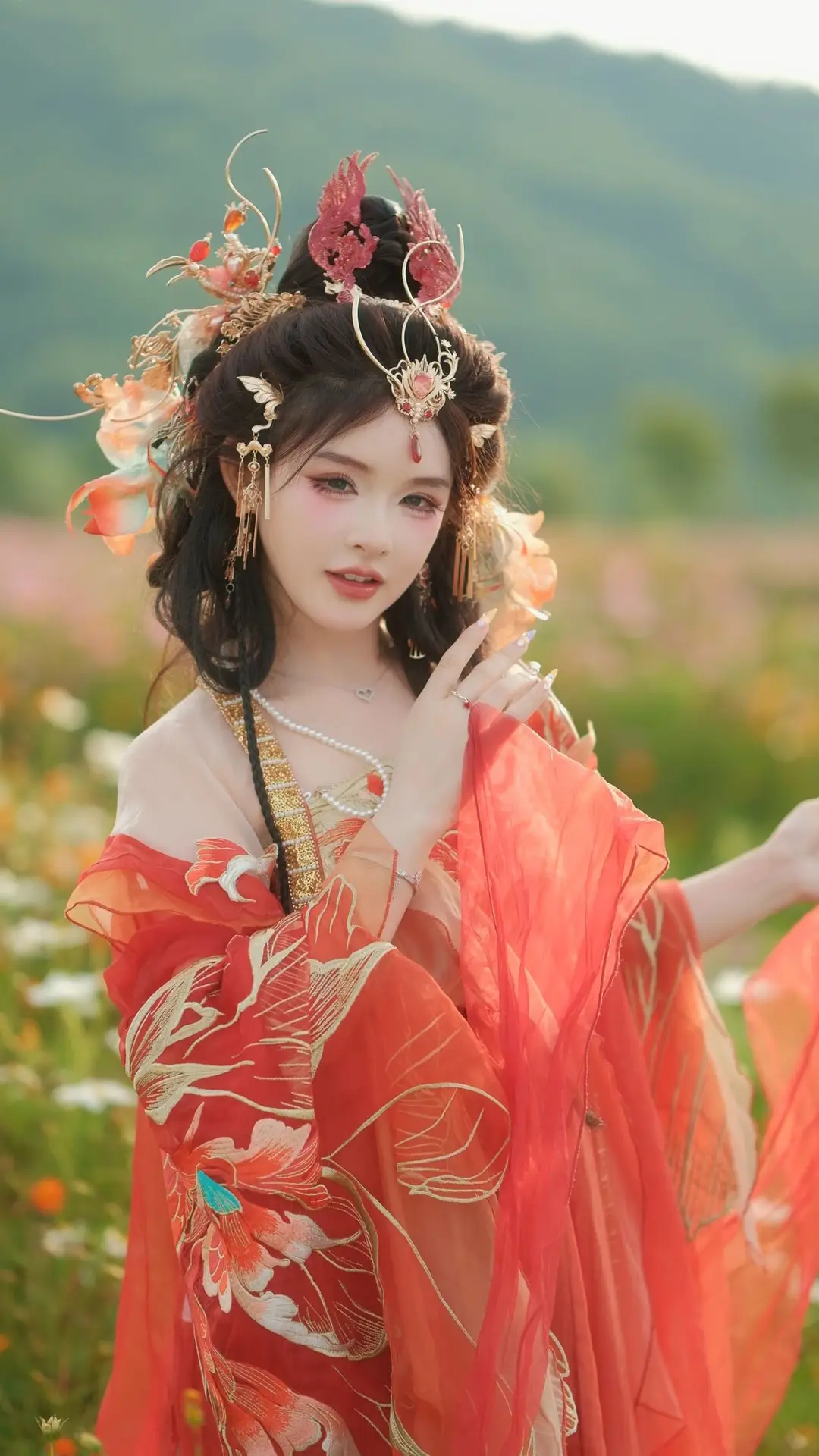 Immerse yourself in the ethereal and captivating beauty of Xiao Shang Guan in this exquisite YiTuYu Vol.8642 collection. Adorned in a vibrant, flowing red traditional dress, she appears as a celestial maiden gracefully situated amidst a vast field of Gesang flowers. Each delicate Gesang bloom, symbolizing happiness and love, beautifully complements Xiao Shang Guan's gentle and graceful demeanor. Her dreamy gaze, coupled with the traditional fan she holds, paints a vivid, poetic tableau where art and nature seamlessly intertwine. This collection transcends mere photographs, acting as an 'art language' that narrates the mystical allure of Oriental beauty, evoking a profound sense of peace and admiration in every viewer.#XiaoShangGuan #Hanfu #TraditionalDress #CosmosFlowers #OrientalBeauty