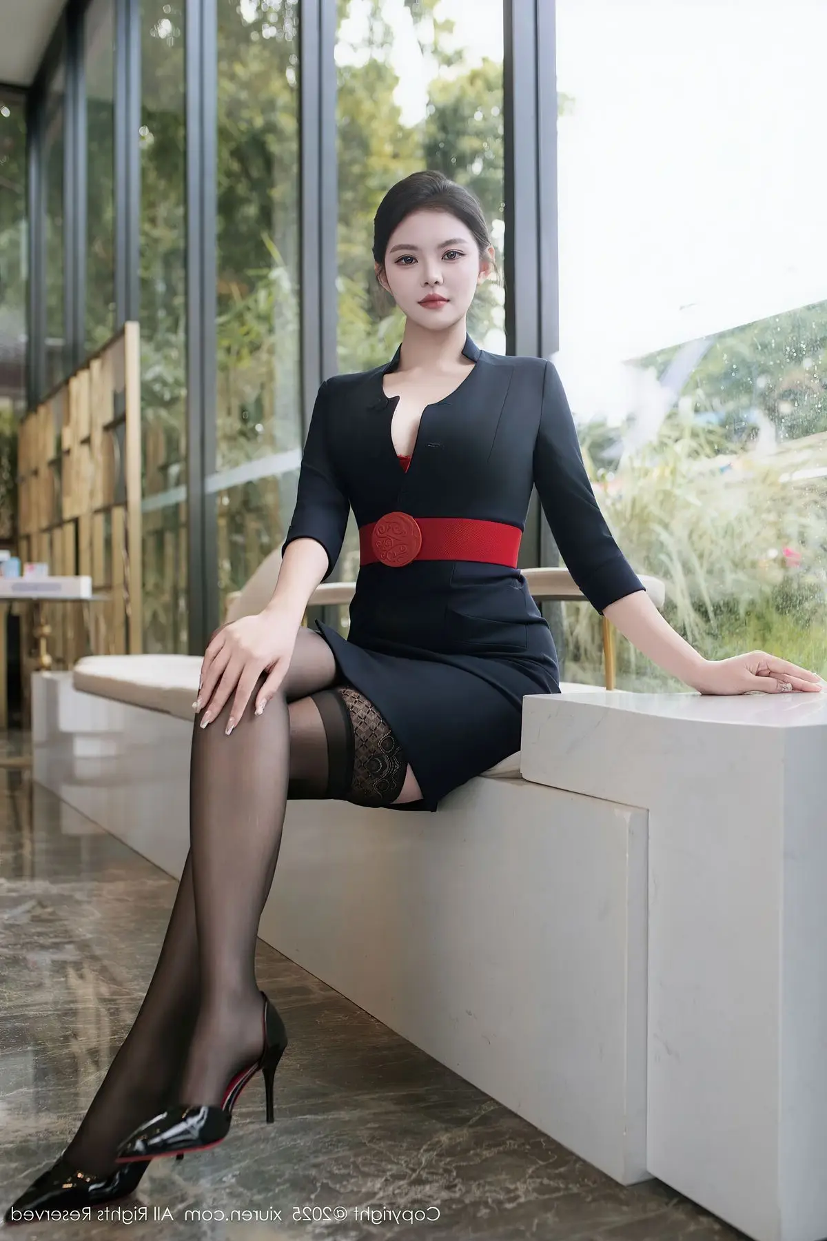 In the captivating XiuRen No.10580 photo collection, model Song Guo Er transforms into an alluring female pilot, exuding both professionalism and undeniable charm. She sits confidently on a wooden table, showcasing her long, slender legs elegantly adorned in sheer black stockings and stylish high heels. The form-fitting black pilot uniform accentuates her graceful curves, projecting an aura of power and sophistication. Song Guo Er's mesmerizing gaze and subtle smile further enhance her irresistible appeal. The simple backdrop of pristine white curtains beautifully highlights her elegant yet subtly provocative beauty. This image is part of the extensive XiuRen No.10580 series featuring Song Guo Er, where she impressively demonstrates her versatility and captivating presence, sure to leave viewers enchanted.#SongGuoEr #XiuRen #Pilot #Uniform #SexyModel #AsianBeauty #OL #OfficeLady