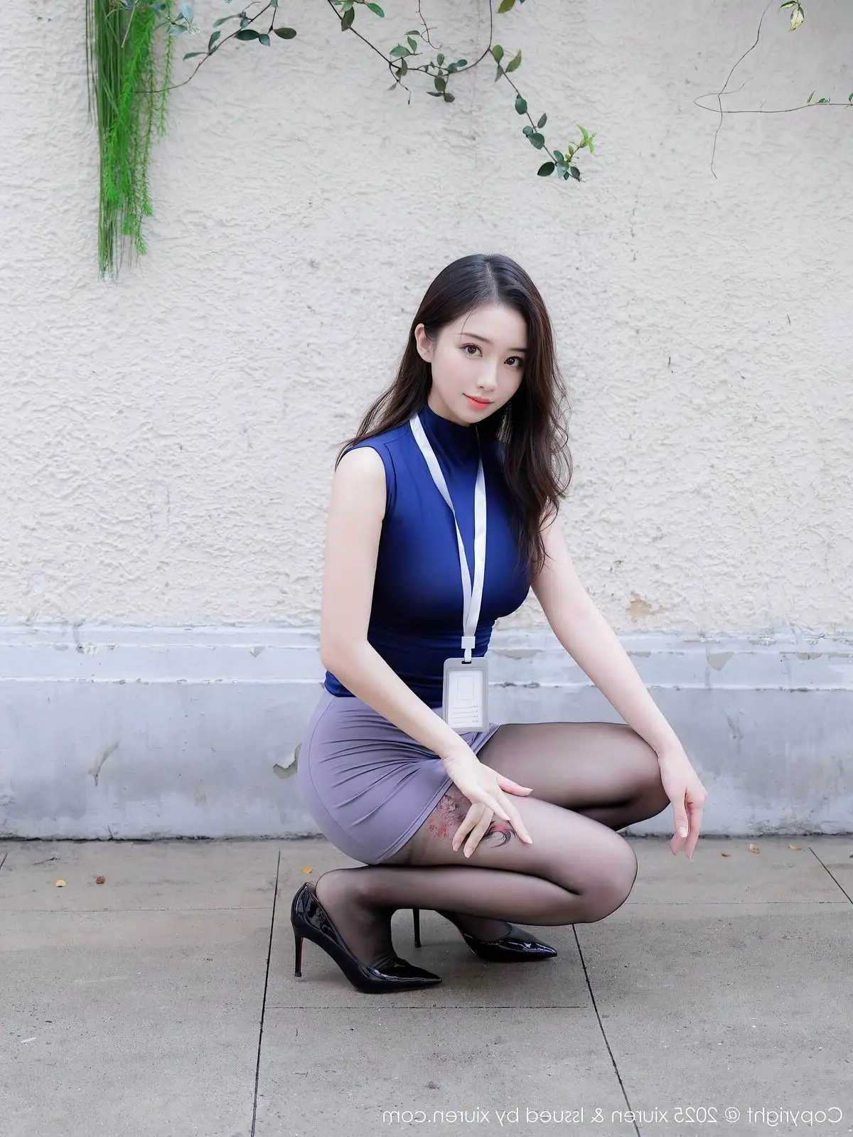 In the XiuRen No.10577 photo collection, model Nan Zhi captivates all eyes with her elegant beauty and confident demeanor. She dons a modern office-inspired outfit featuring a sophisticated navy blue turtleneck top, a chic grey mini skirt, and alluring black sheer pantyhose, accentuating her balanced figure and long graceful legs. Her dynamic pose, while maintaining a charming allure, showcases professionalism and a unique charisma. Nan Zhi's captivating gaze and gentle smile invite viewers to explore more of this fascinating fashion style. This is a must-see collection for anyone who appreciates the blend of office elegance and subtle sophisticated allure.#NanZhi #XiuRen #OfficeFashion #PantyhoseStyle #ModernElegance