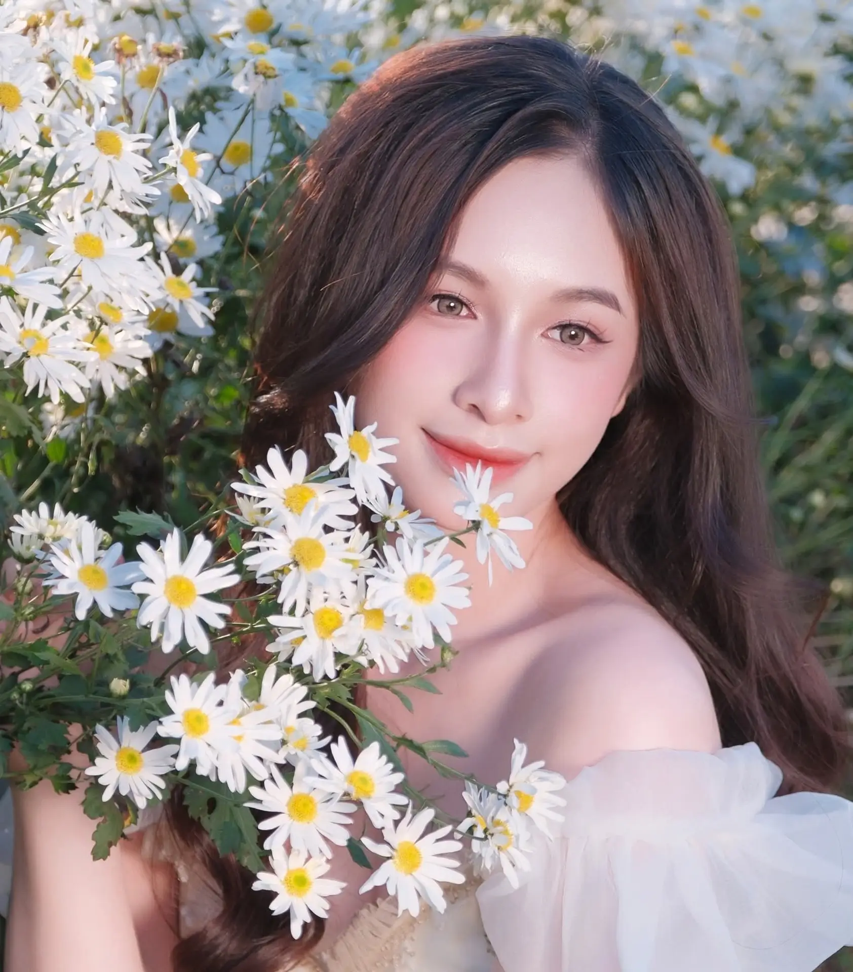Enchanting Muse in White Chrysanthemum Field: A Portrait of Grace and Natural Beauty.
