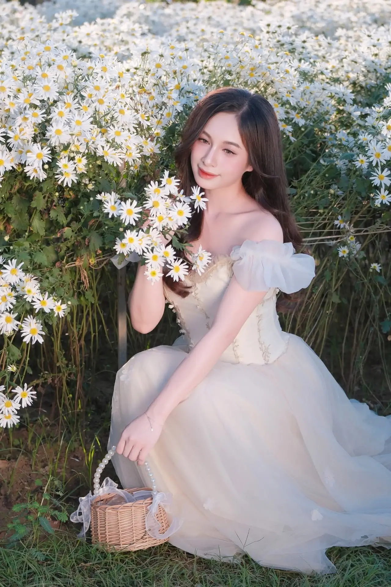 This stunning photograph captures a young woman radiating gentle elegance, seated amidst a vast field of pure white chrysanthemums. Her soft cream-colored dress, with its delicate details, perfectly complements the pristine natural setting, making her appear like a muse from a fairy tale. Her dreamy gaze, subtle smile, and flowing hair create a romantic and poetic scene that captivates the heart. Holding a small woven basket, she adds a touch of rustic charm to her graceful presence. This image is more than just a picture; it's a harmonious blend of human purity and the serene beauty of nature, evoking feelings of peace tranquility and inspiration.#WhiteChrysanthemums #ElegantBeauty #NaturePortrait #DreamyGirl #FlowerField