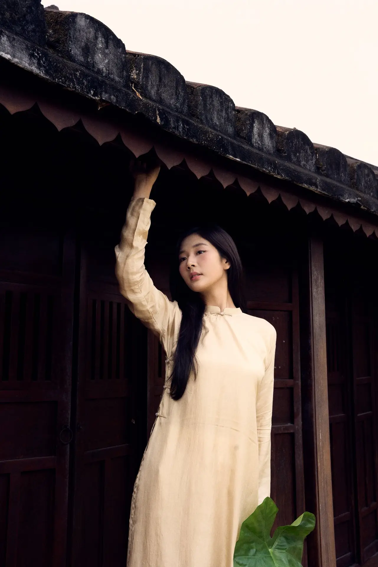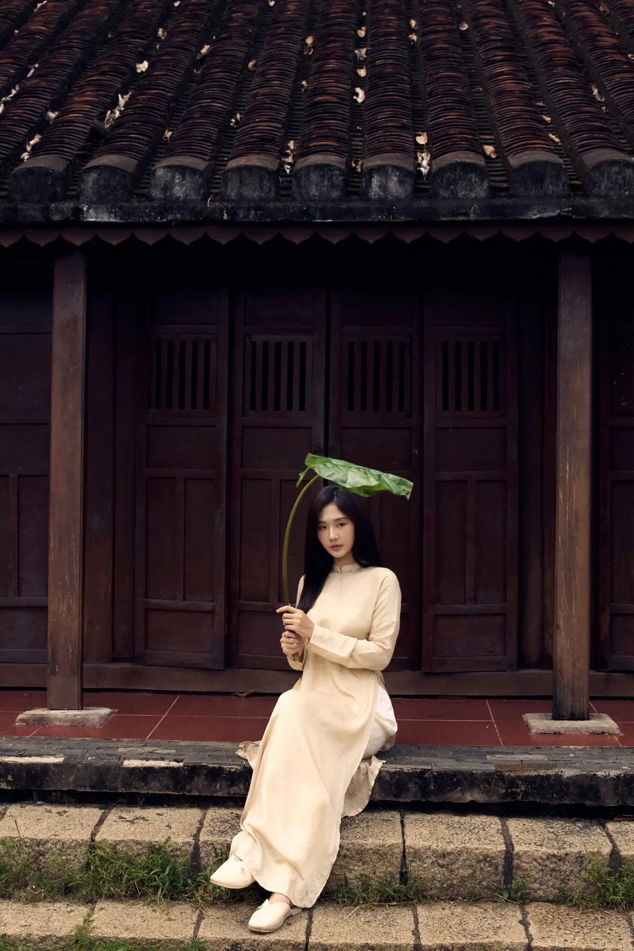 This stunning photograph captures a Vietnamese girl gracefully posing in a traditional cream-colored Ao Dai against the backdrop of an ancient house. The image beautifully conveys the gentle and elegant charm characteristic of Vietnamese women. Every detail from the moss-covered tiled roof to the solemn wooden doors evokes a rich and long-standing cultural heritage. The girl holding a green leaf in her hand adds a delicate natural touch blending harmoniously with the antique setting. This is more than just a moment; it is a celebration of traditional beauty and the enduring cultural spirit of Vietnam. The picture invites viewers to explore the historical depth and serene charm of ancient Vietnamese architecture.#AoDai #PrettyGrils #VietnameseCulture #TraditionalVietnam #VietnamBeauty #AncientArchitecture